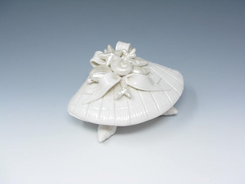 Vintage White Ceramic Oyster Shell Shaped Box with Ceramic Shells and Ribbons