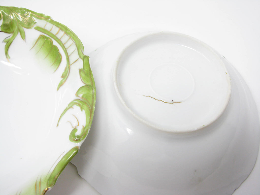 Antique Art Nouveau small white porcelain bowls with textured design and brightly hand-painted green and gold rim. Set includes 5 bowls.