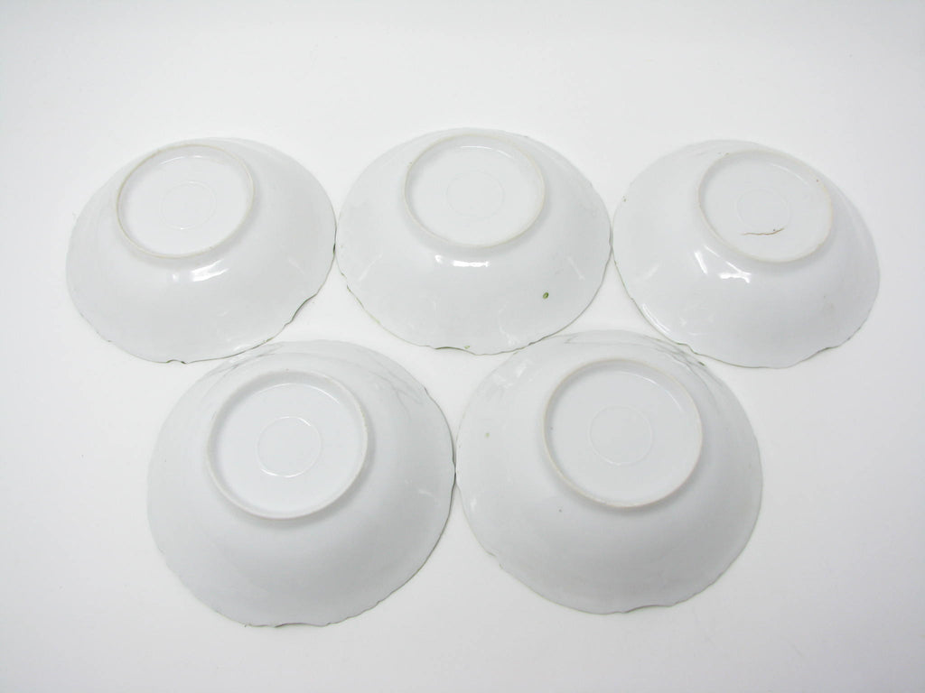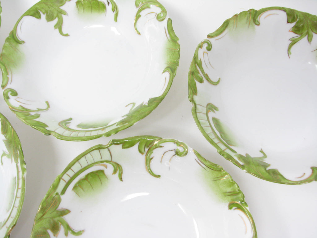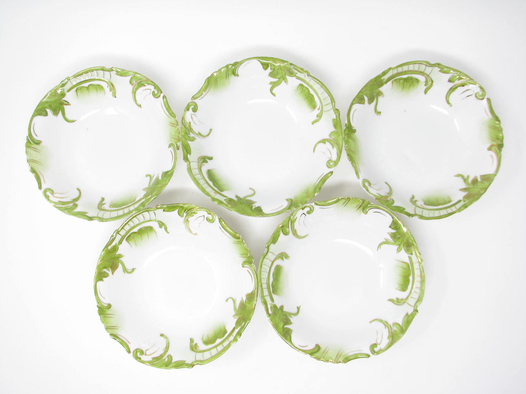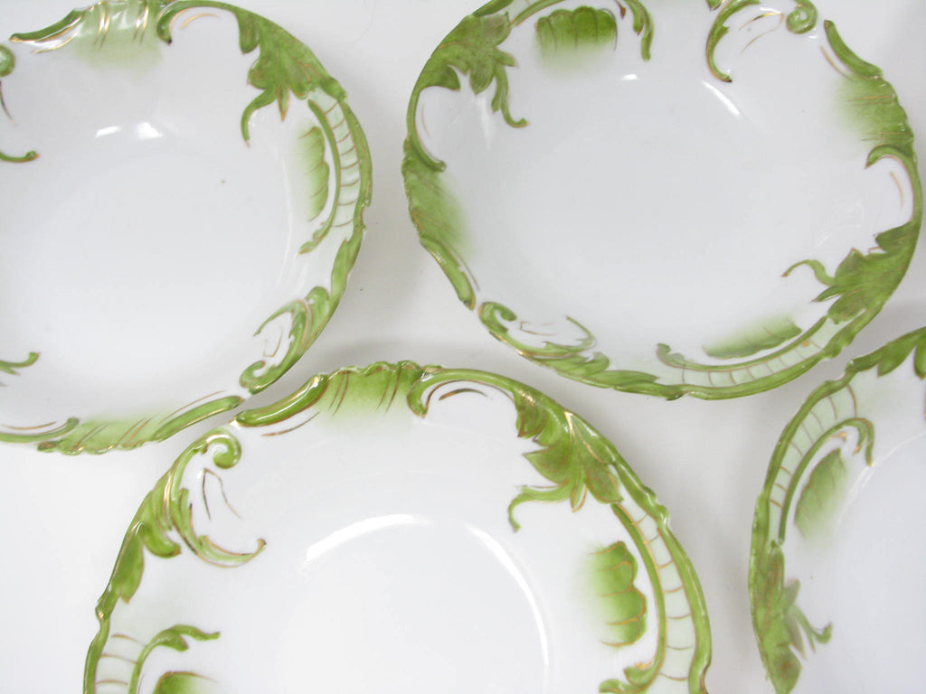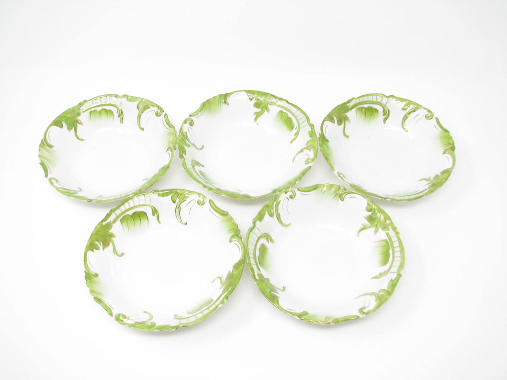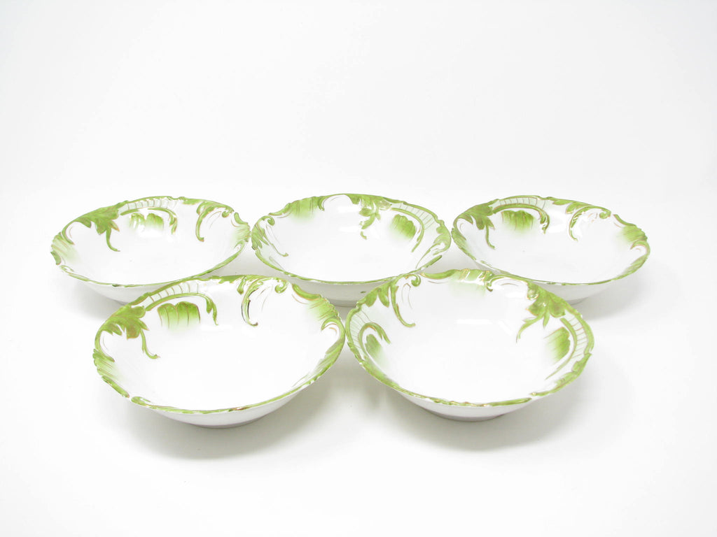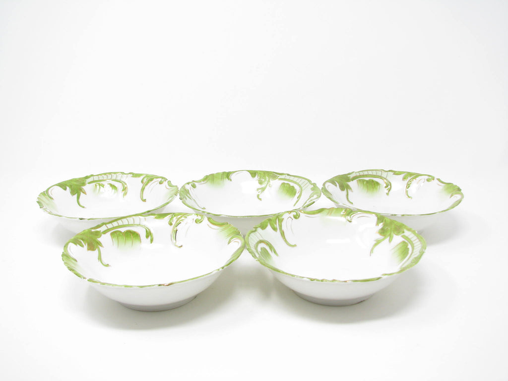 Antique Small White Porcelain Bowls with Textured and Hand-Painted Art Nouveau Green Gold Design - 5 Pieces