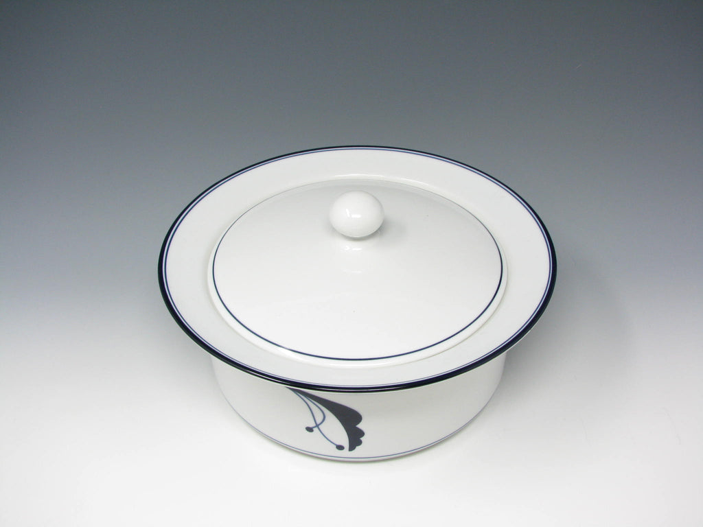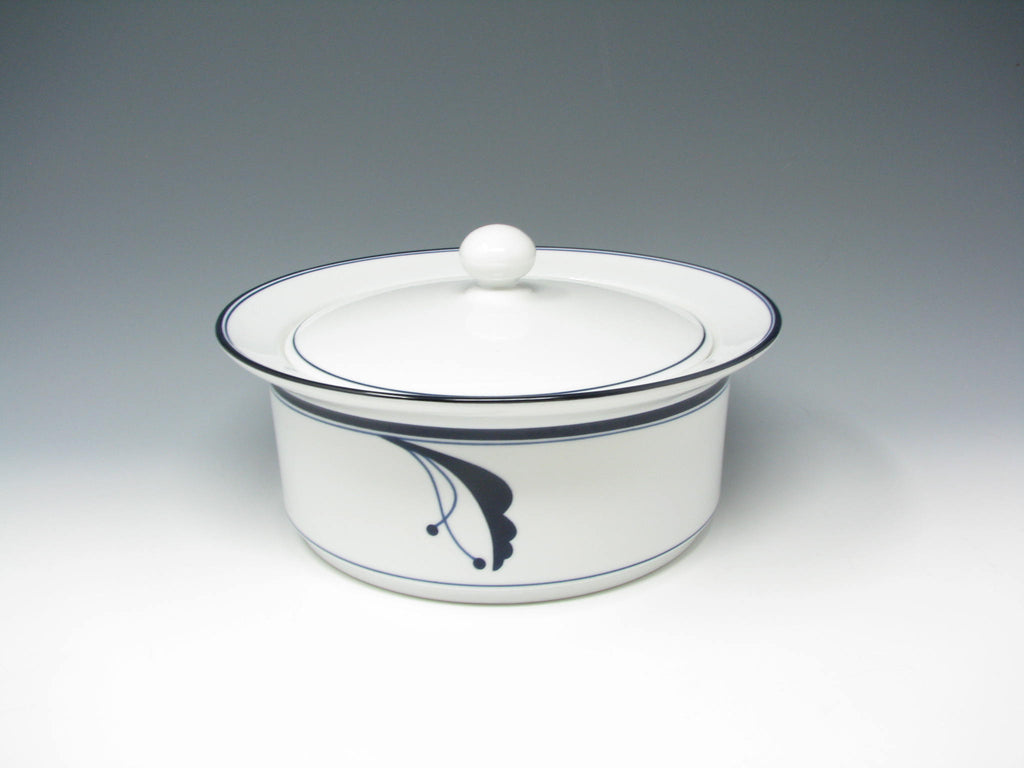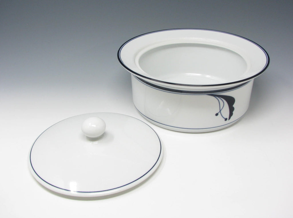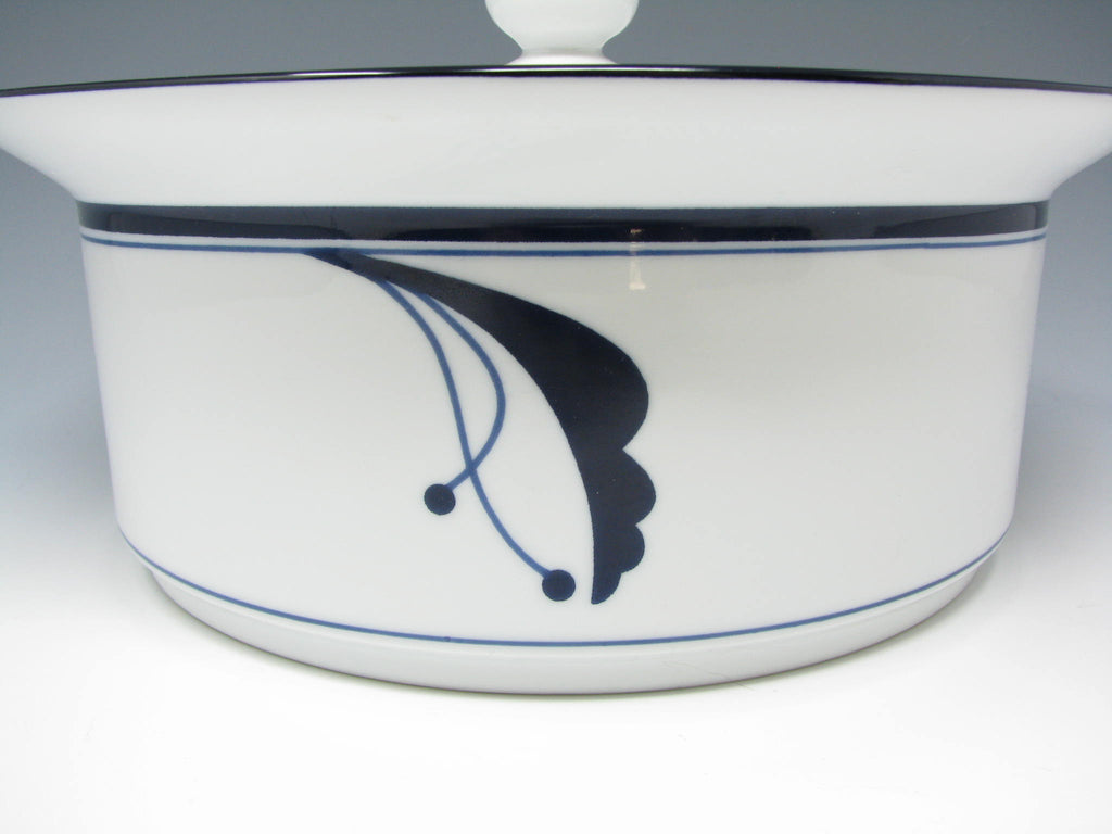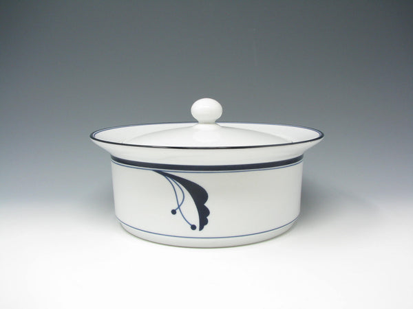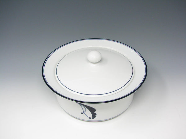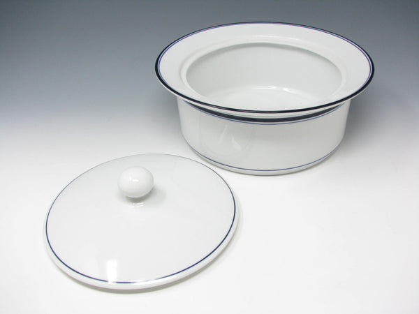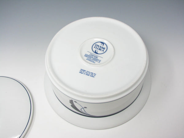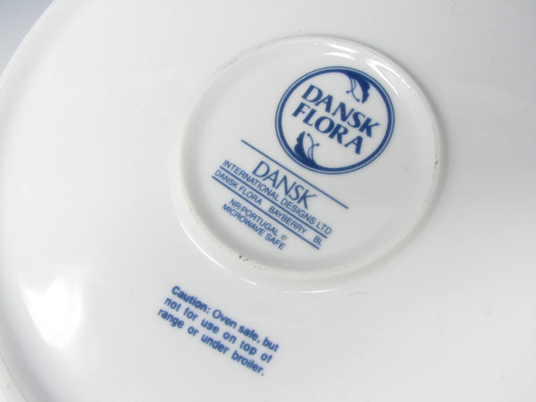 Vintage Dansk Bayberry Blue round lidded porcelain baking or casserole dish with blue leaves and berries decoration. Made in Portugal.