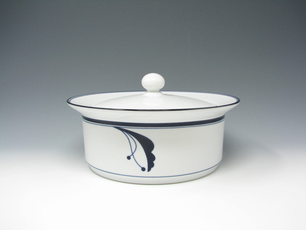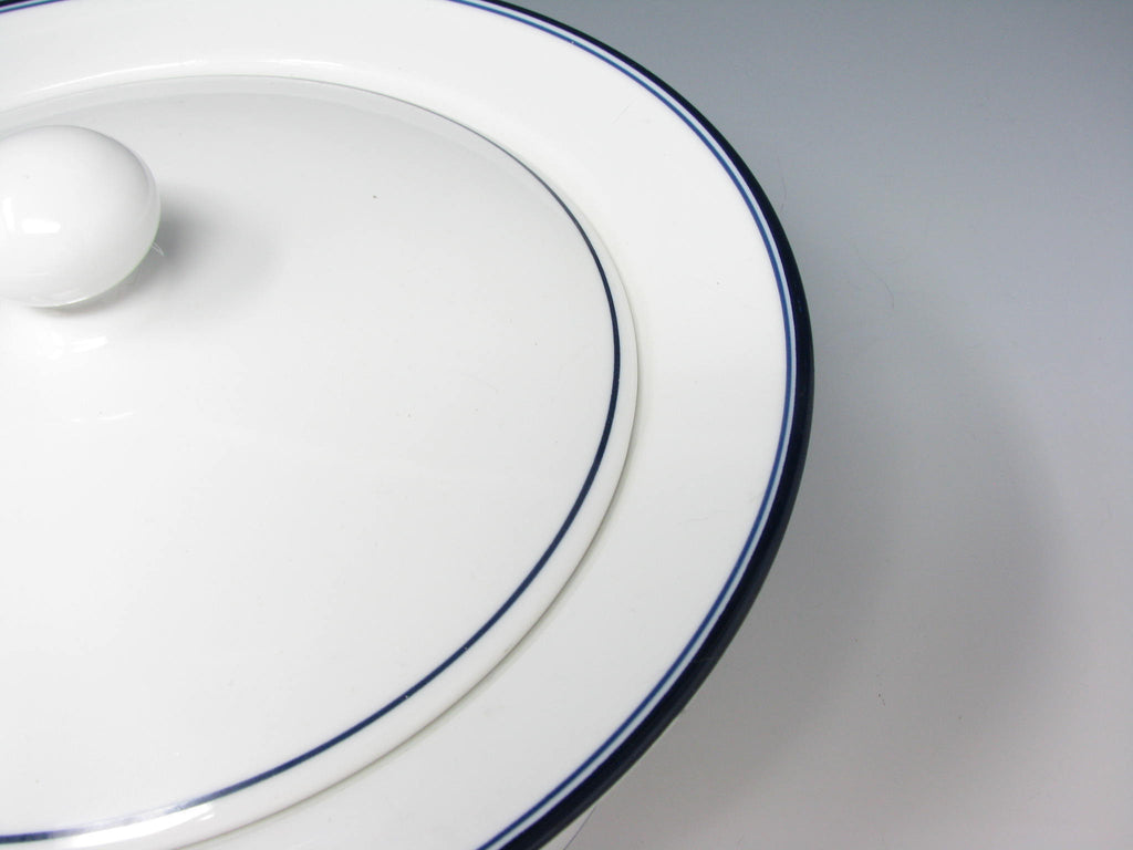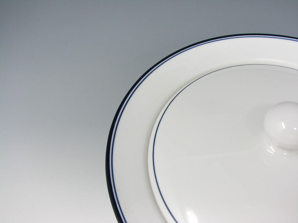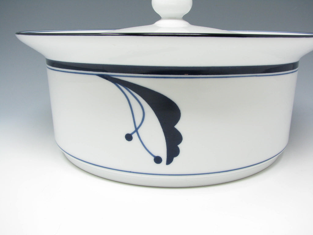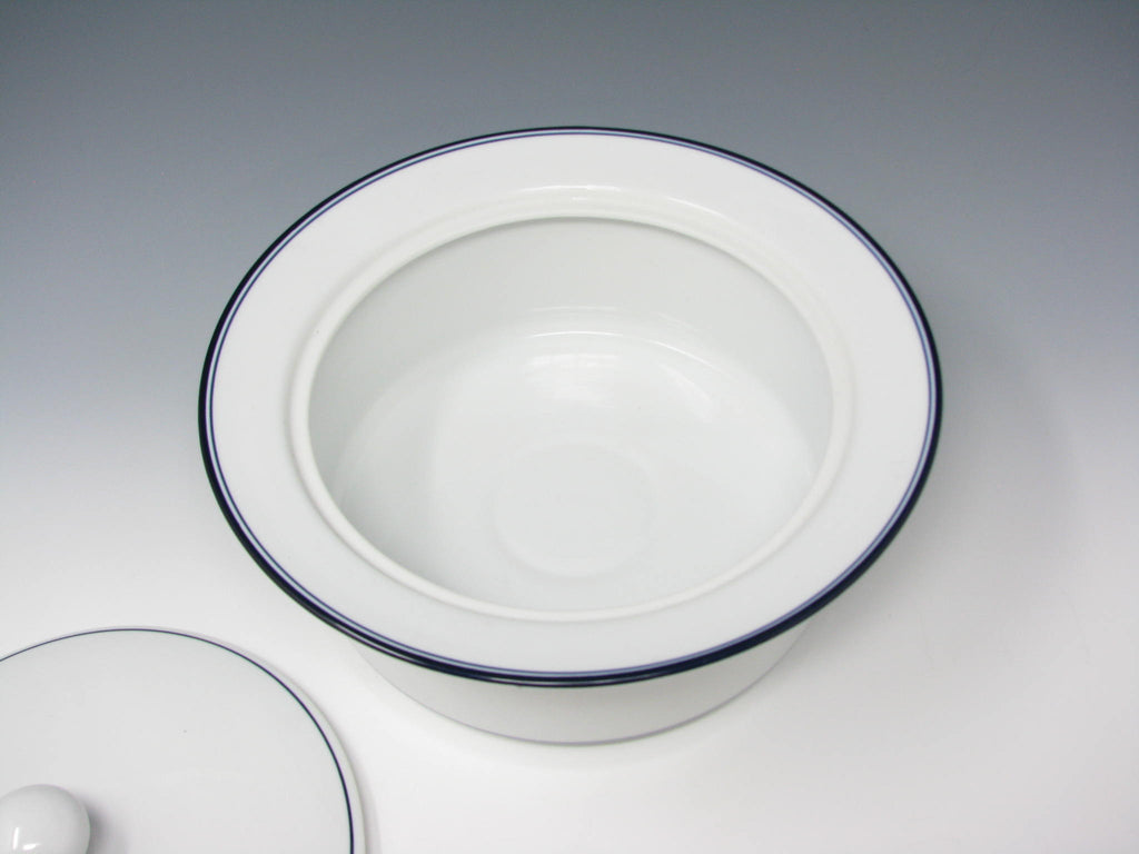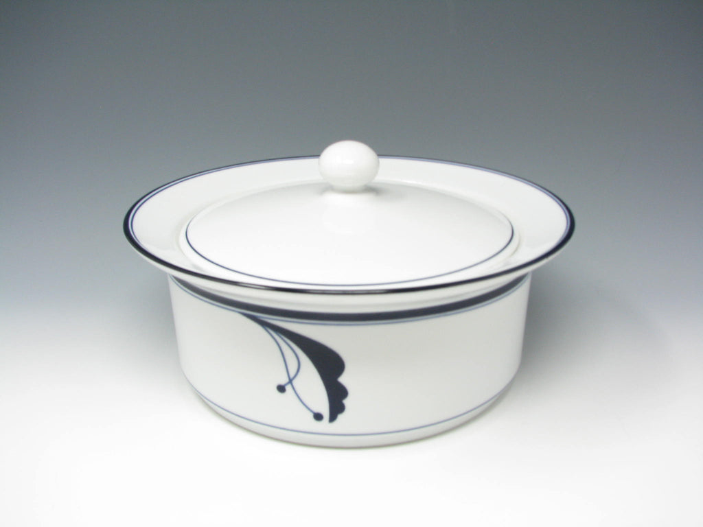 Vintage Dansk Bayberry Blue round lidded porcelain baking or casserole dish with blue leaves and berries decoration. Made in Portugal.