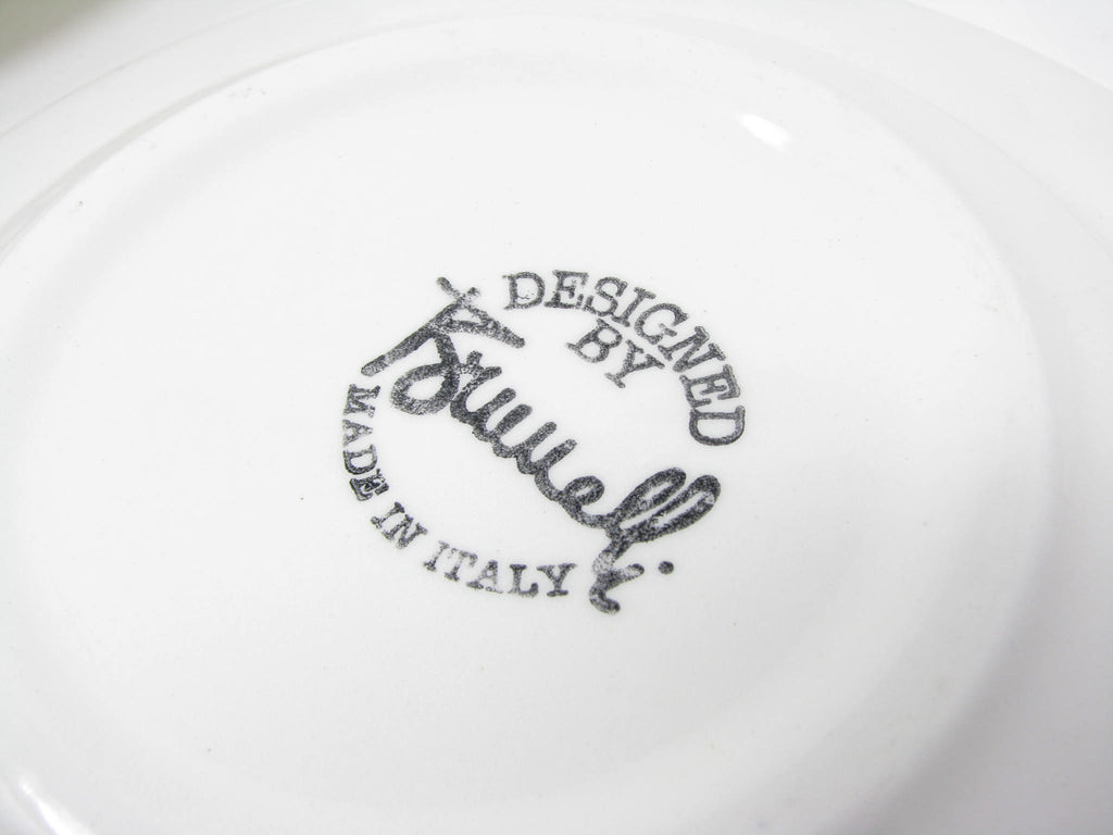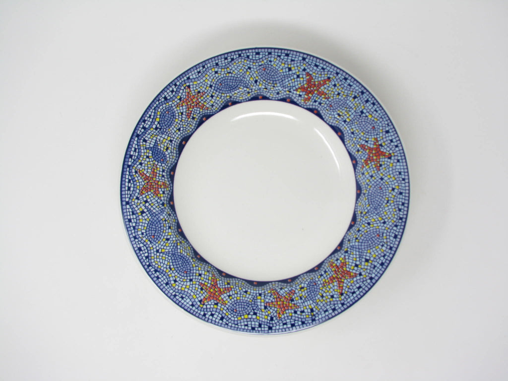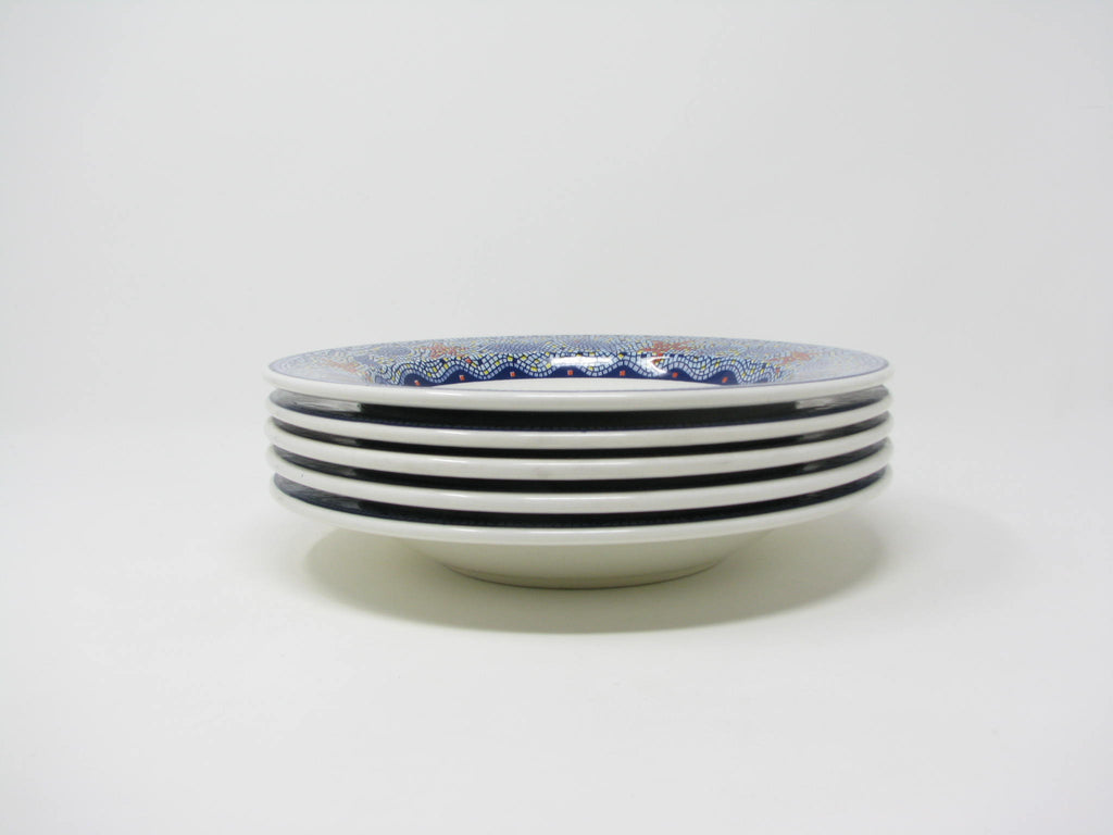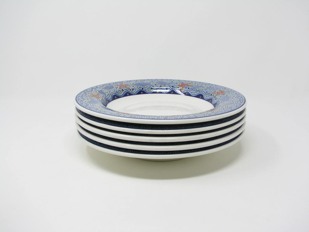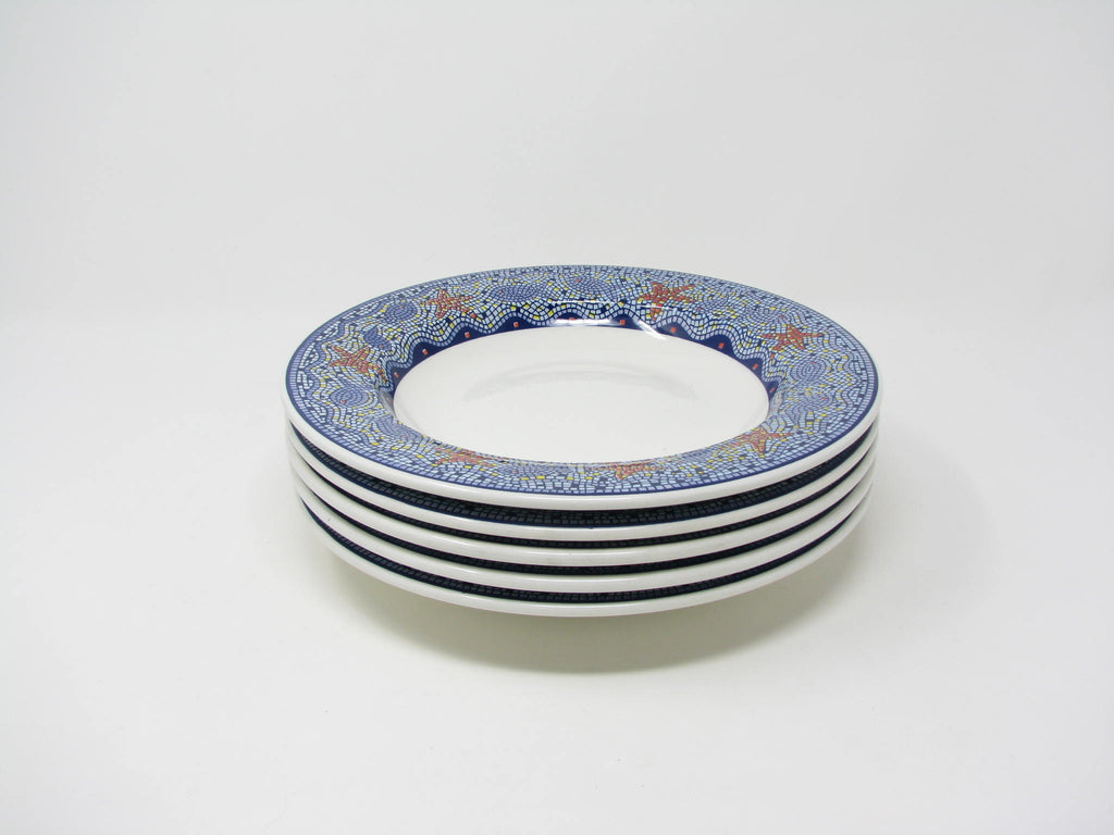 Vintage Brunelli Italy ceramic rimmed bowls with mosaic fish and starfish pattern on rim. Set includes 5 rimmed bowls.
