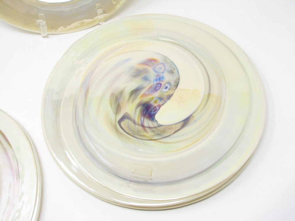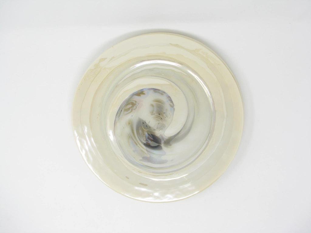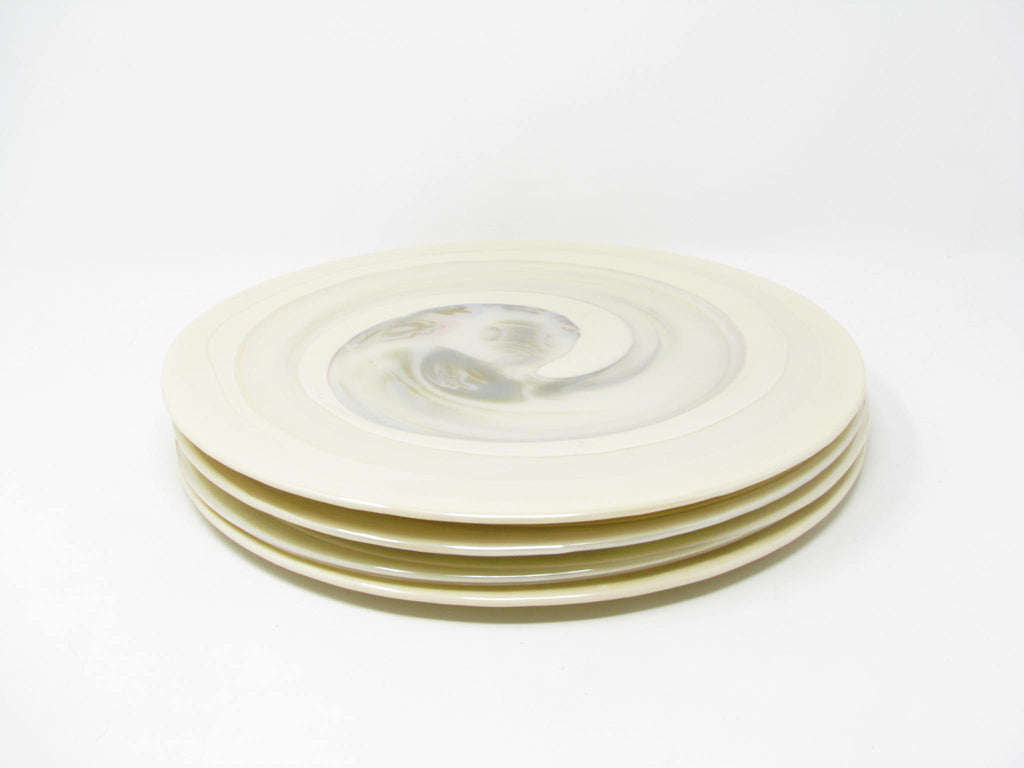 Yalos Casa Murano modern iridescent / pearlescent ivory art glass chargers or decorative plates with subtle swirl pattern. Each plate hand-crafted and unique. Maker's mark on bottom. Set includes 4 charger plates.