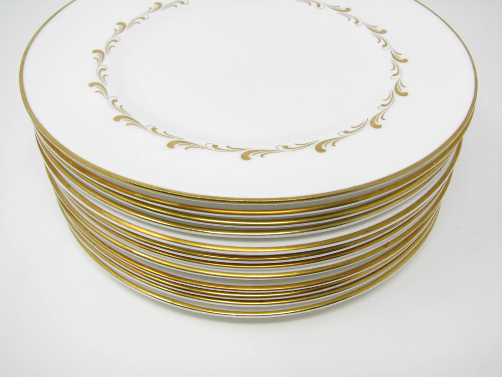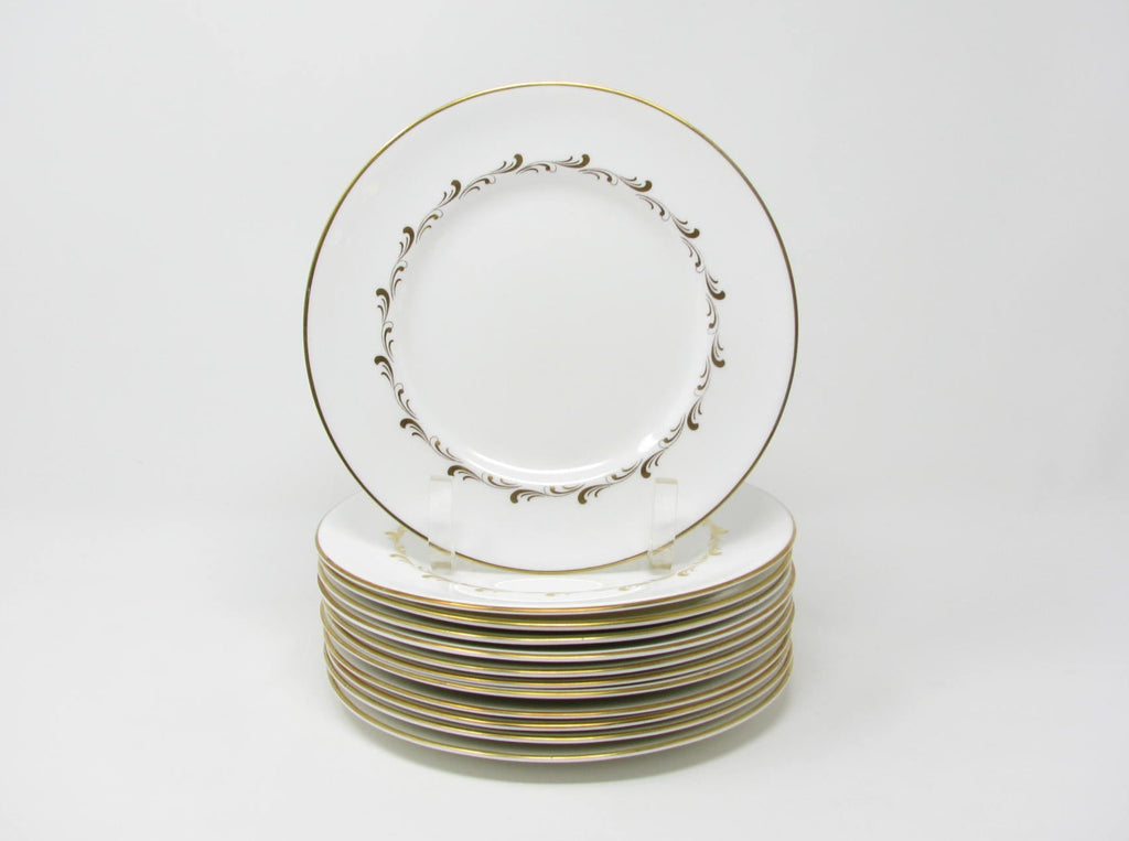 Vintage Royal Doulton Rondo white salad plates with gold scrolls and trim. Set includes 12 salad plates.