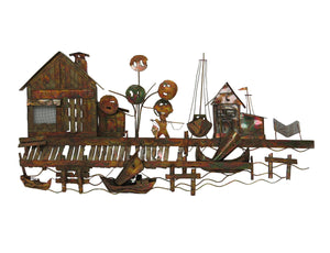 Vintage Curtis Jere Style Torch Cut Copper Wall Sculpture of a Boat Dock Scene