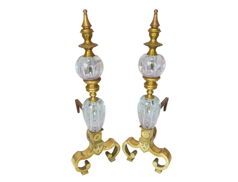 Vintage Polished Brass Andirons With St Clair Glass Globes Infused With Stylized Pink Flowers - a Pair