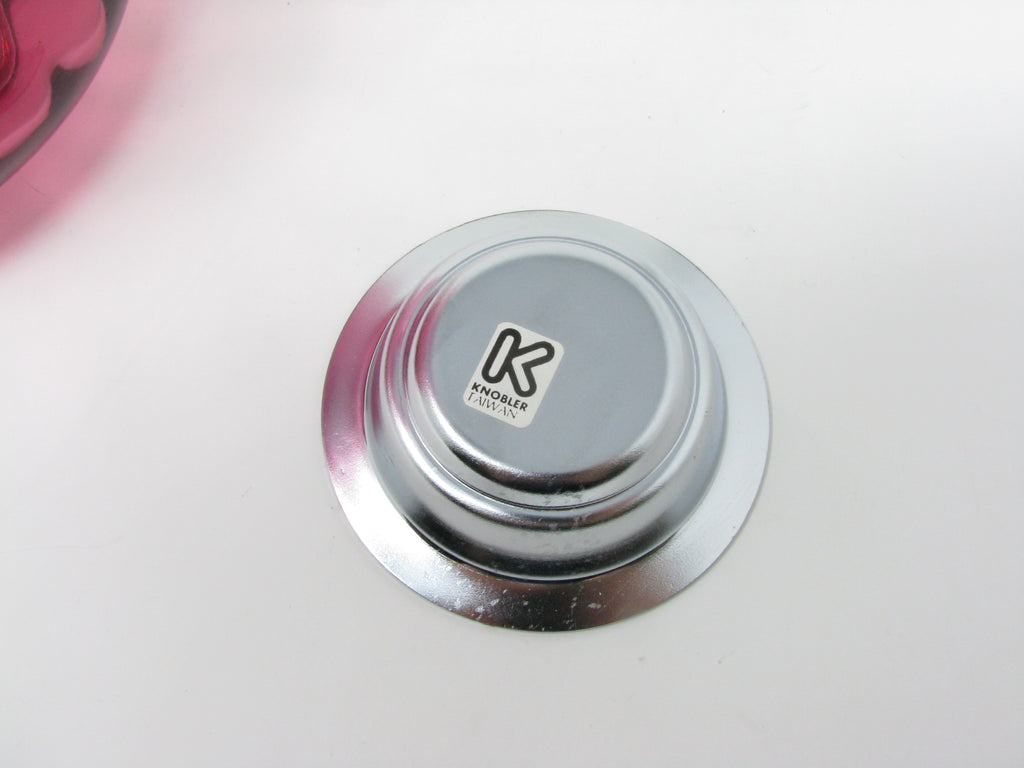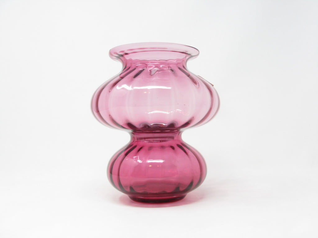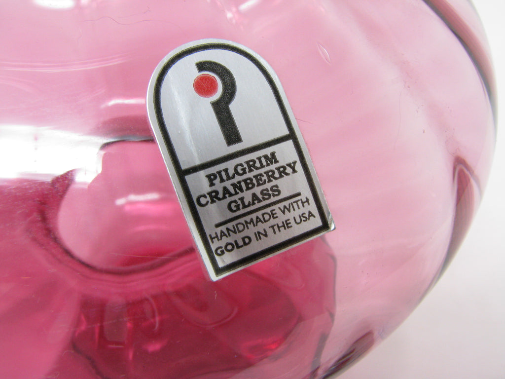 The original tag states the glass was made with gold. In the 1960s, Pilgrim's plant manager, Karel Konrad, figured out how to reliably and predictably replicate the look of cranberry glass. While popular during the Victorian Era, it had fallen out of favor due to its high cost and temperamental nature. Cranberry glass is produced by adding gold chloride (sometimes described as "gold salts") to a batch of molten glass. At their best, the resulting blown-glass objects have the color of rubies.