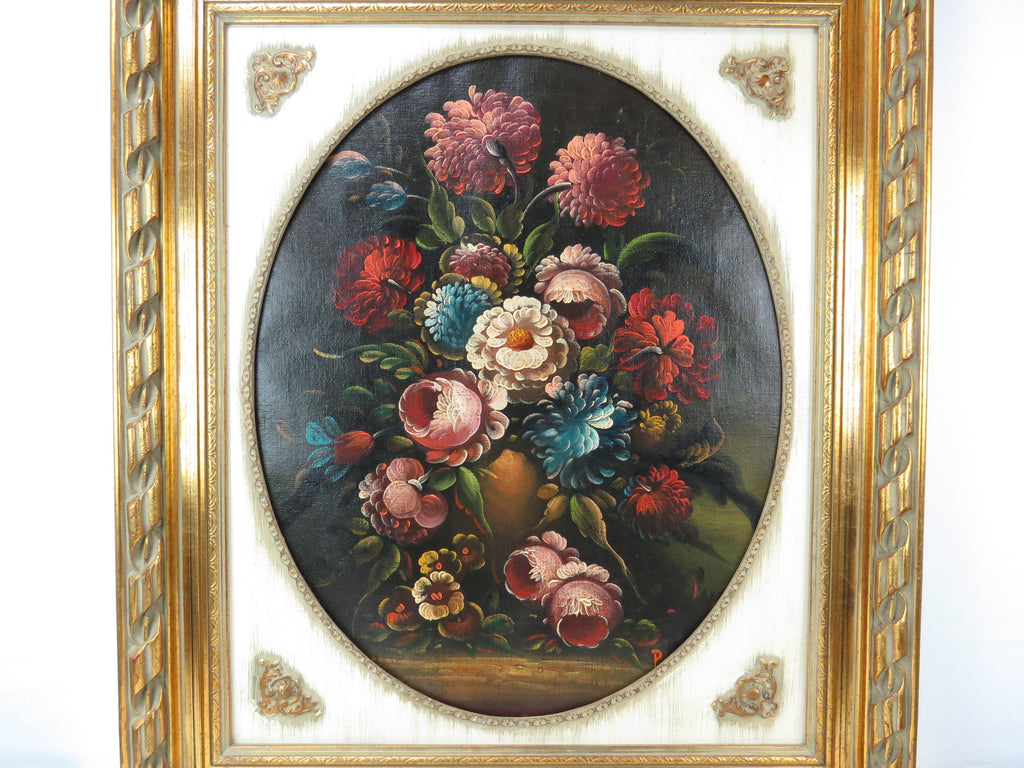 Dutch school 19th century old master style still life. Oil on canvas framed with an oval opening. Artist signed lower right.