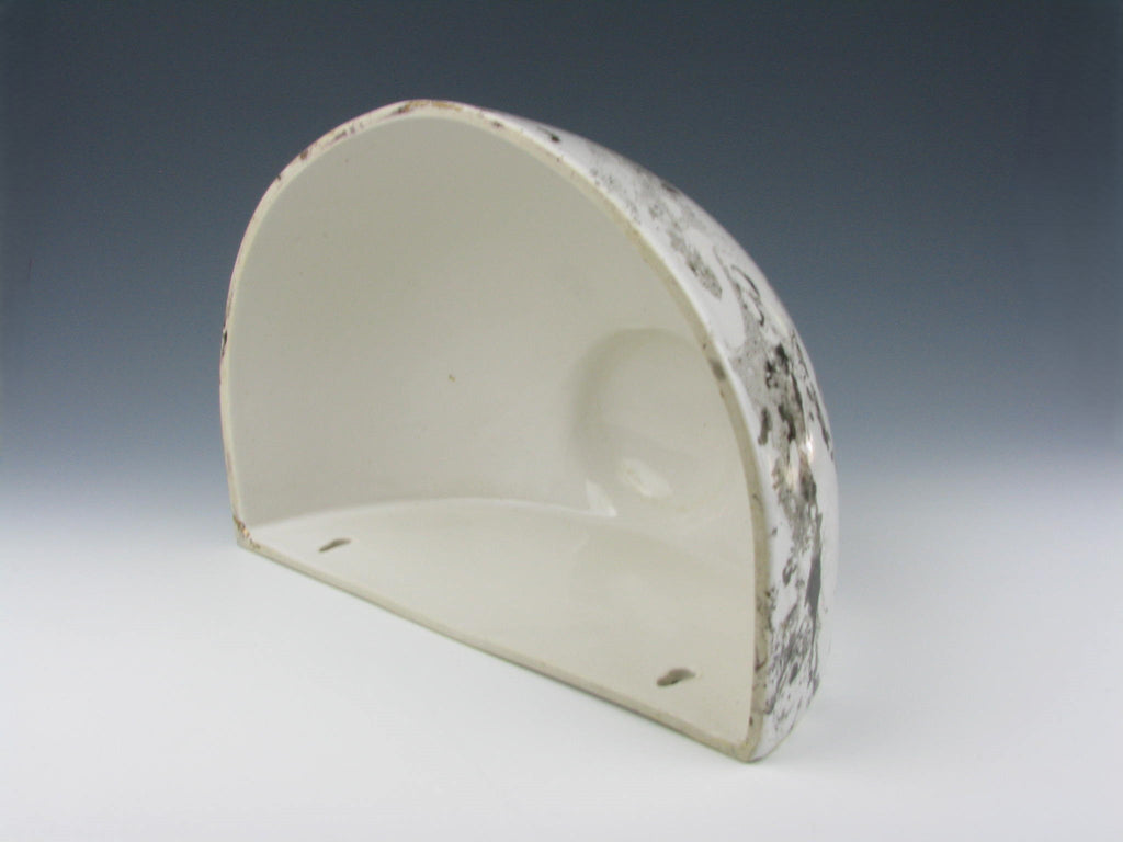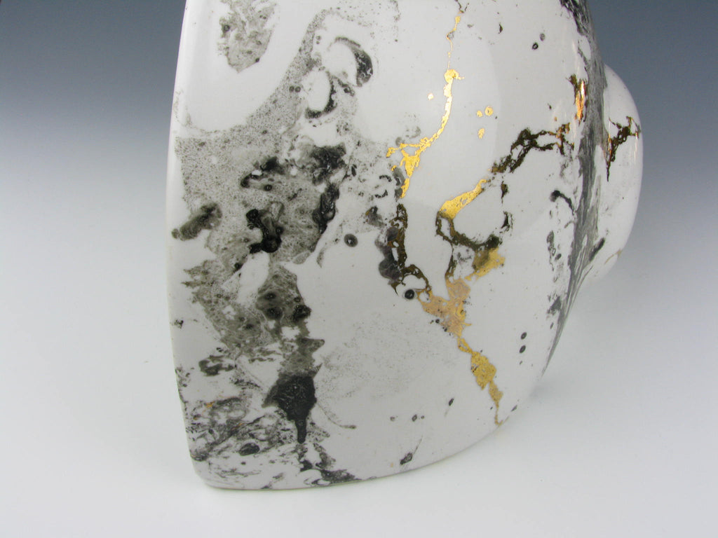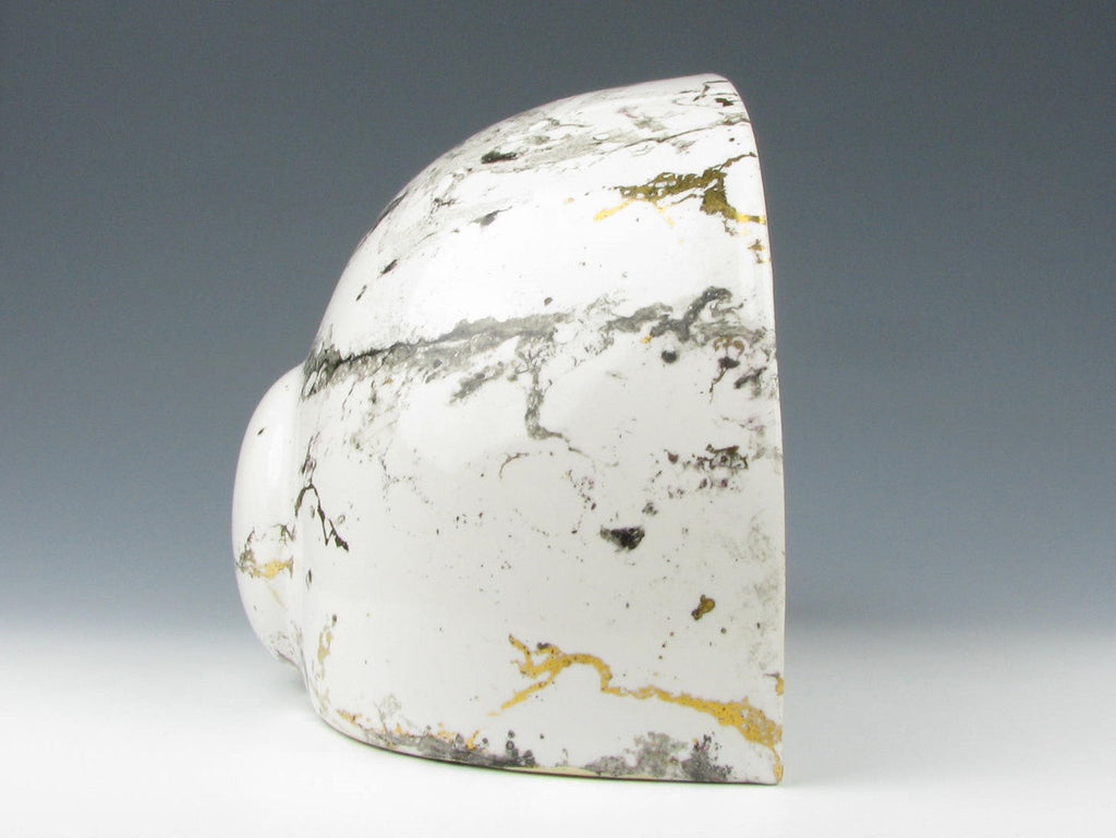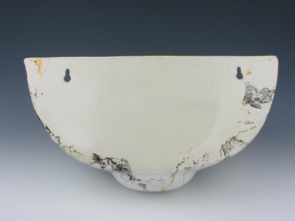 Vintage Charleton large white ceramic wall pocket planter with hand-painted marble finish in gray and gold.
