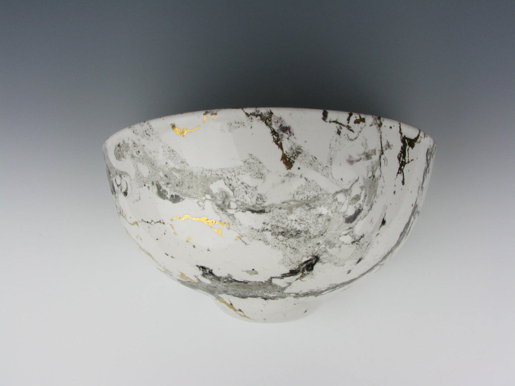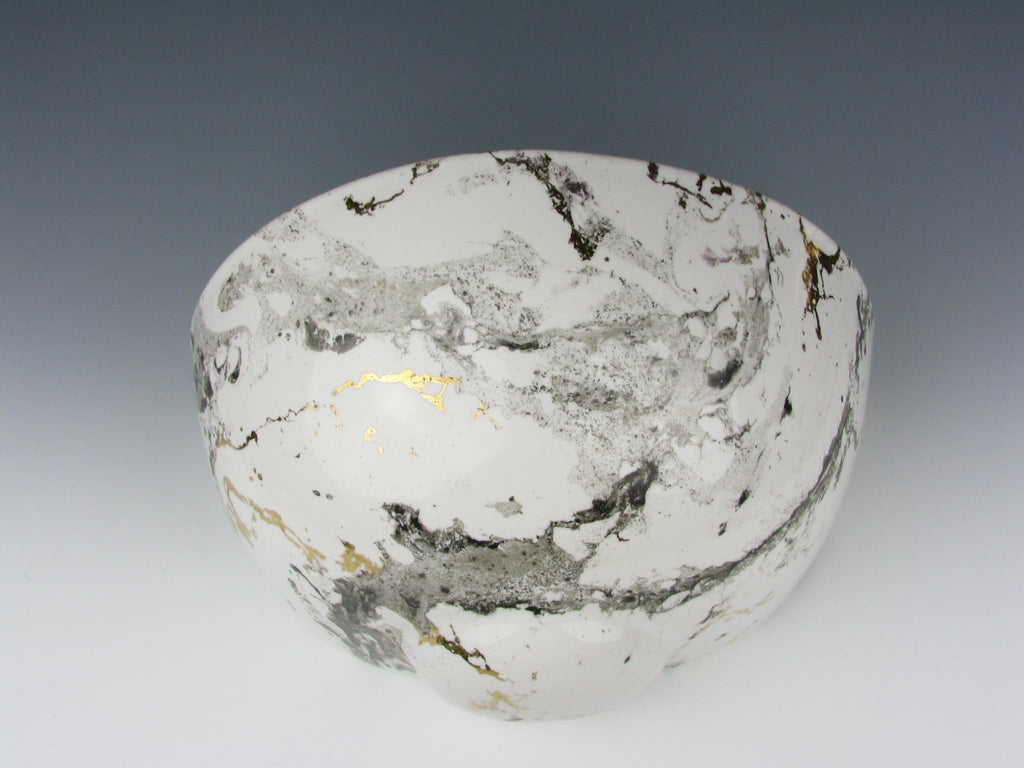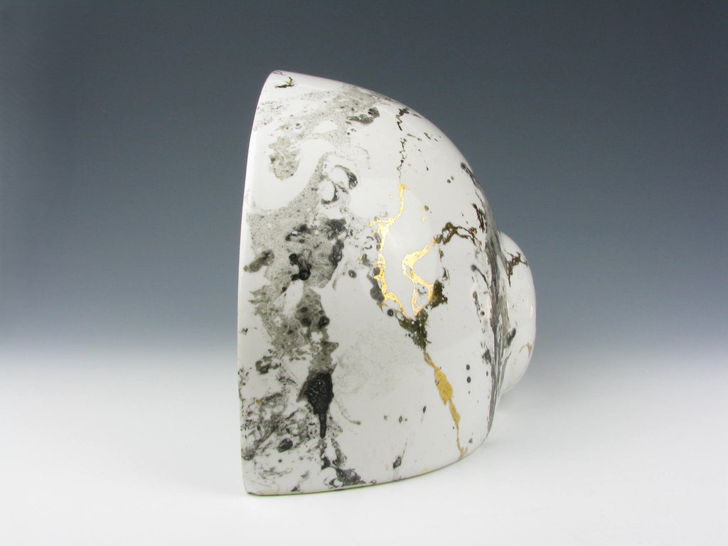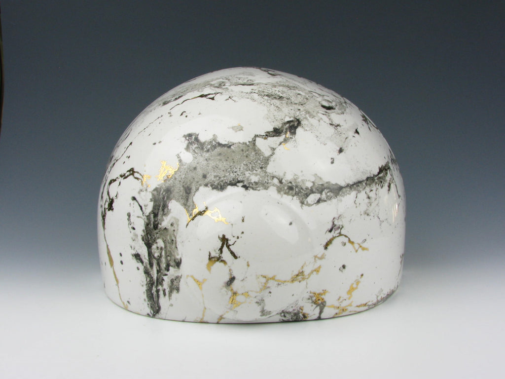 Vintage Charleton large white ceramic wall pocket planter with hand-painted marble finish in gray and gold.