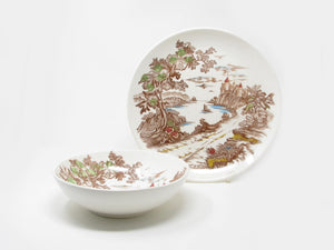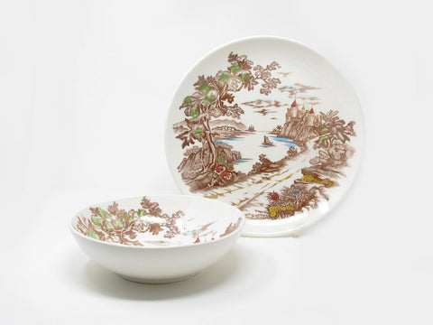 Vintage Ucagco Japan Royal Vista Serving Bowl and Chop Cake Plate with Coastal Castle Scene - 2 Pieces