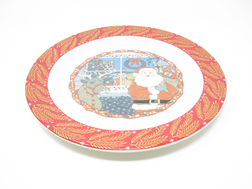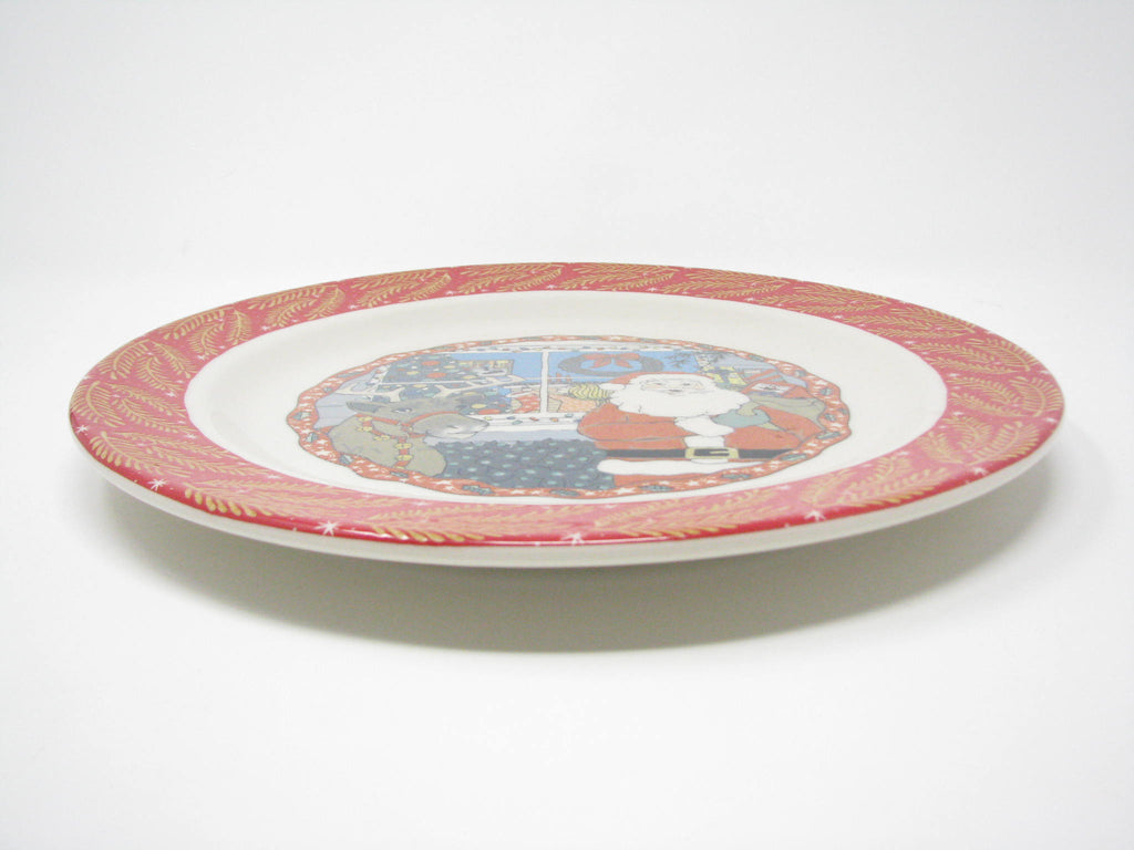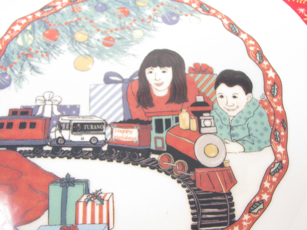 Set of 2 Turano Bakery (Chicago, IL) Holiday Collection large dinner plates or charger plates with holiday designs and red trim. One plate features a mother and child watching a train (2017) while another showcases Santa and a reindeer (2015). May also be used as a chop plate / platter.