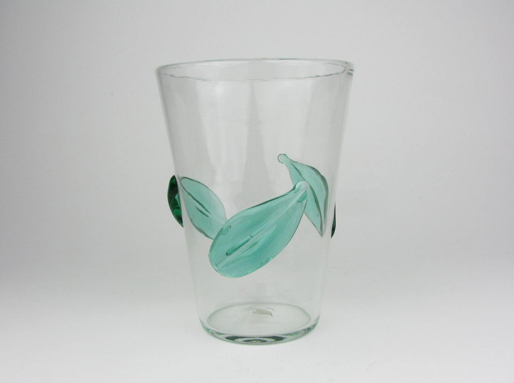 Vintage Blenko clear glass vase with applied green glass leaves. Made in the USA.