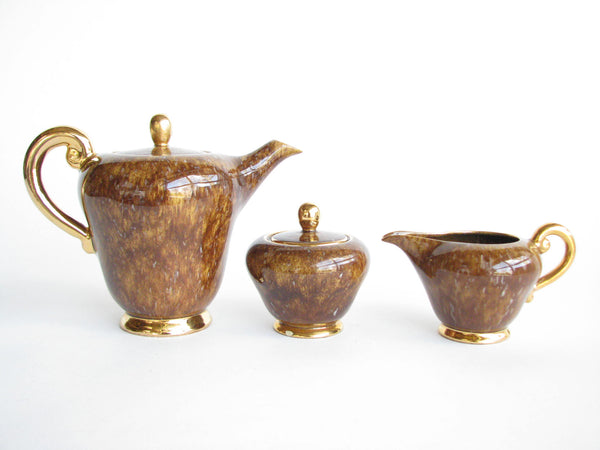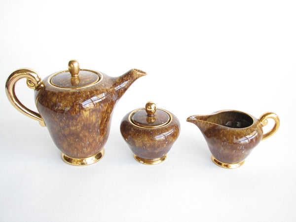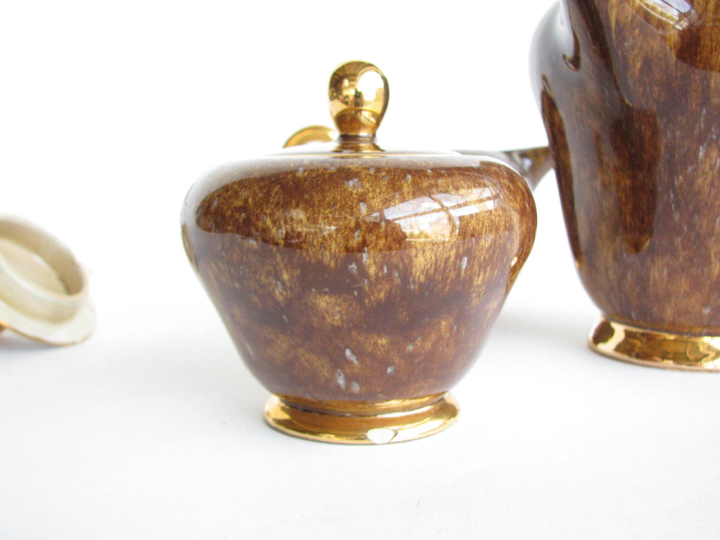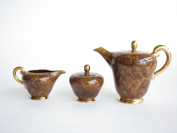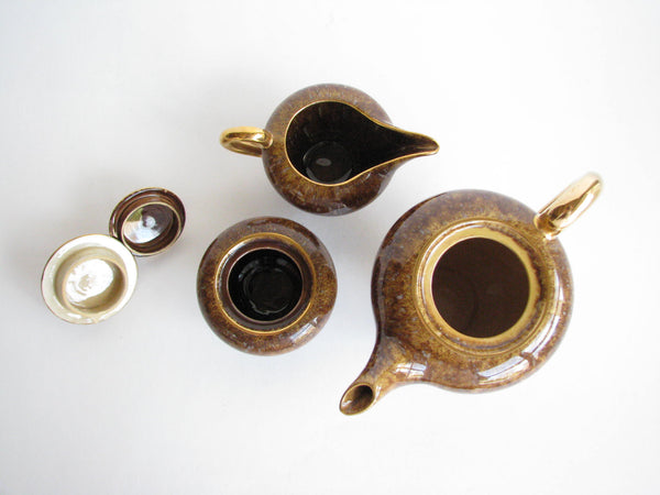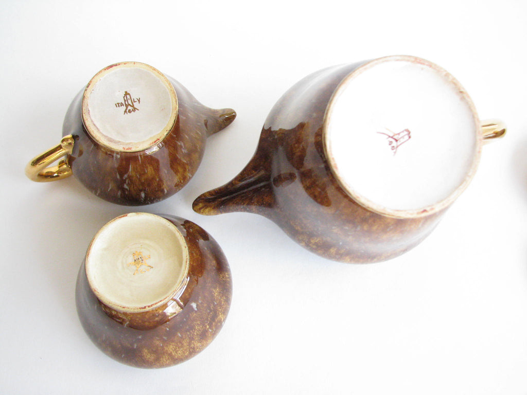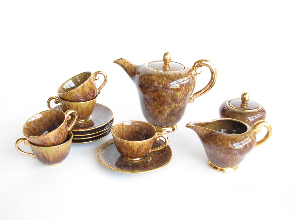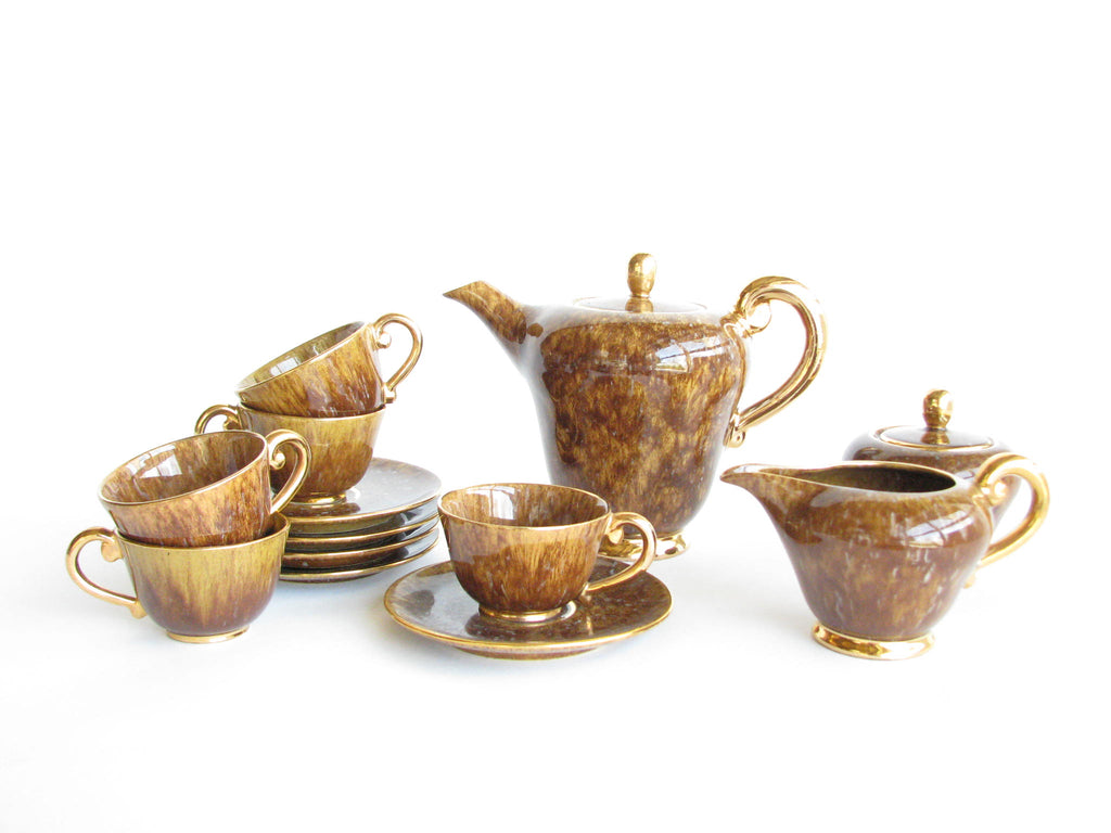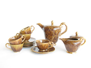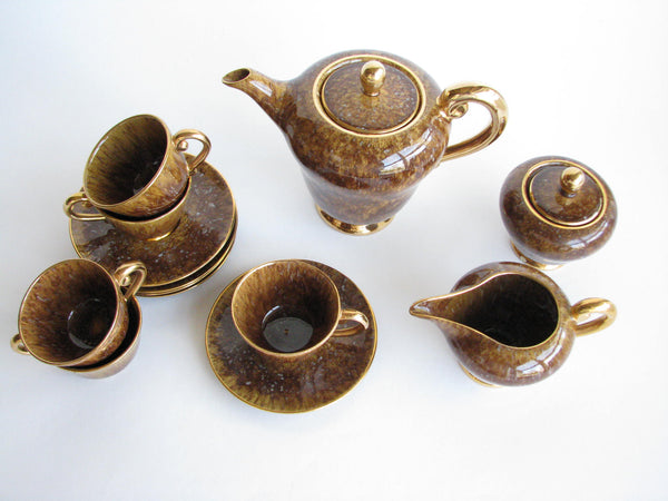 1940s Industria Ceramica Umbra (ICU) gilded mottled brown ceramic tea or espresso / coffee set made in Italy. Set consists of a pot, creamer, sugar bowl, and 5 demitasse cups and saucers (13 pieces total).