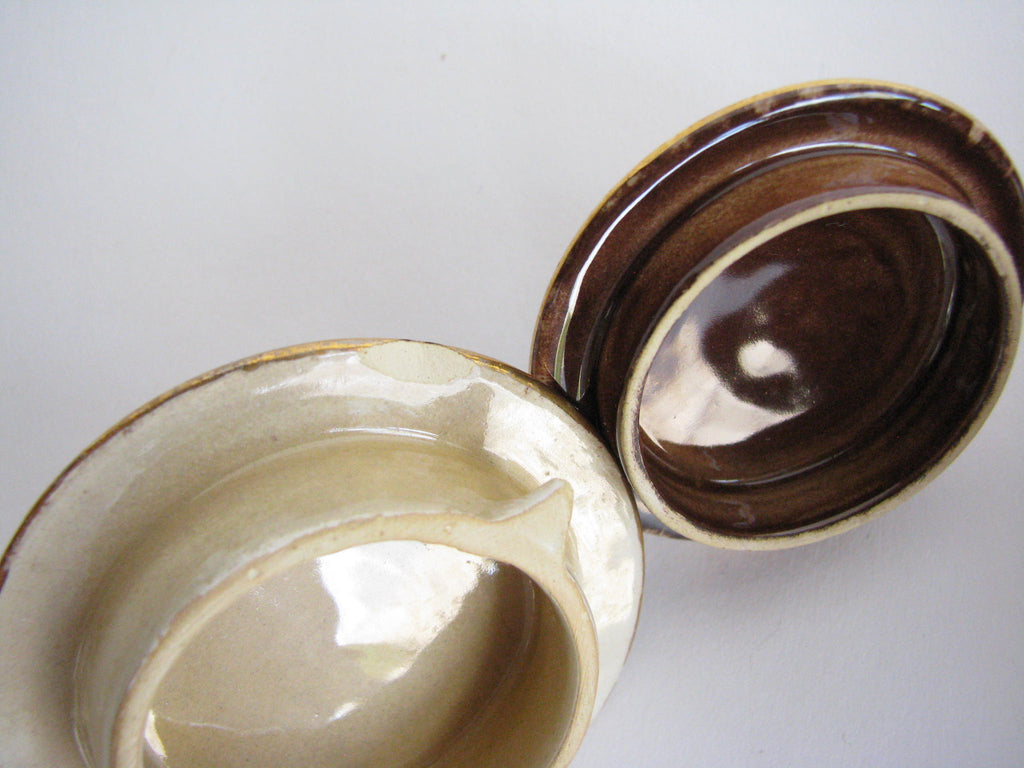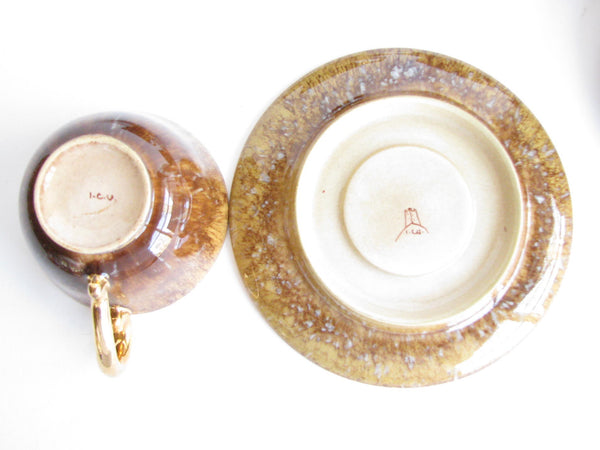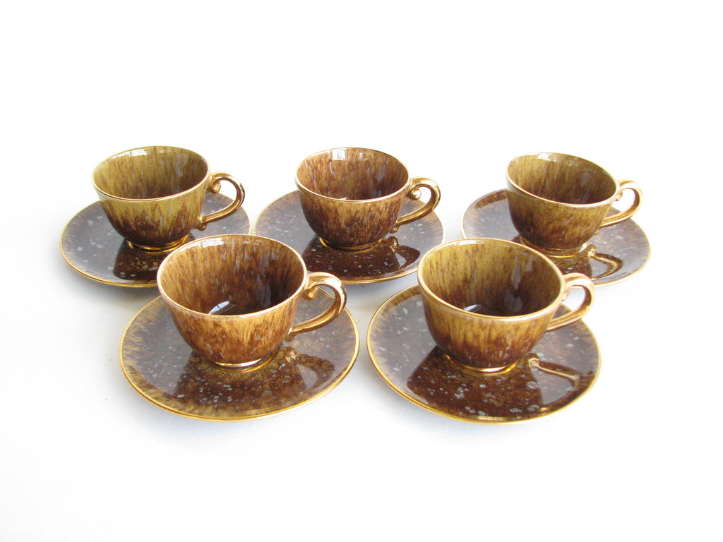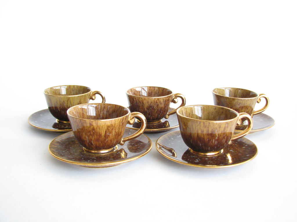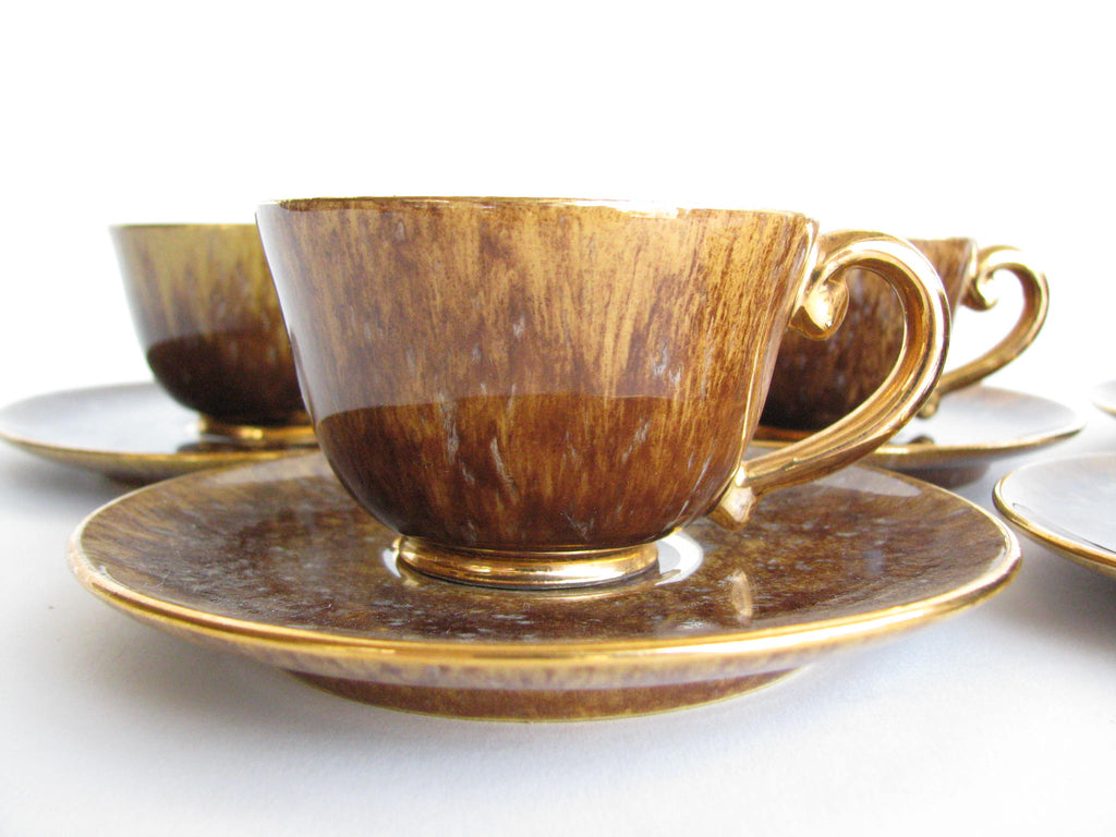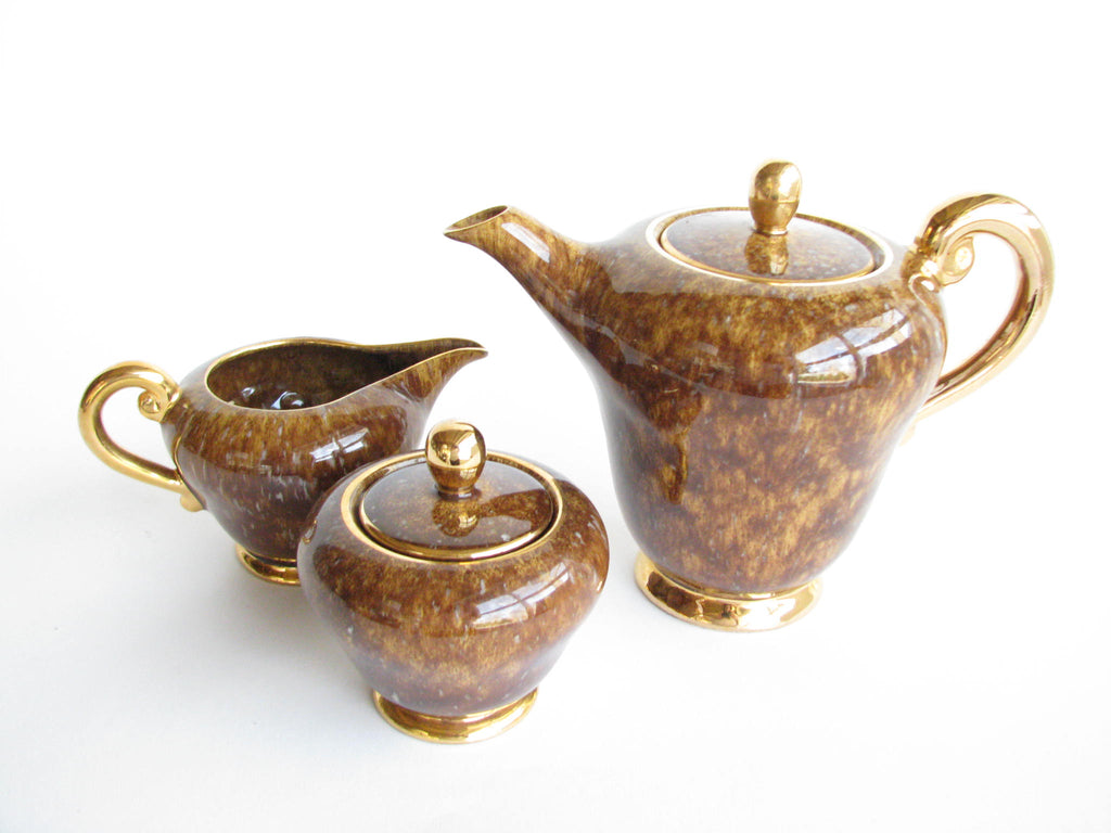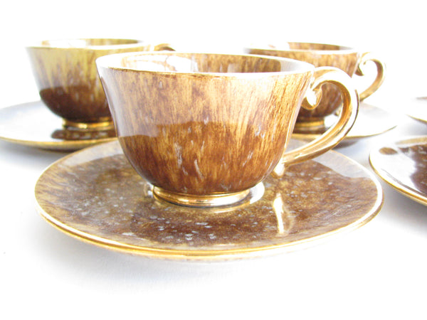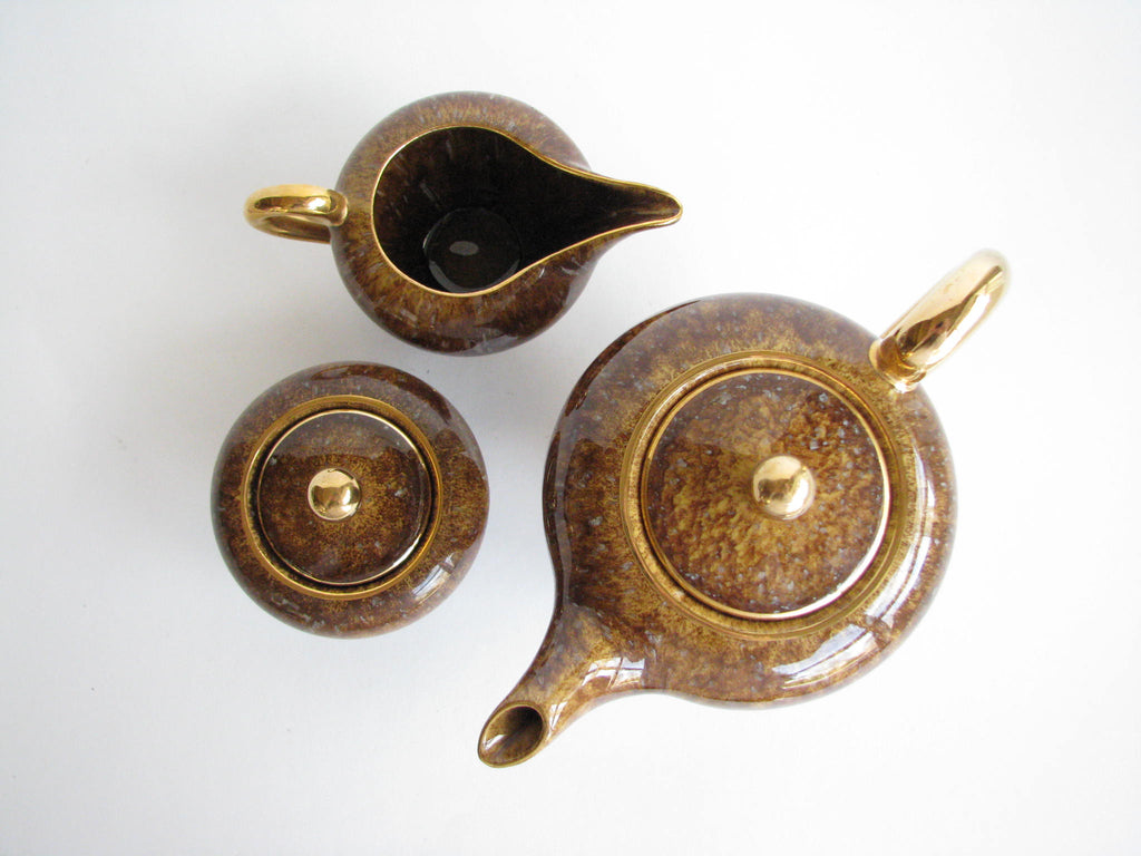 1940s Industria Ceramica Umbra (ICU) gilded mottled brown ceramic tea or espresso / coffee set made in Italy. Set consists of a pot, creamer, sugar bowl, and 5 demitasse cups and saucers (13 pieces total).