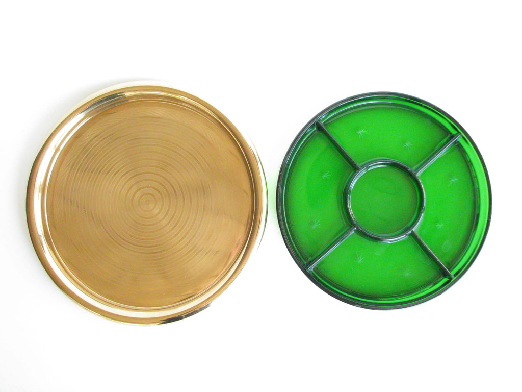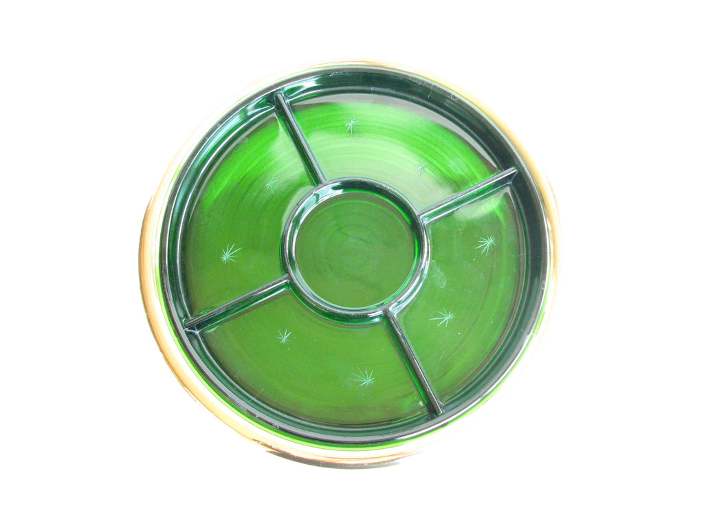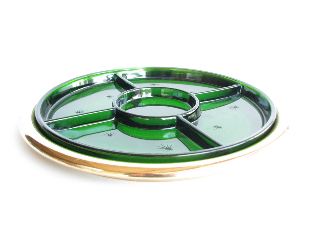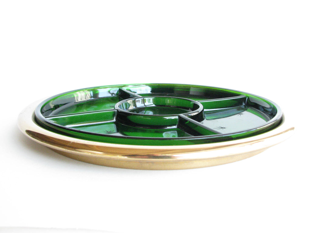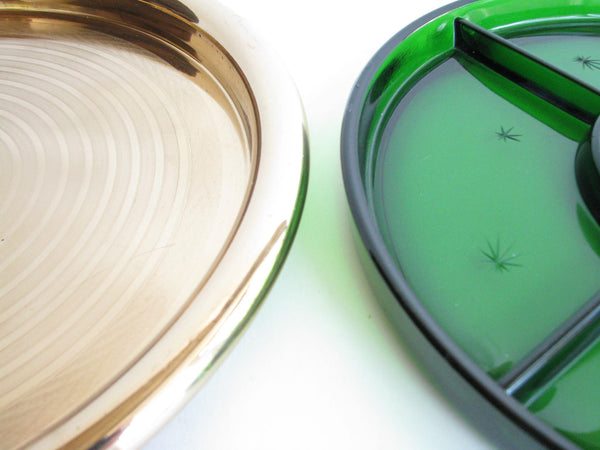 1940s Paden City Emerald Glo green glass platter with atomic star design and brass plated tray made by National Silver Company.