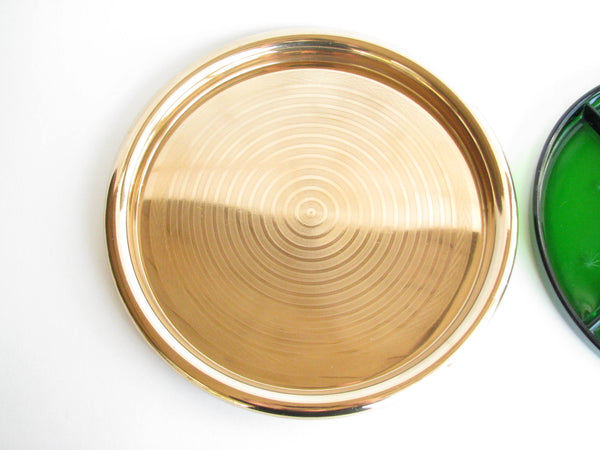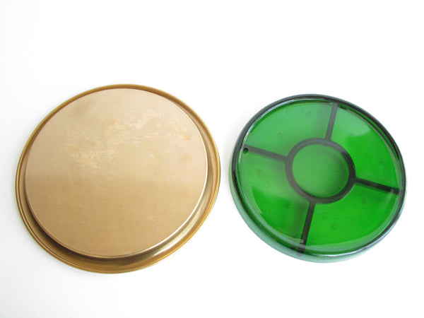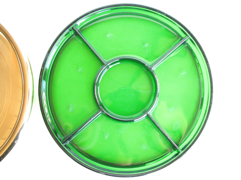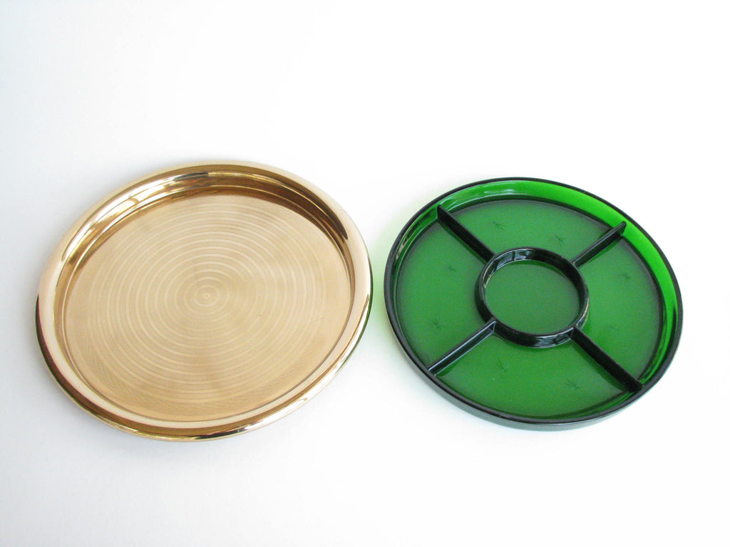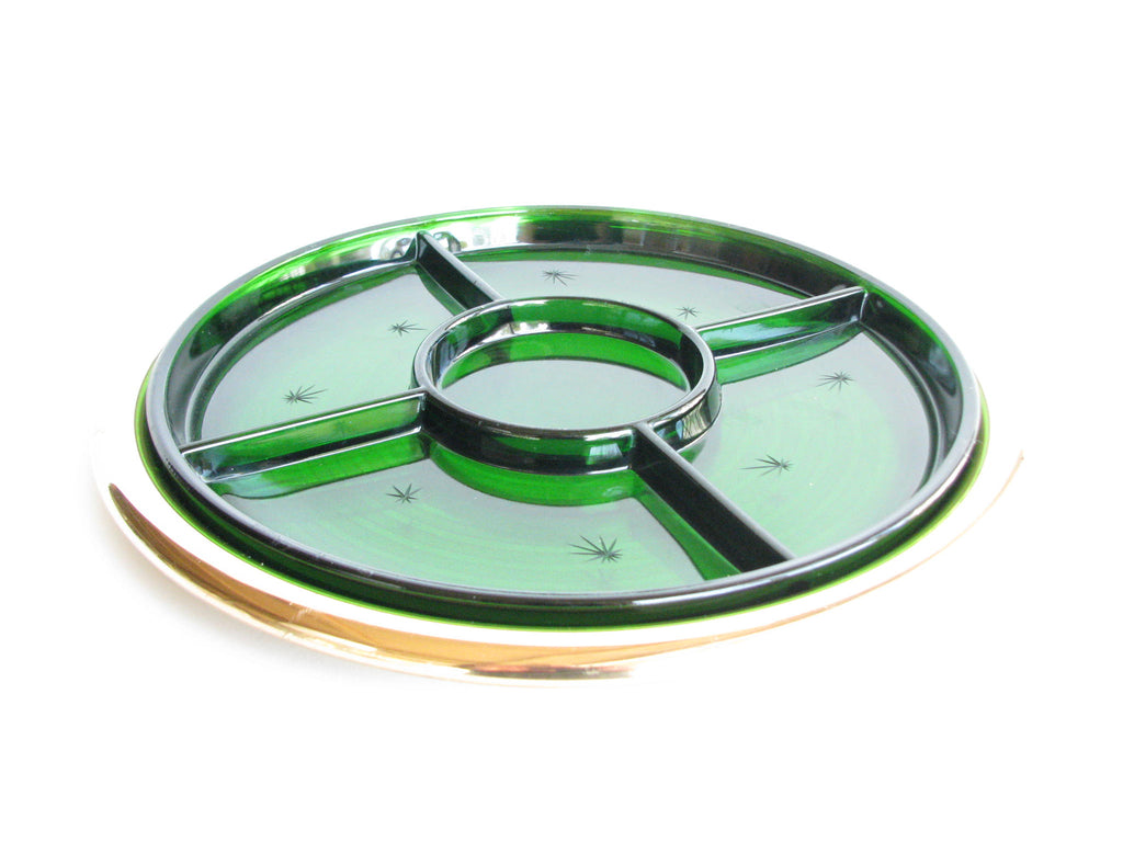 1940s Paden City Emerald Glo green glass platter with atomic star design and brass plated tray made by National Silver Company.