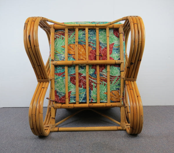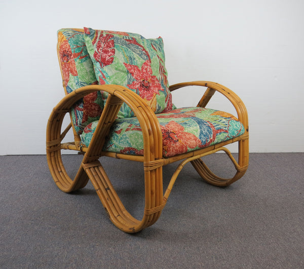 1940's Paul Frankl inspired "Pretzel" 4 strand bamboo and rattan lounge chair with 100% cotton outdoor "Carnival" fabric. 1-piece loose seat and back cushion with an additional loose down filled back pillow.