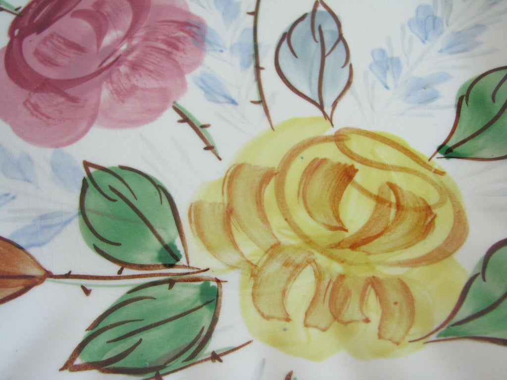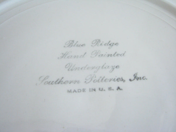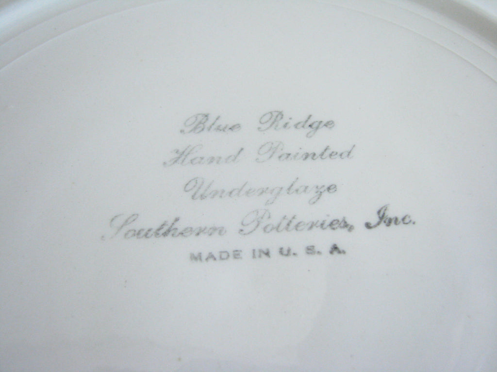 Blue Ridge is a brand and range of American tableware (dishware) manufactured by Southern Potteries Incorporated from the 1930s until 1957. Well known in their day for their underglaze decoration and colorful patterns, Blue Ridge pieces are now popular items with collectors of antique dishware. The underglaze technique made the decorations more durable, and while basic patterns were reused consistently, the fact that each piece was hand-painted means that no two pieces are exactly alike. (Excerpt from Wikipedia)