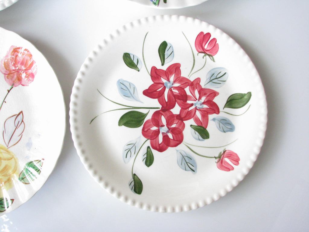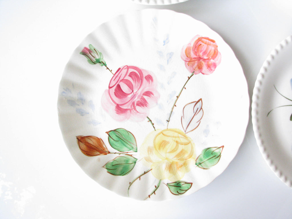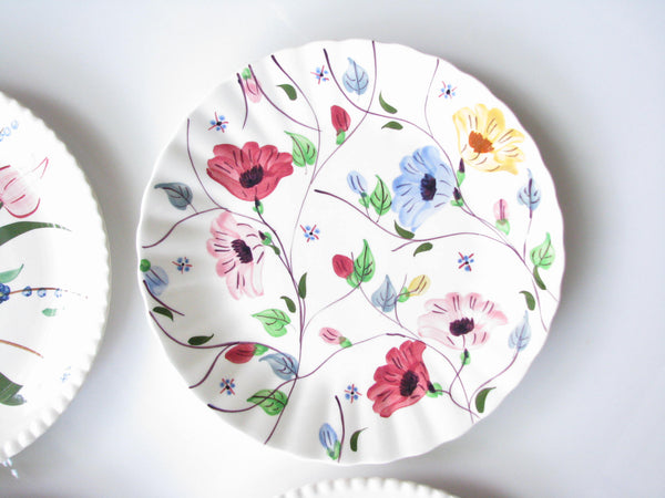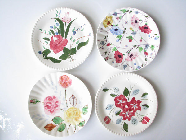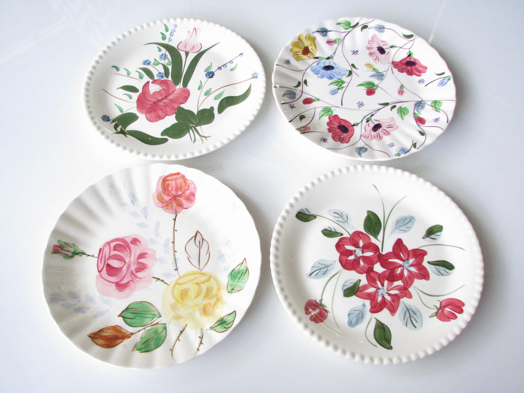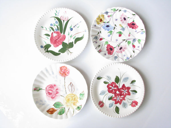 Vintage set of 4 mix and match Southern Pottery Blue Ridge floral dinner plates. Designs include Carol's Roses, Chintz, and Bluebell Bouquet, and an unknown (3 red starflowers) with fluted rims.