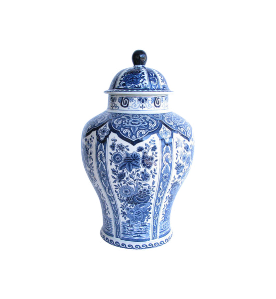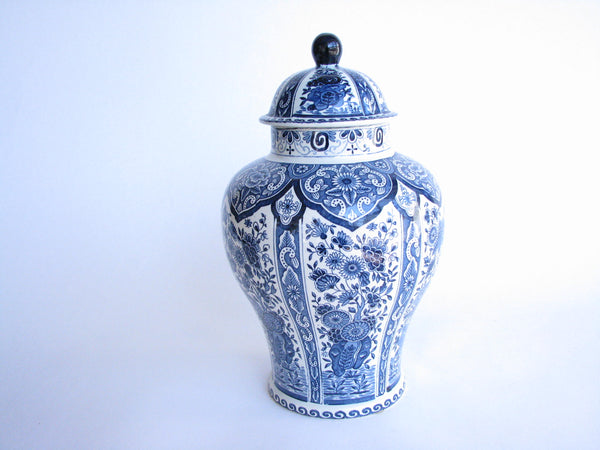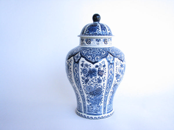 Large size mid 20th Century Delft lidded ginger jar or jardiniere by Bach Belgium made for Royal Sphinx Holland. Vibrant blue and white porcelain with classic hand-painted floral decorations.