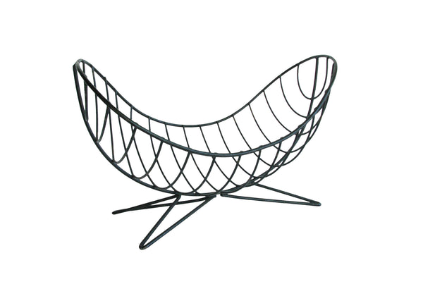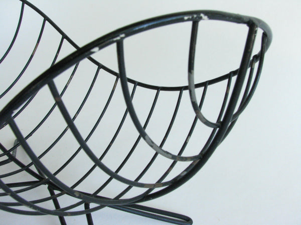 Architecturally stunning B-3 Twin Scoop wire fruit bowl designed by Andree Ferris and Reta Shacknove. This asymmetrical, curved basket has contoured ribs and is supported by four hairpin legs. Welded iron. Original black finish.
