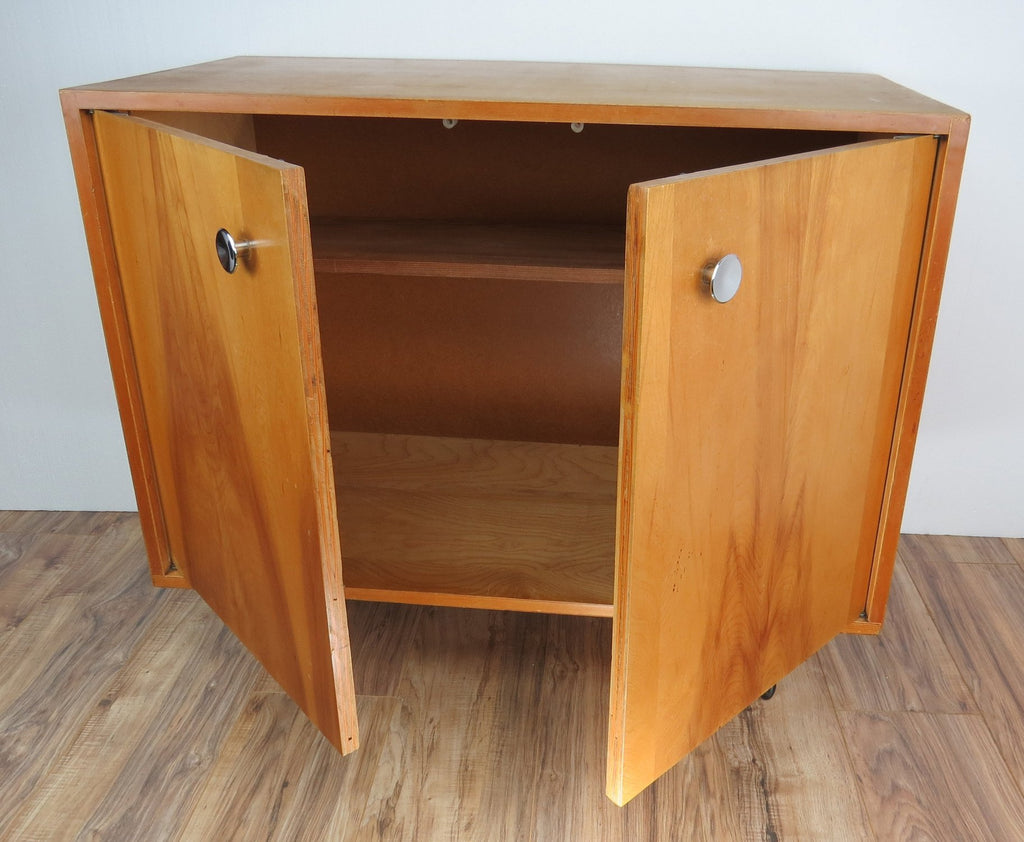 Two-door light walnut cabinet on black iron hairpin legs by Mengel Furniture Company. One shelf and original chrome pulls. Although not a designer for Mengel the aesthetic for this piece matches that of George Nelson.