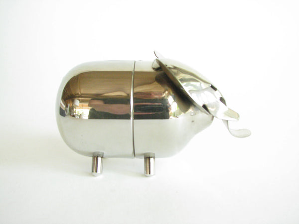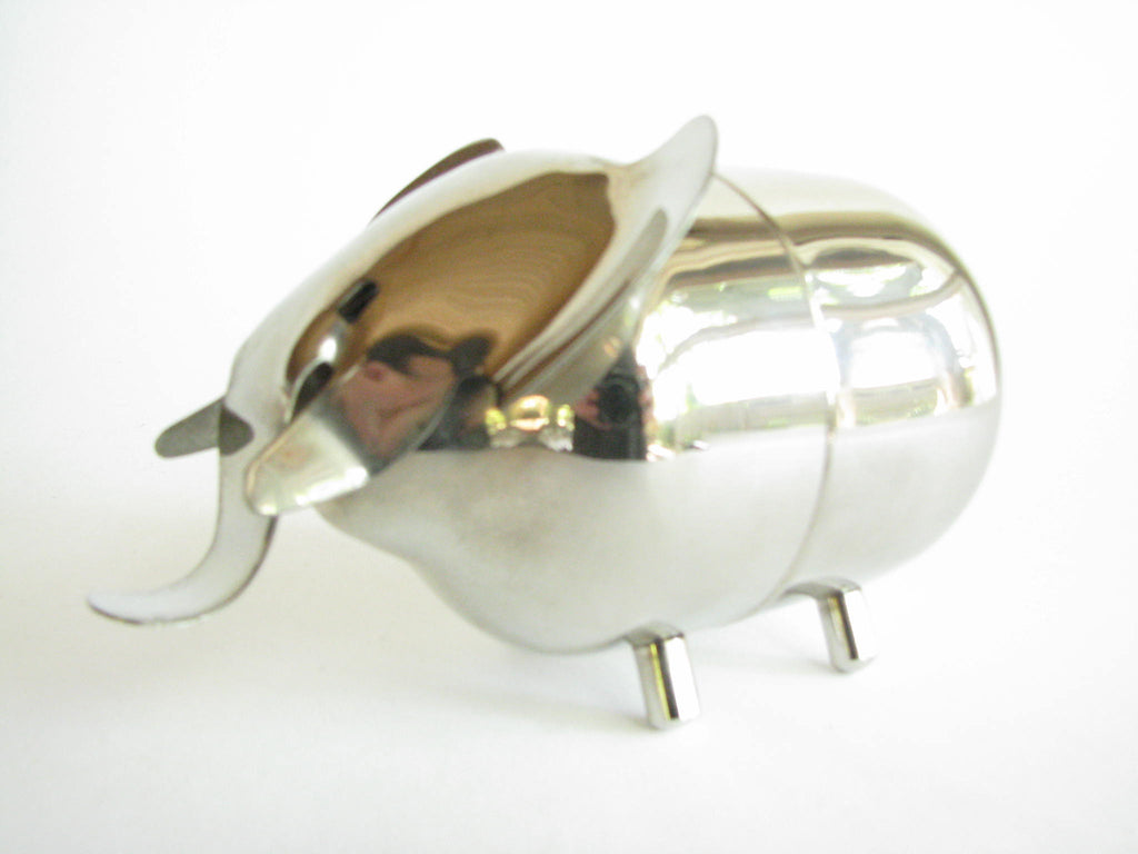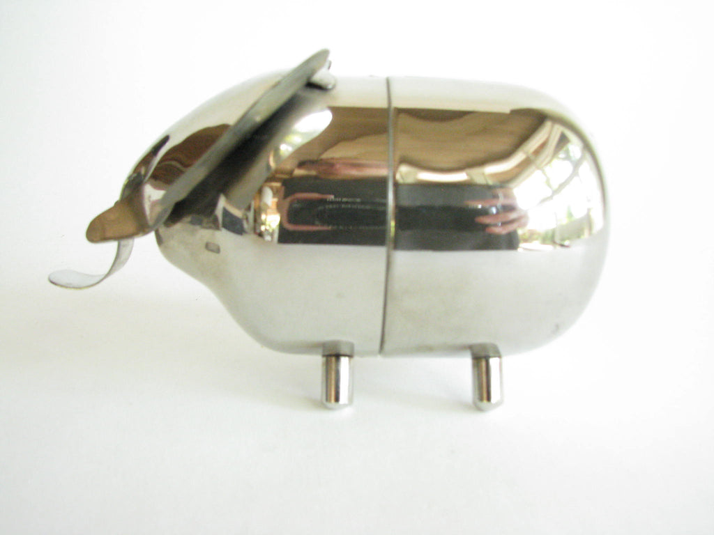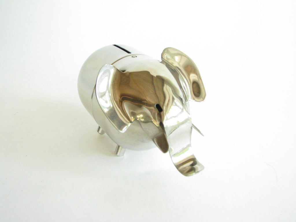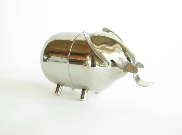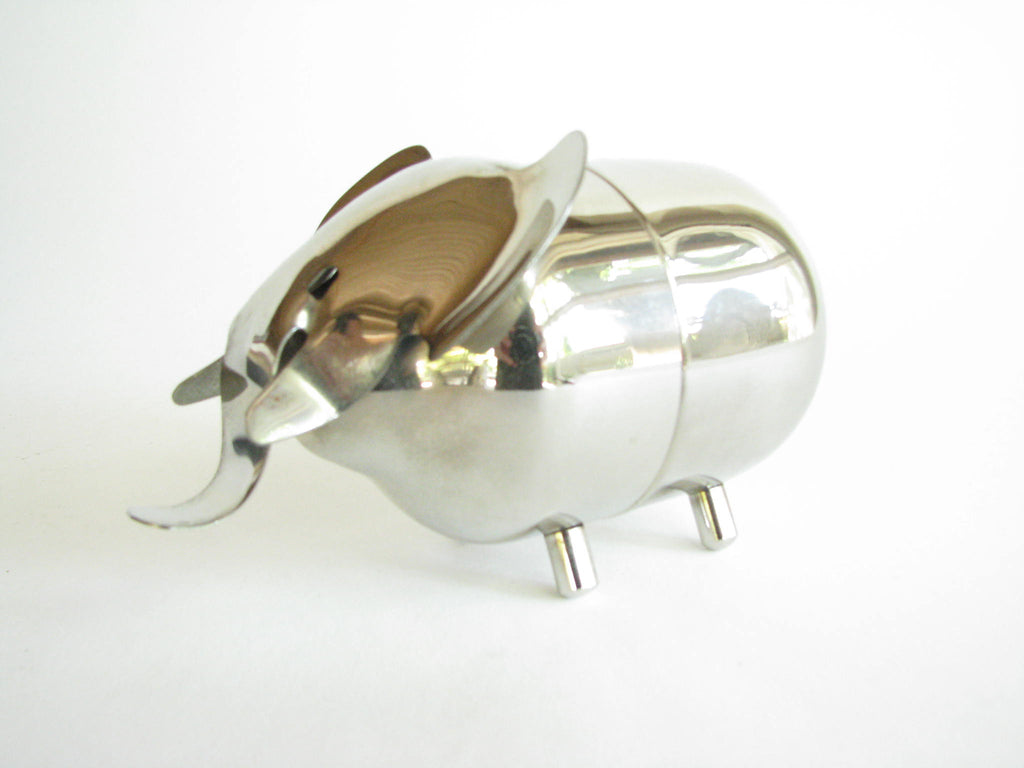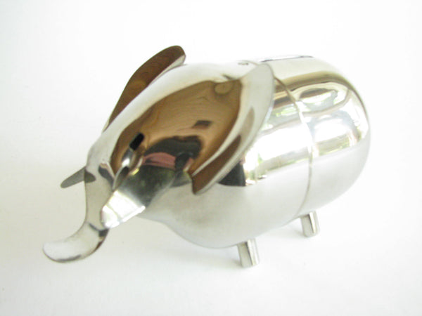 Vintage metal piggy bank in the shape of an elephant by Raimond. The bank needs to be unscrewed on the bottom to retrieve contents. Stamped 'Raimond' and 'Pat. Pend.'