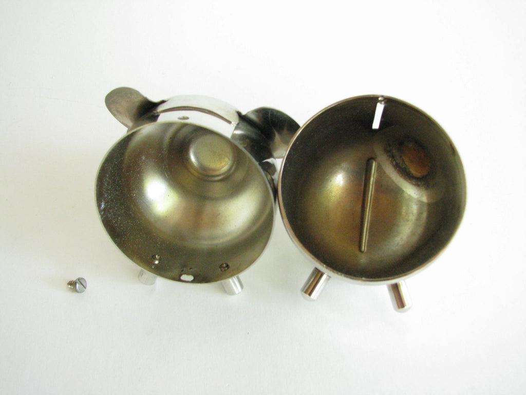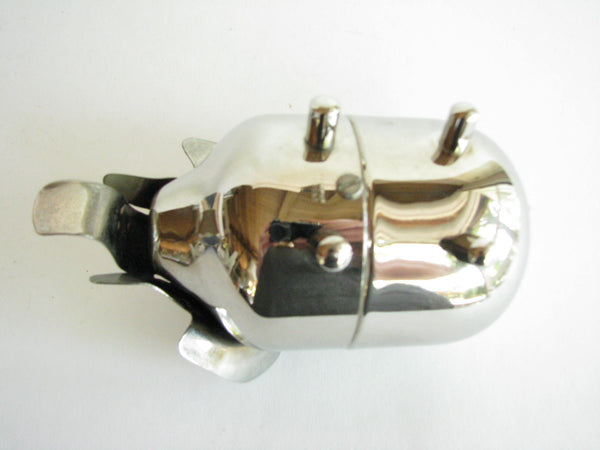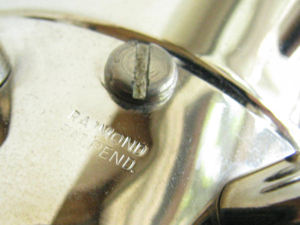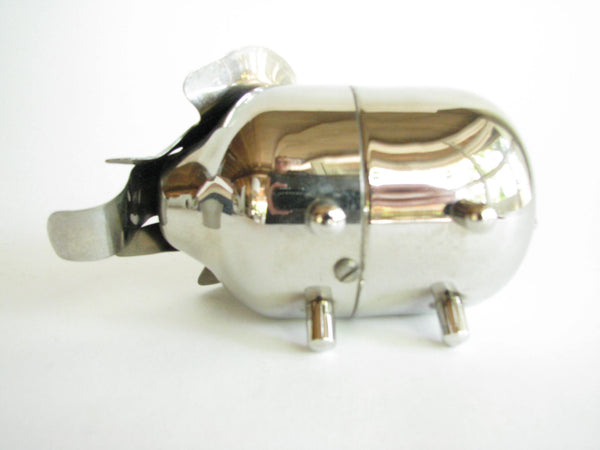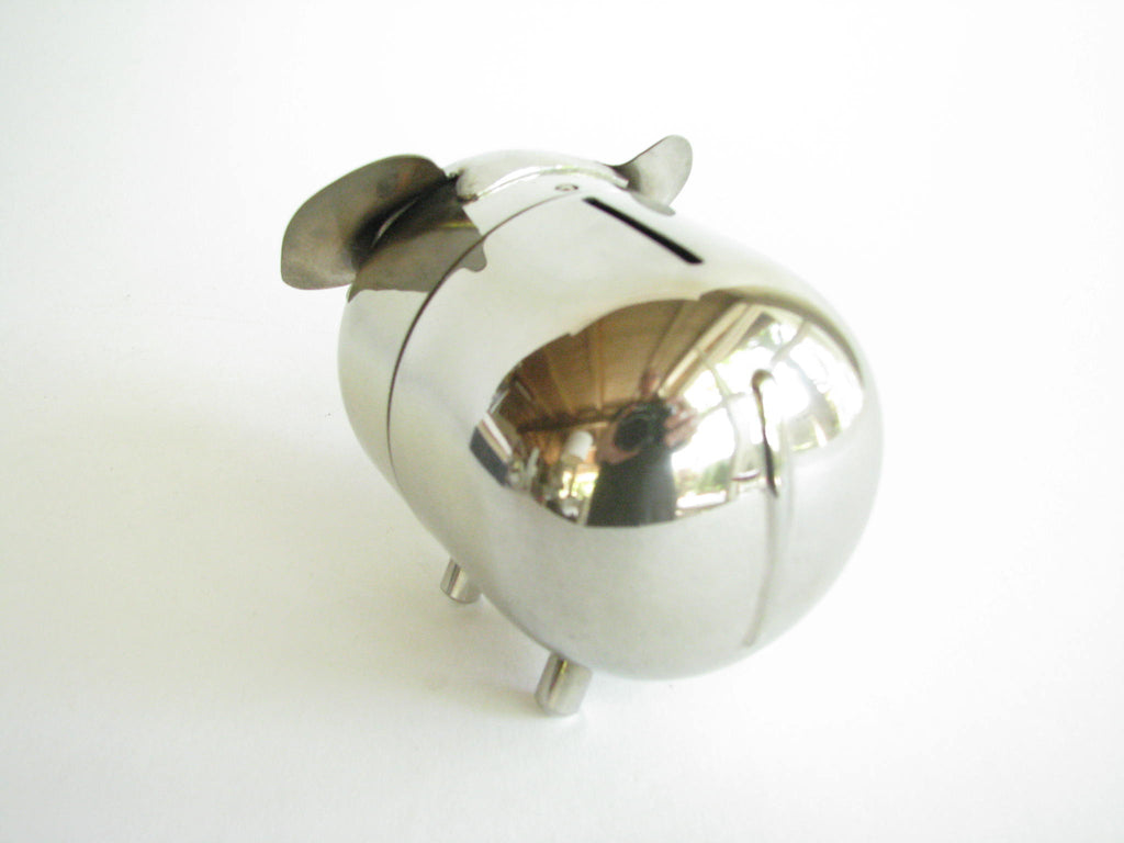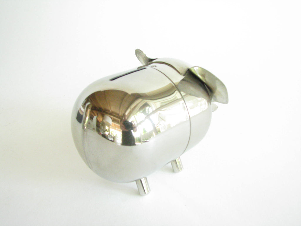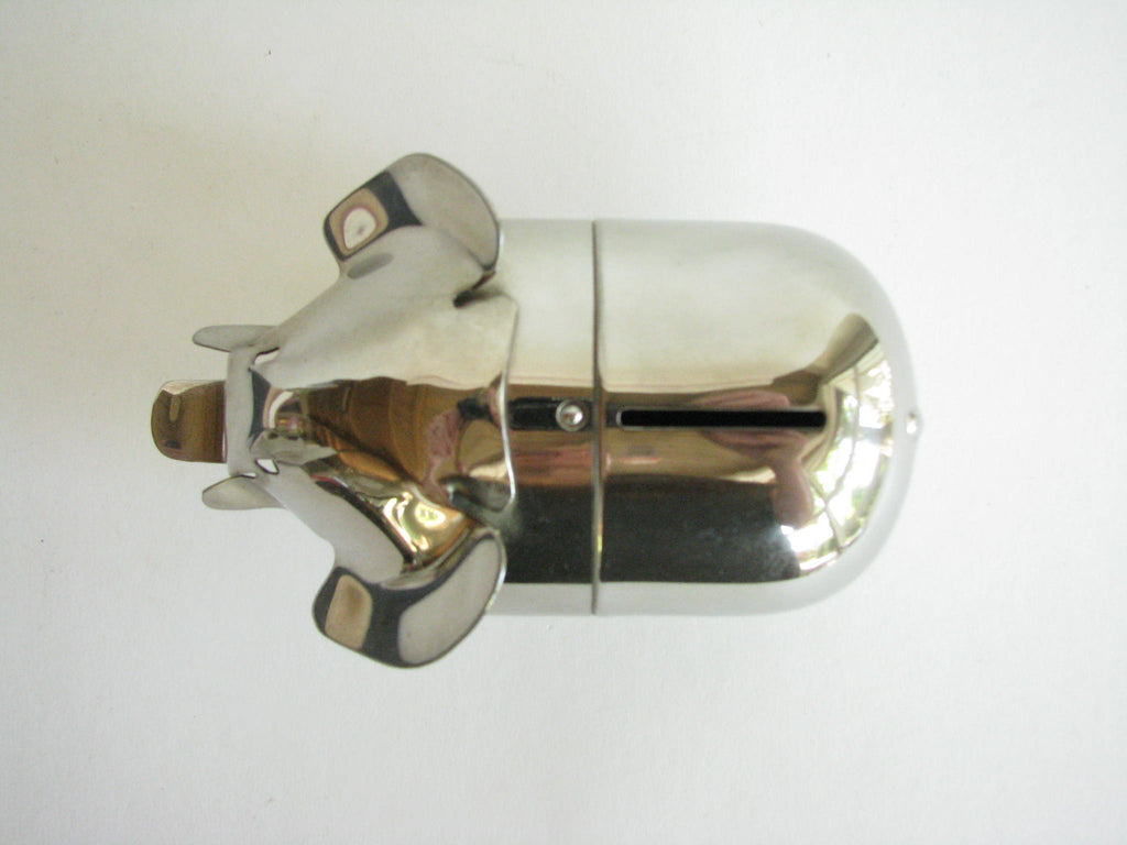 Vintage metal piggy bank in the shape of an elephant by Raimond. The bank needs to be unscrewed on the bottom to retrieve contents. Stamped 'Raimond' and 'Pat. Pend.'