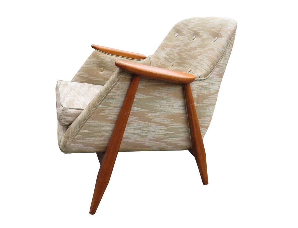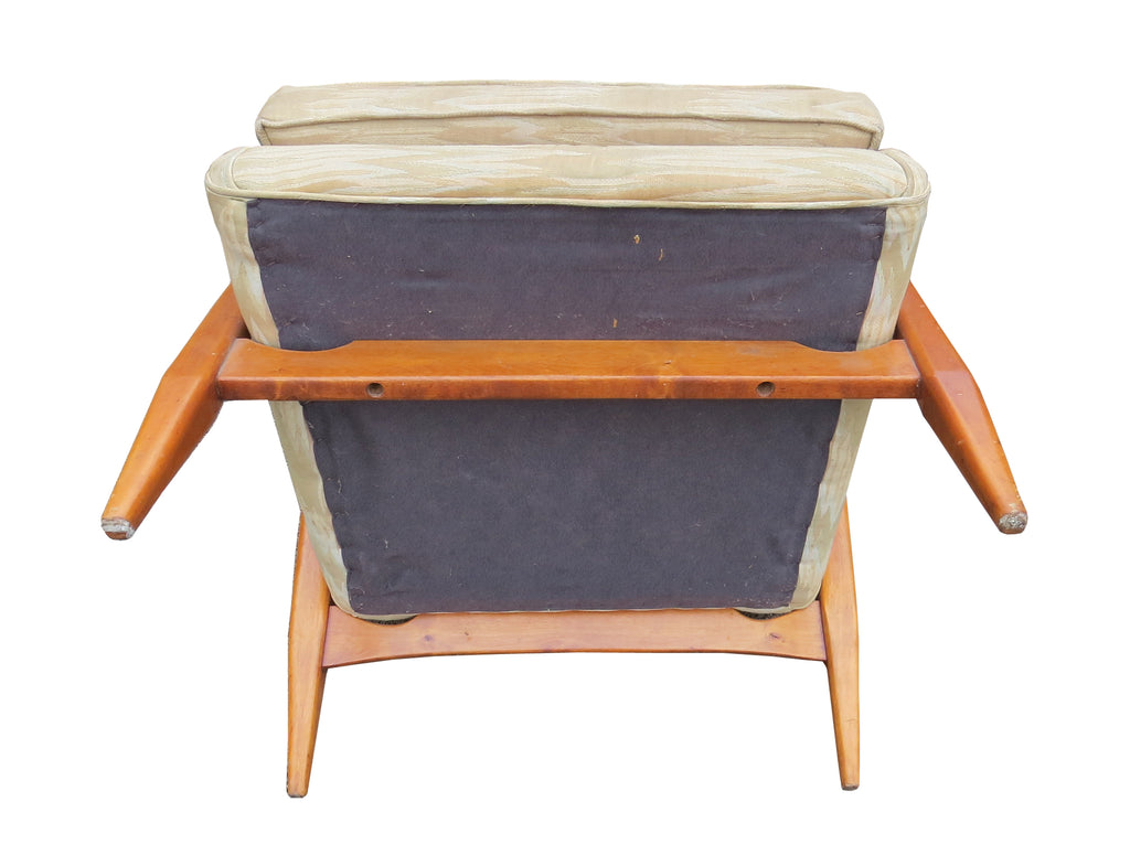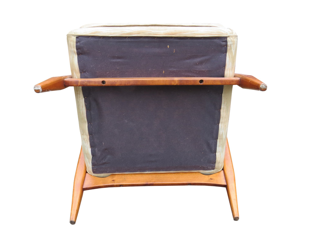 Damage or Points of Notice: In overall very good vintage condition appropriate with age and use. Fabric shows wear and a bit soiled. Could use a deep cleaning or be reupholstered. No damages or imperfections to structure and wood.