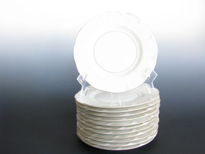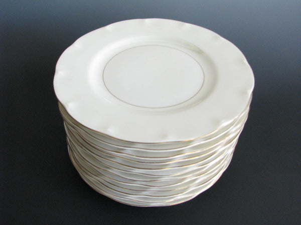 Set of 12 Theodore Haviland New York Leeds salad plates with scalloped edges and gold trim. White and off-white/cream design makes for an excellent match with nearly all other dinnerware designs.