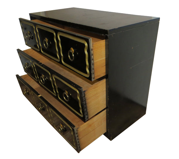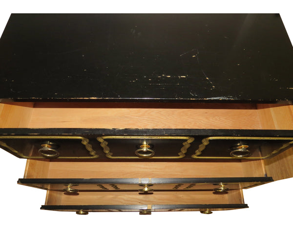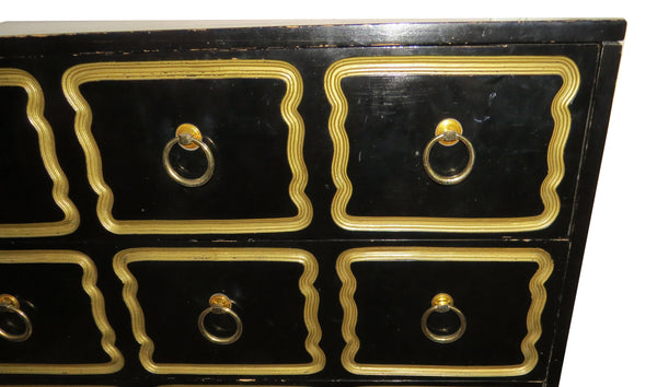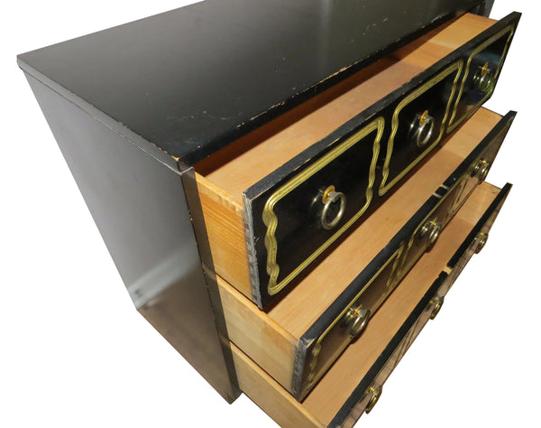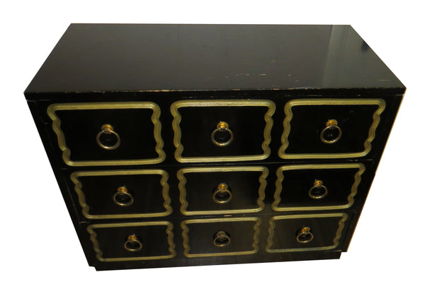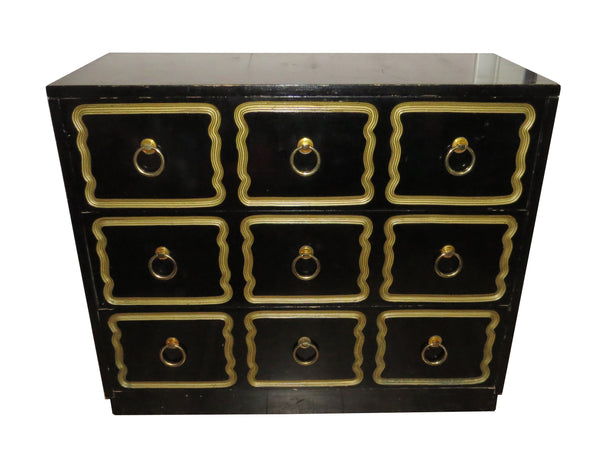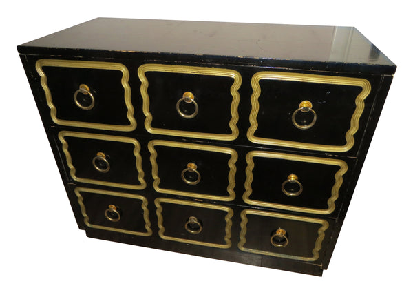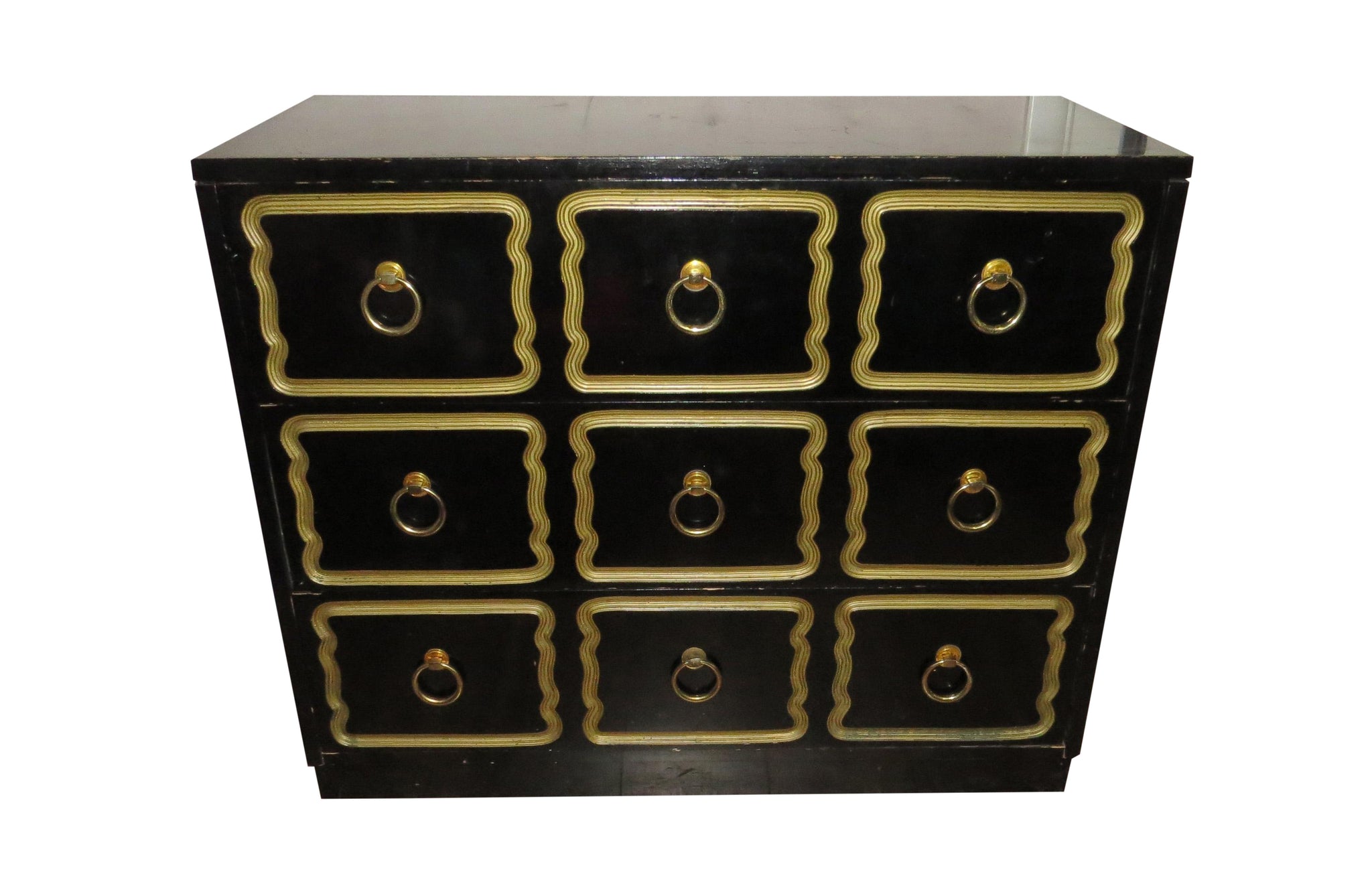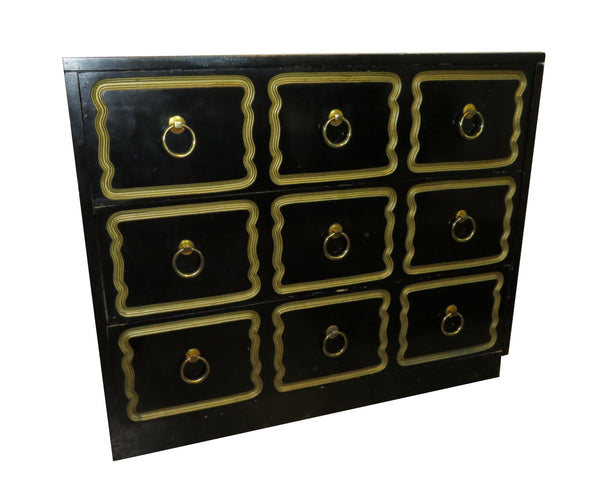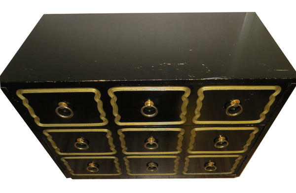 Vintage chest of drawers in the style if Dorothy Draper. Features a classic black lacquer frame and drawers with gold leaf detailing. Brass circle pulls and original finishing.