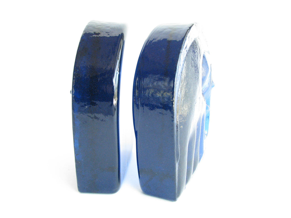 Mid 20th Century pair of solid Blenko blue glass elephant shaped bookends. Textured front and smooth back side. No chips, in excellent condition.