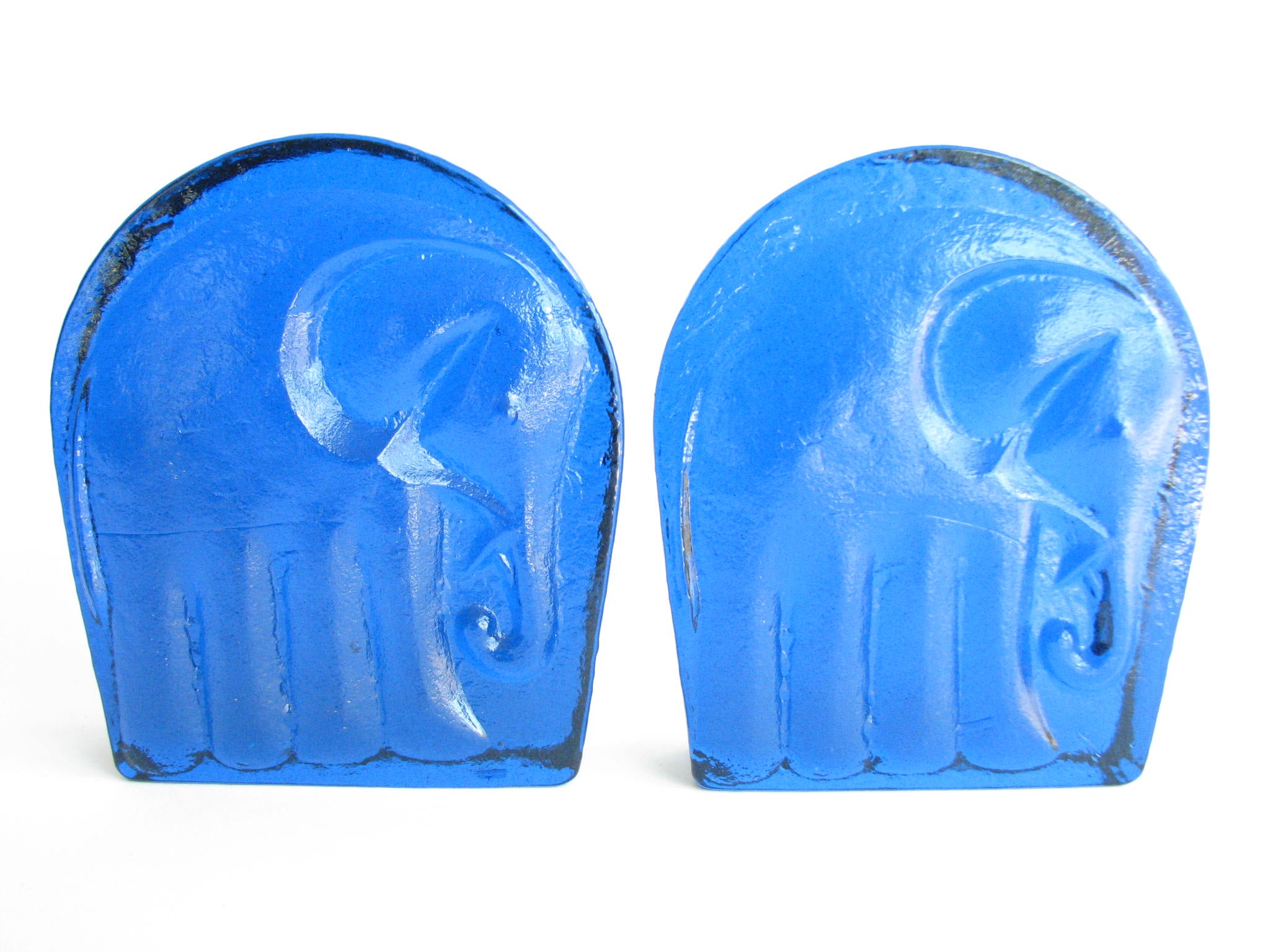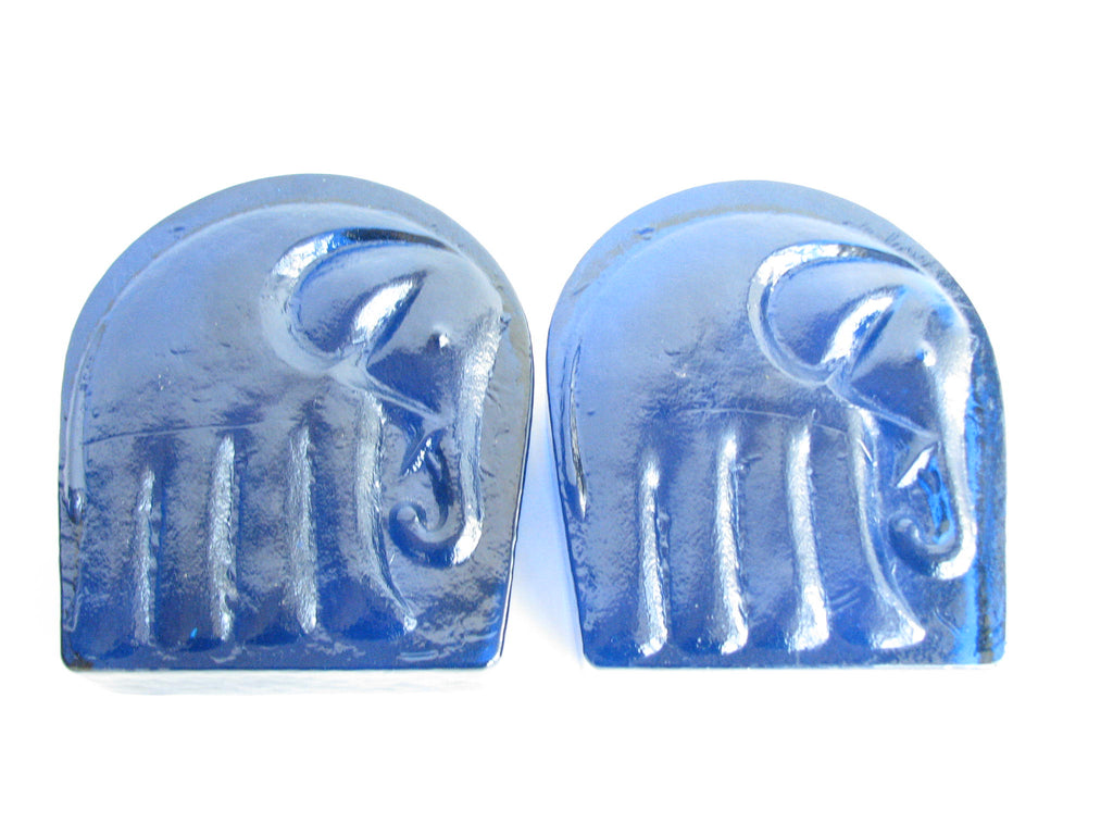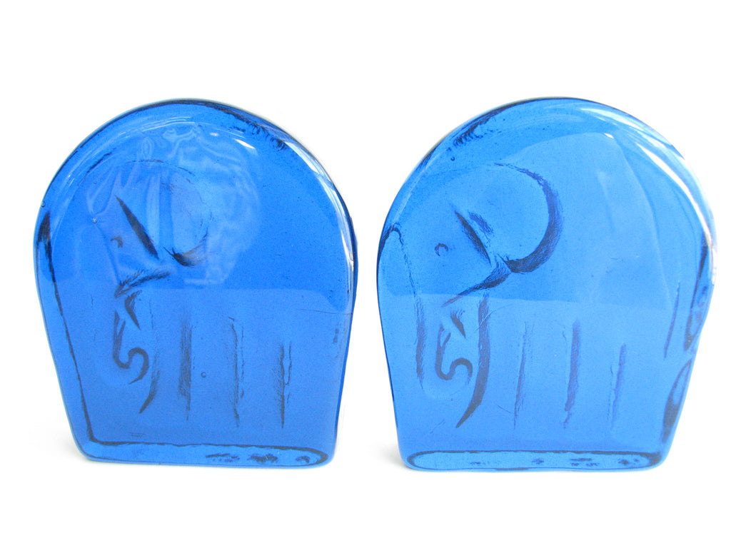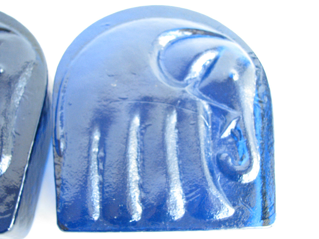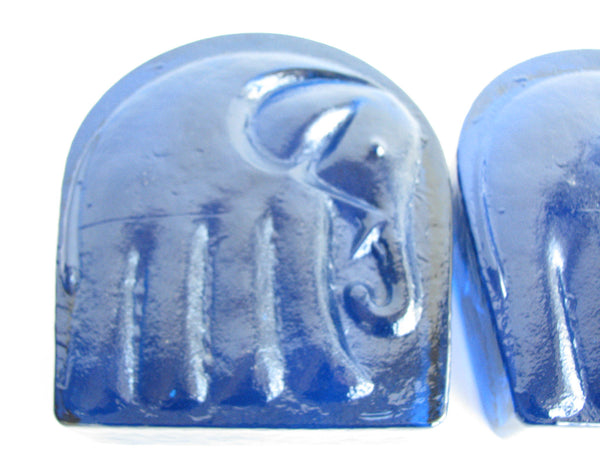 1960s Blenko Art Glass Blue Elephant Bookends - a Pair