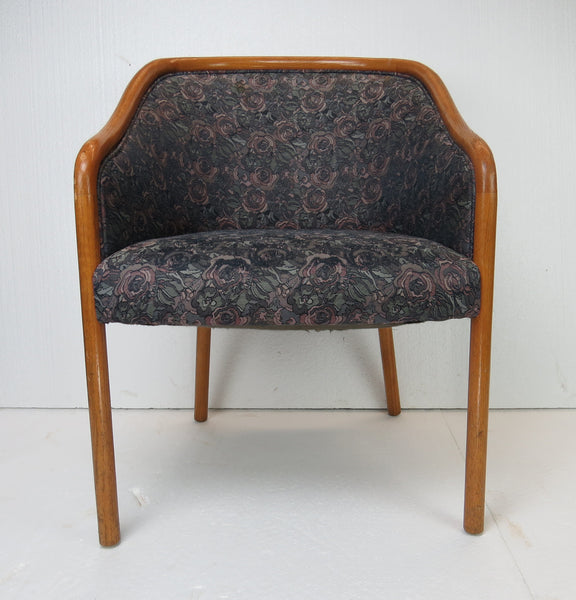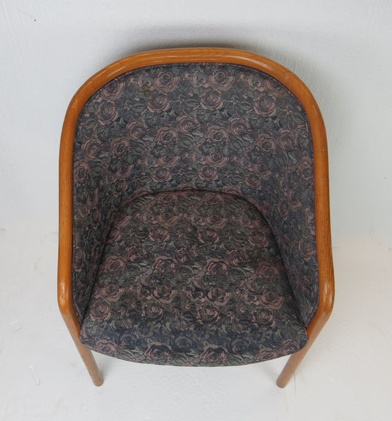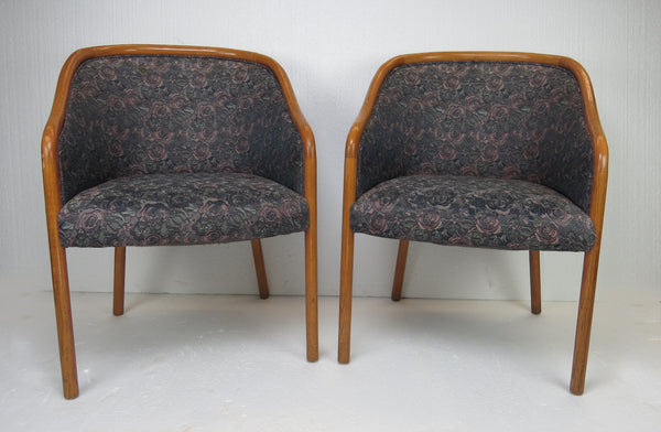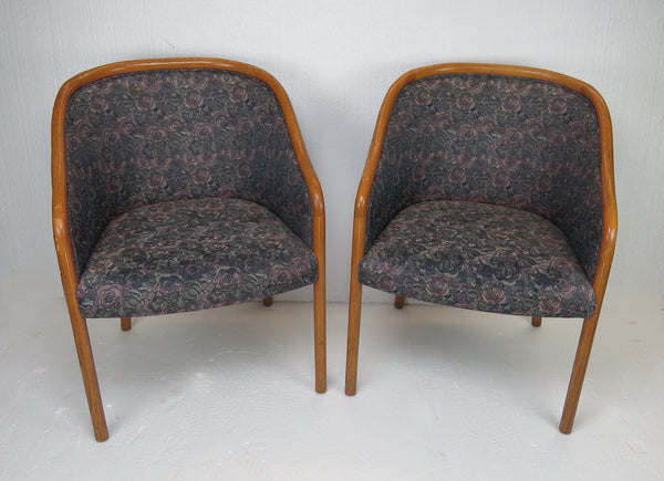 Pair of 1960s sculptural bucket chairs by Charlotte Chair Company Inc. Beautiful lines and dark gray and purple floral fabric.