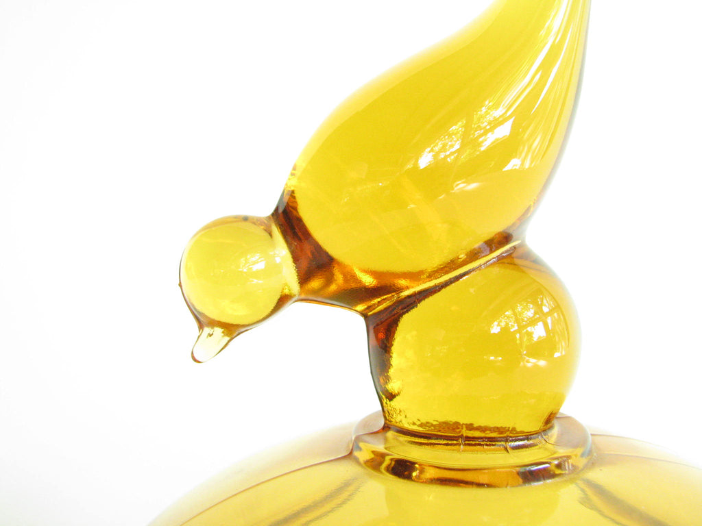 1960s Viking Epic candy box / dish in amber yellow art glass featuring a long-tailed bird. Rare to find one in impeccable shape with unbroken tail.