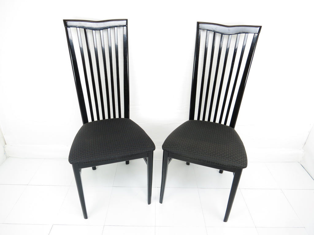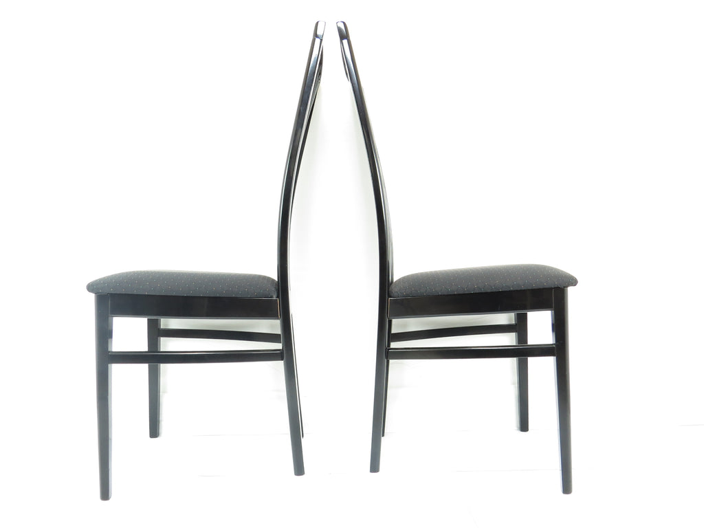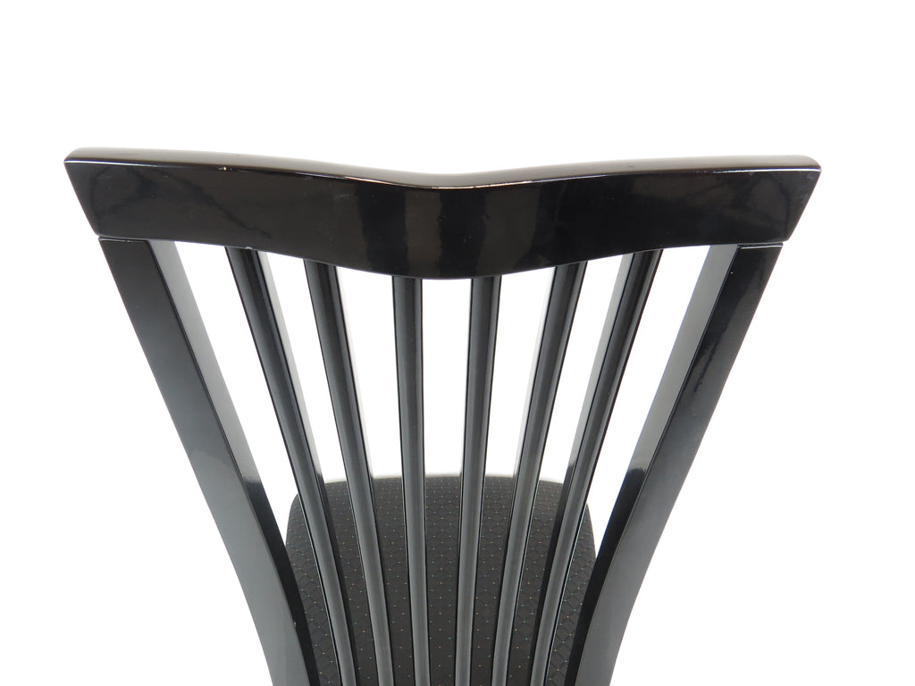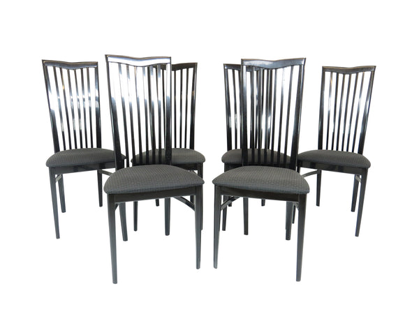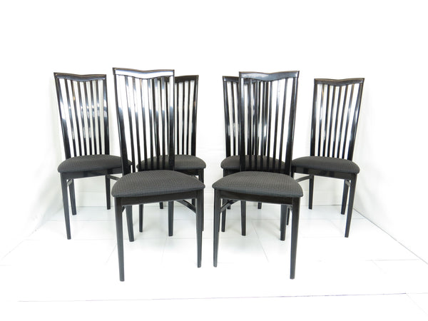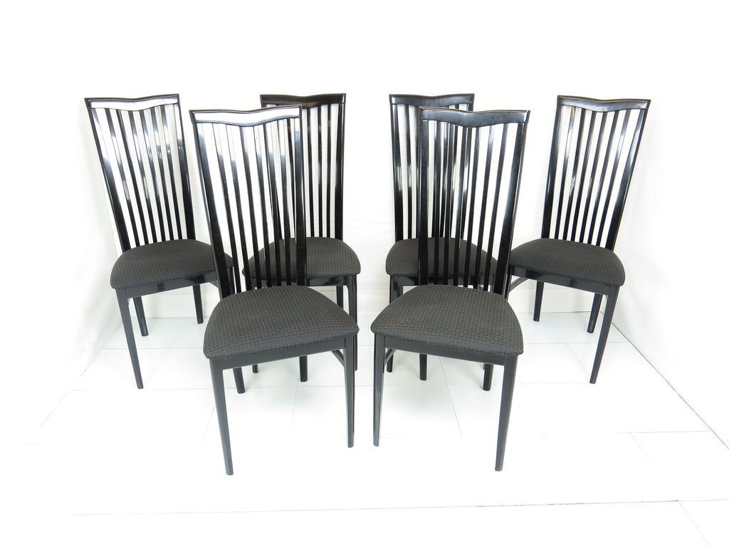 Set of six 1970's Pietro Costantini for Ello black lacquer high back side chairs. Tall slate back ending with a "V" shape crest. Legs have side stretchers for additional support.