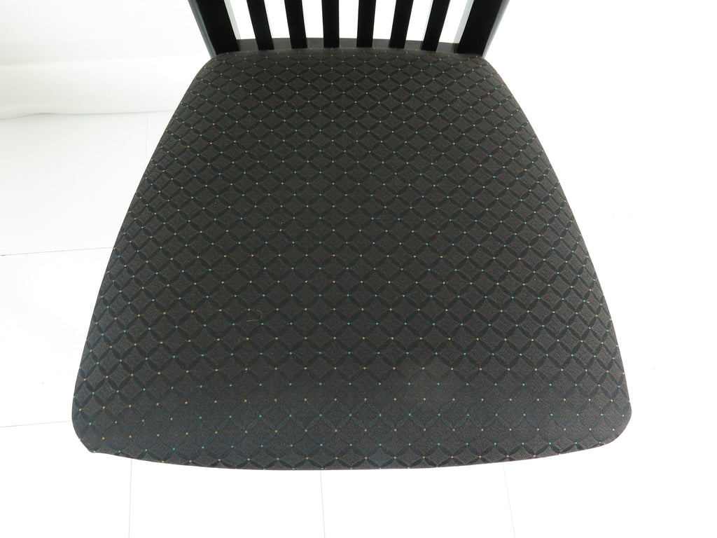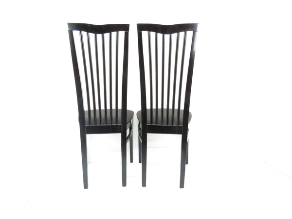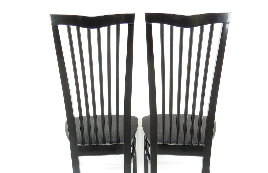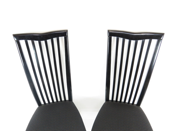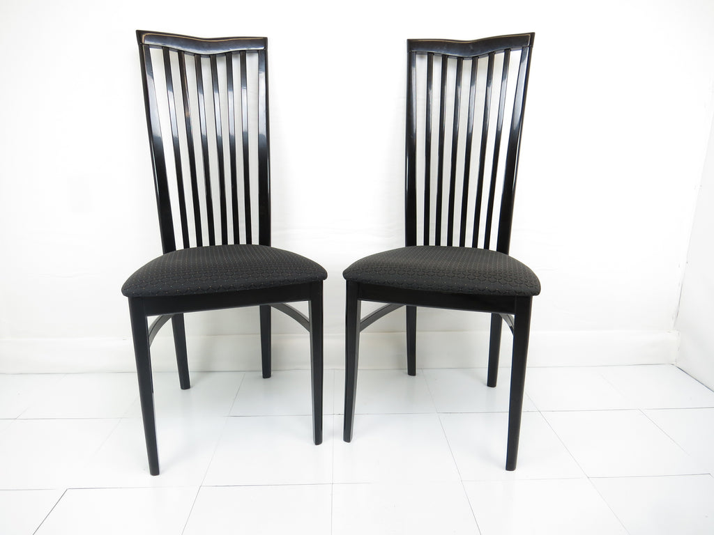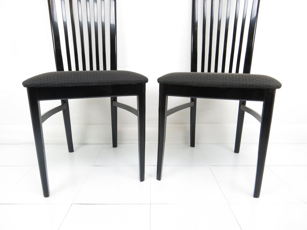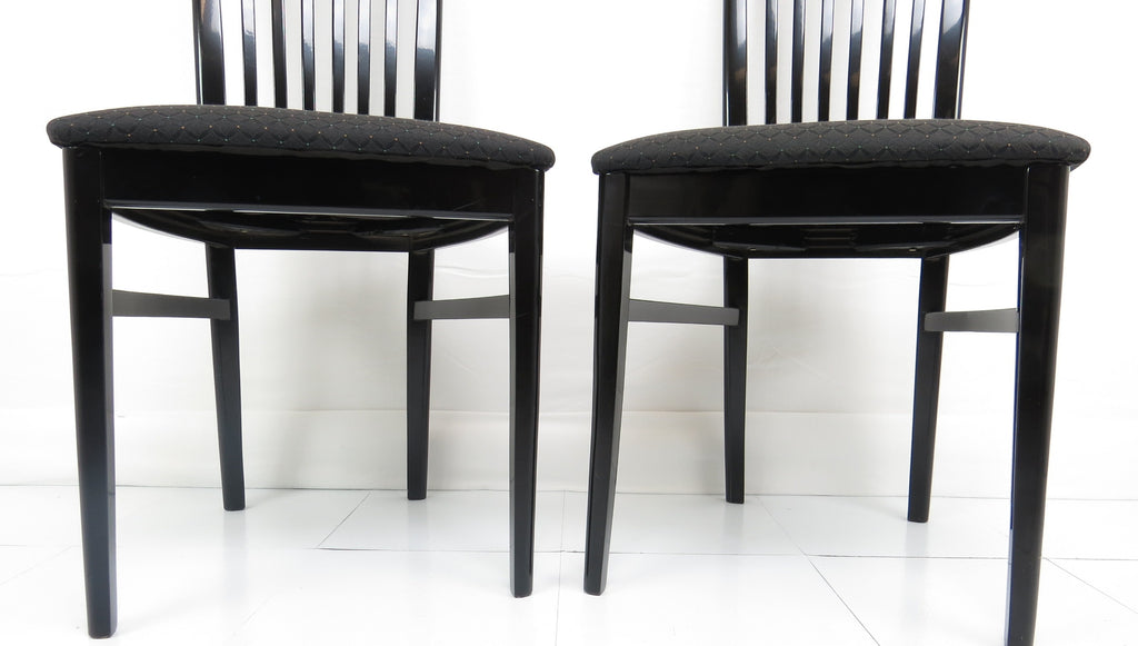 Set of six 1970's Pietro Costantini for Ello black lacquer high back side chairs. Tall slate back ending with a "V" shape crest. Legs have side stretchers for additional support.