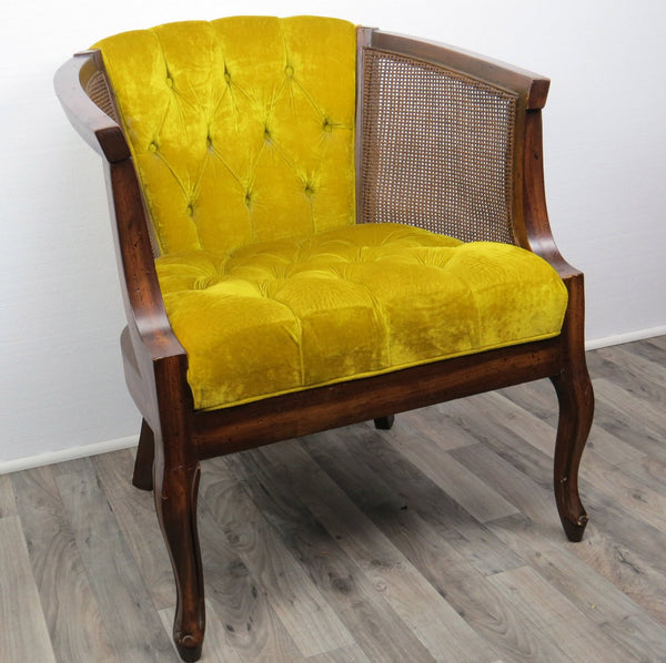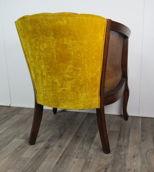 Vintage barrel back French bergere style chair. Solid walnut frame with cane sides and button-tufted chartreuse crushed velvet fabric.