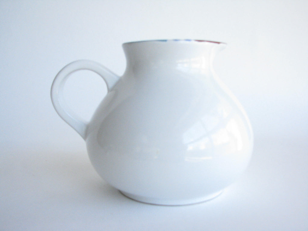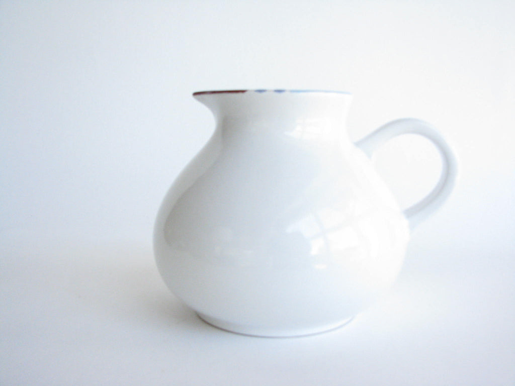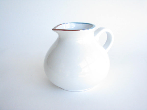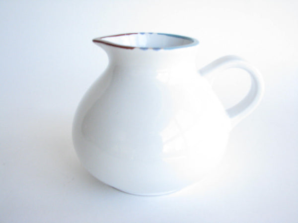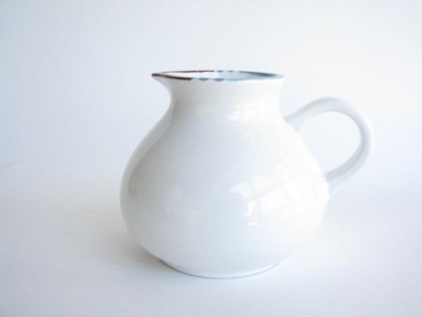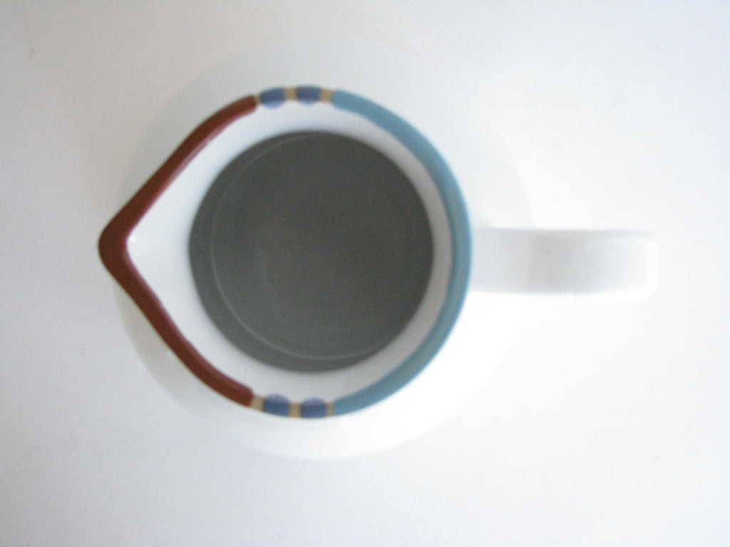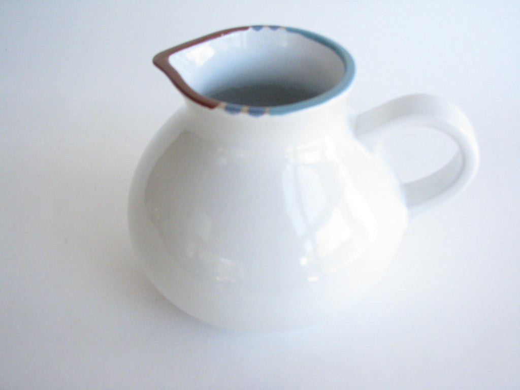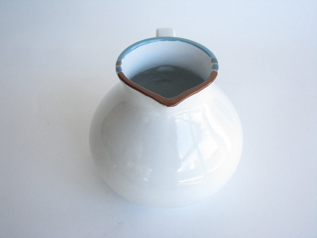 Vintage Dansk Mesa White Sand stoneware pitcher trimmed along rim with a turquoise and rust design. Pitcher holds approximately 48 oz.