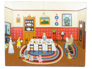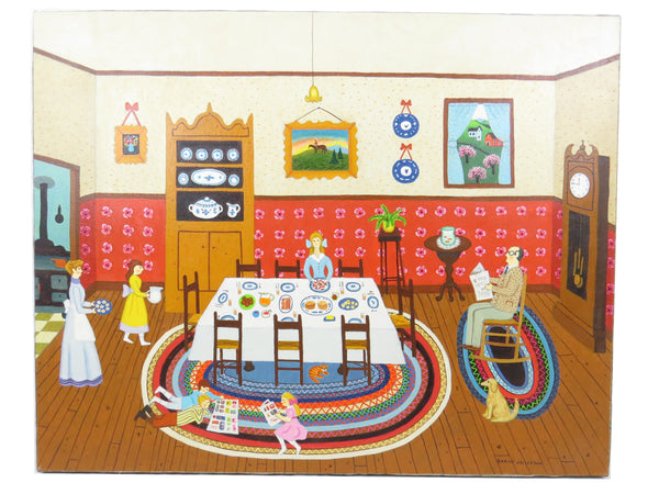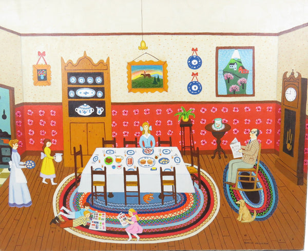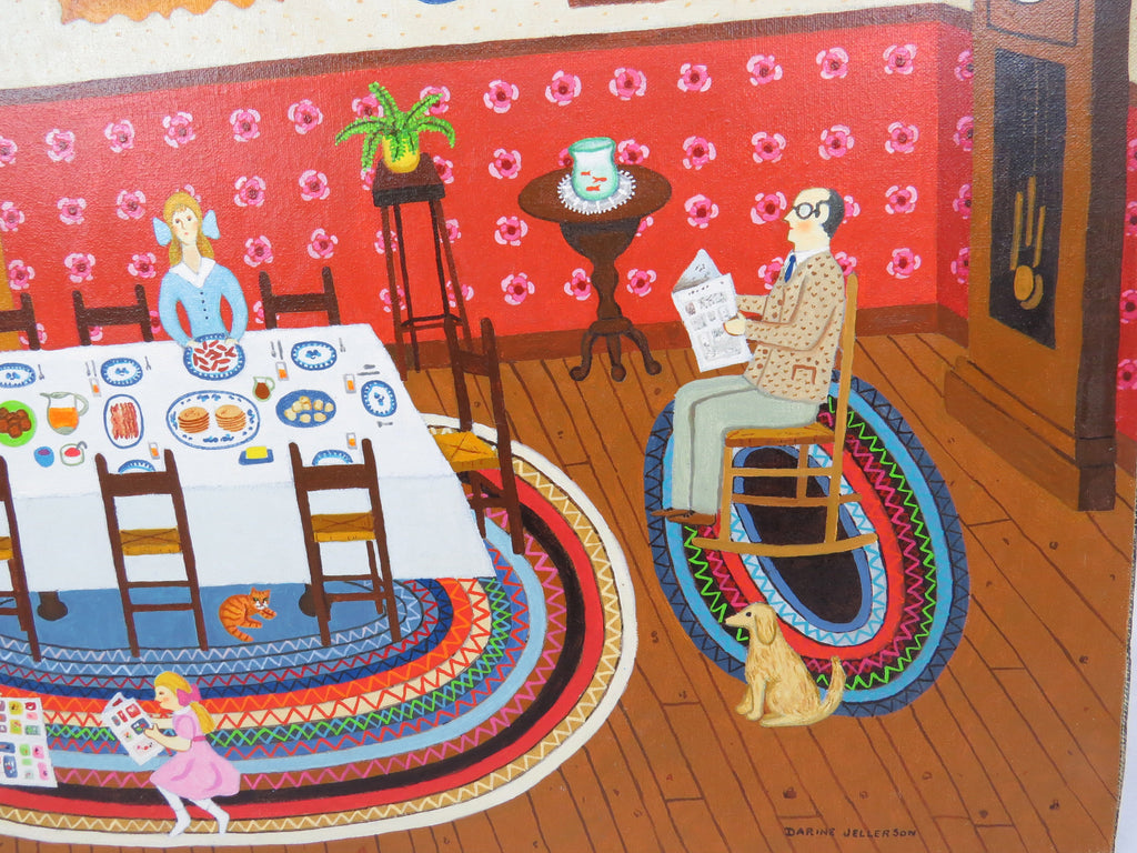 Charming oil on canvas folk art family scene by noted artist Darine Jellerson (1927-2002). Titled "Sunday Breakfast", this painting depicts a warm family scene in bright vibrant colors. This amazing piece shows it all with life in the Victorian era. Period furniture, wall art, rugs, plates, paintings, and house pets. The family is dressed in traditional Sunday cothes, Victorian style. Signed lower right, titled on verso.