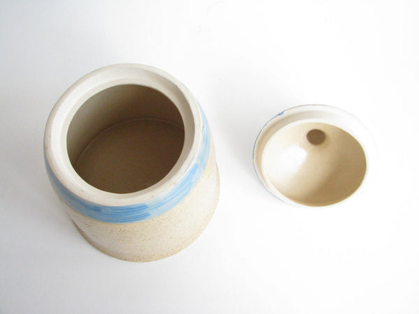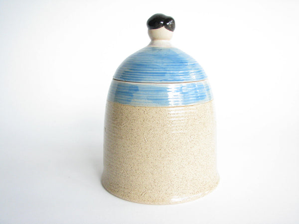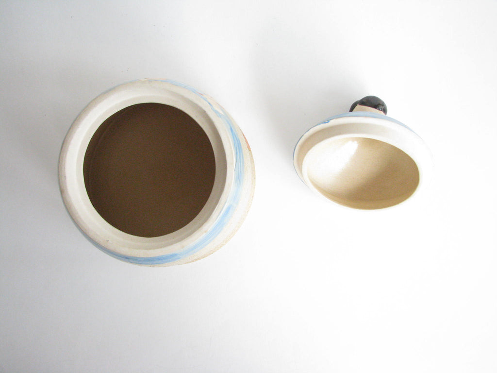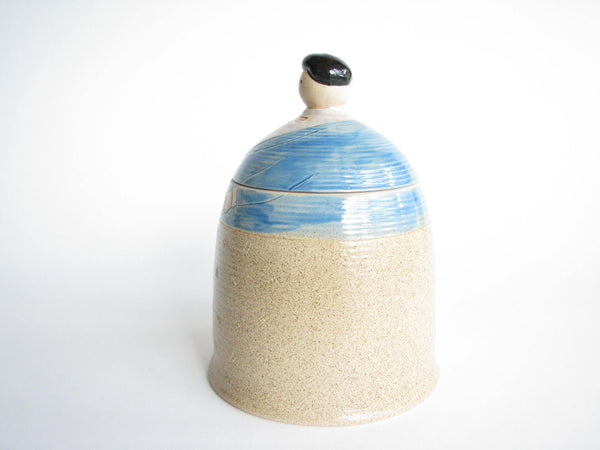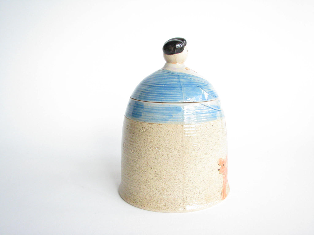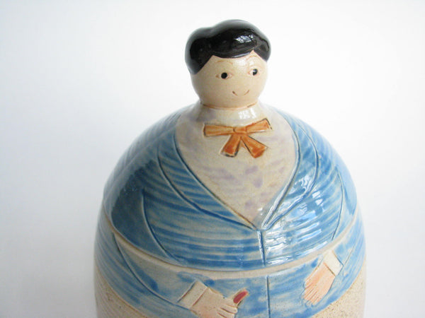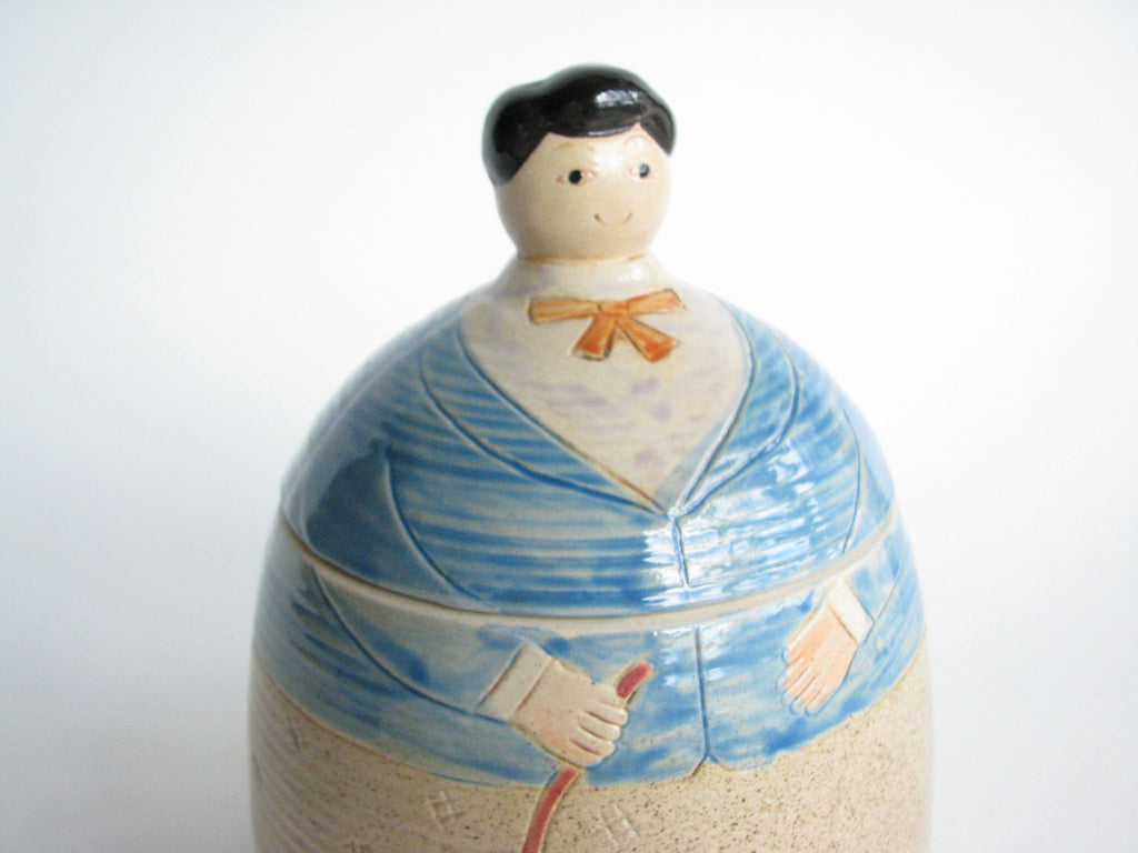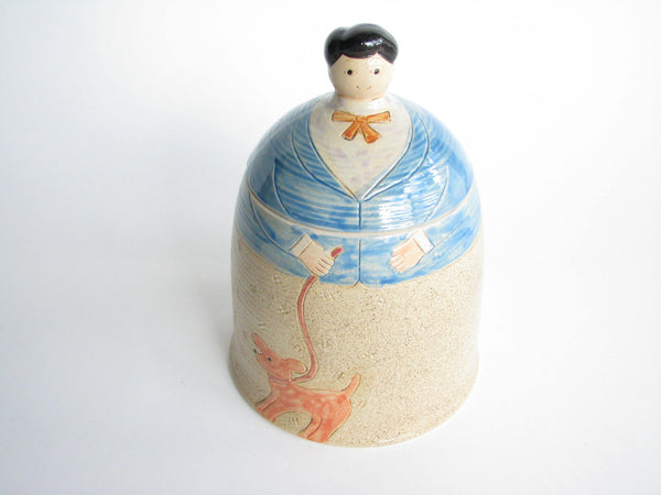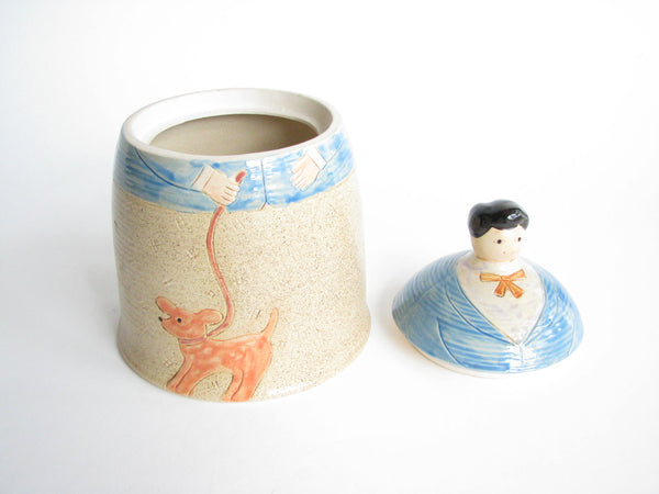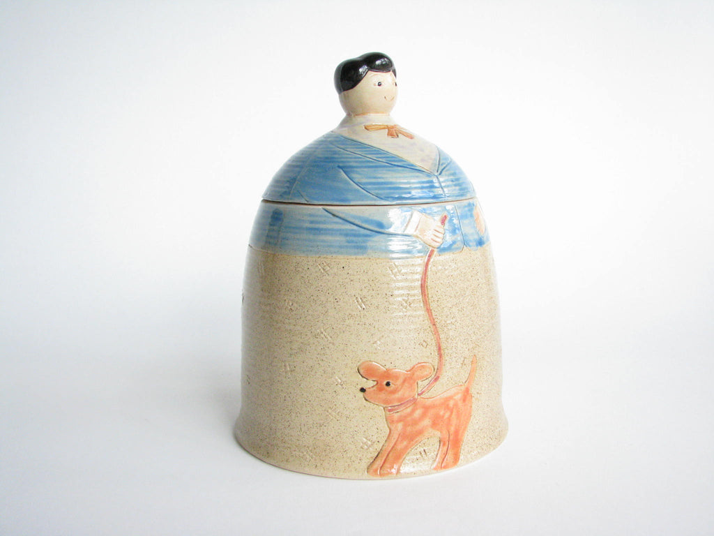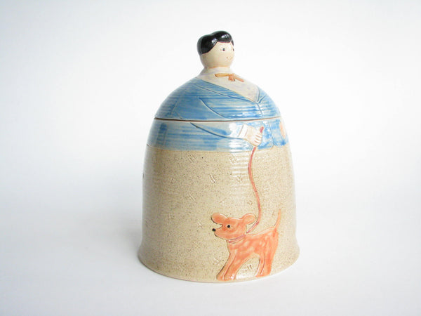 Vintage whimsical Folk Art lidded pottery jar / canister featuring a woman and dog by Shafford.