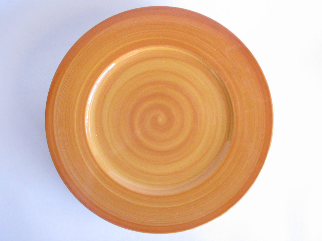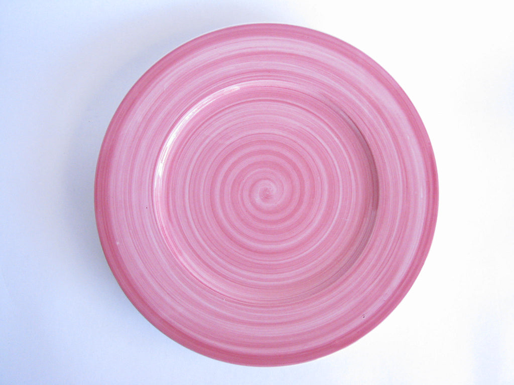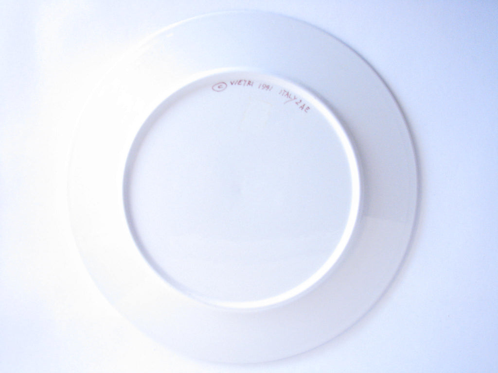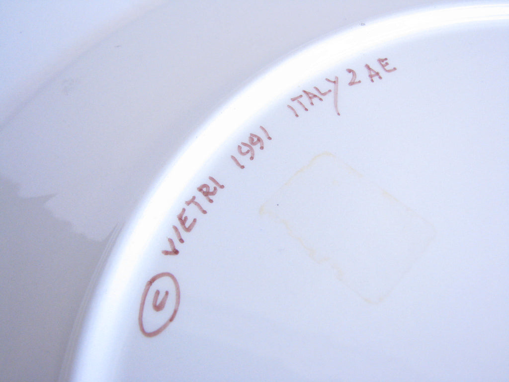 Set of 4 Vietri ceramic chargers in orange, pink, green, and blue. Perfect mix and match set. Made in Italy. Marked 'Vietri 1991 Made in Italy 2AE'.