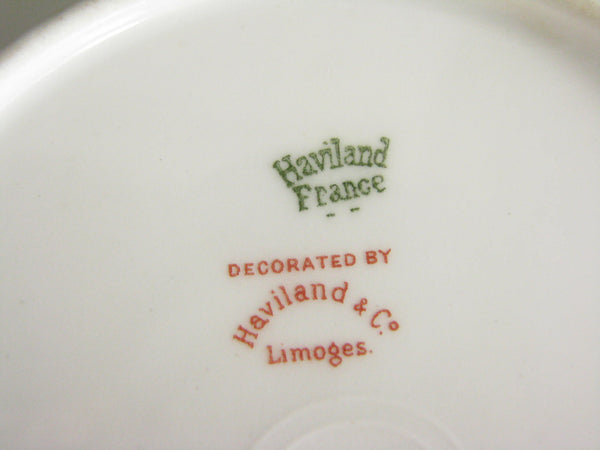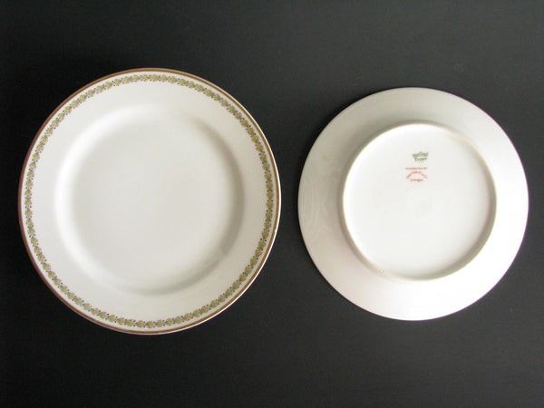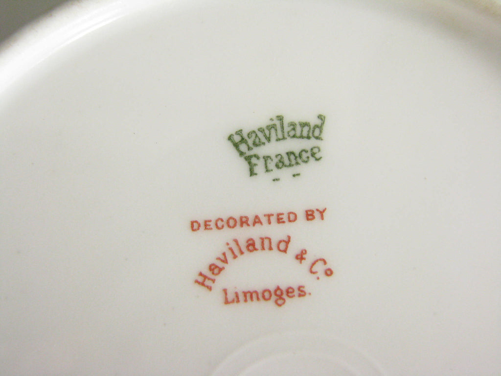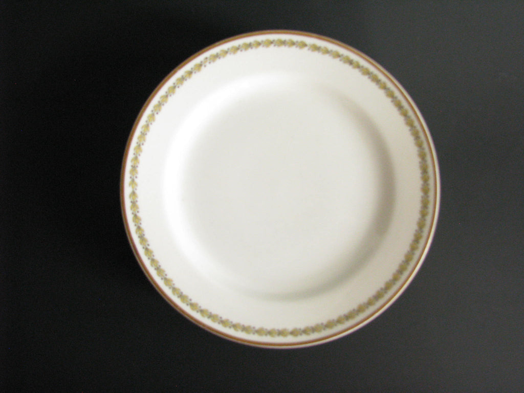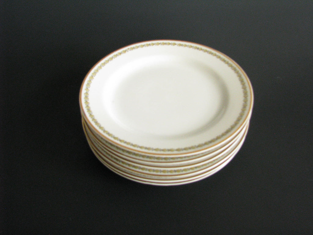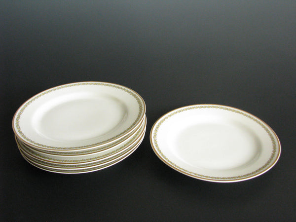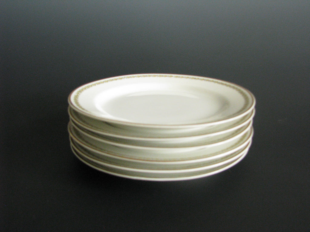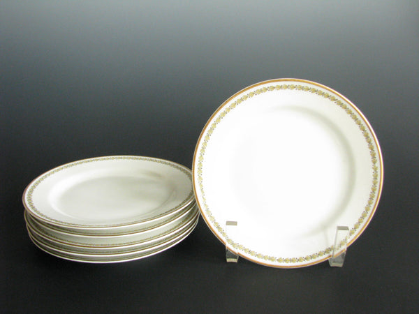 Antique set of 6 Haviland Limoges porcelain bread plates with yellow laurel leaves and gold trim. Marks date these from 1894-1931.