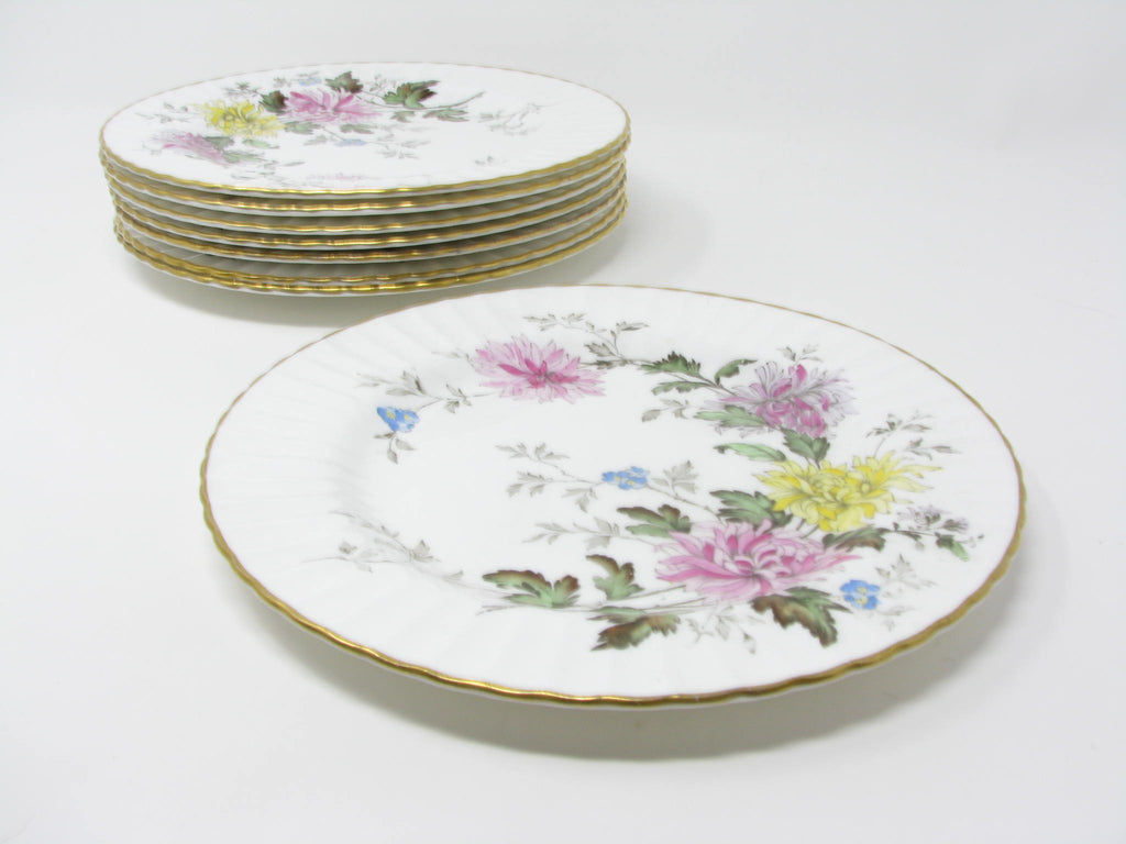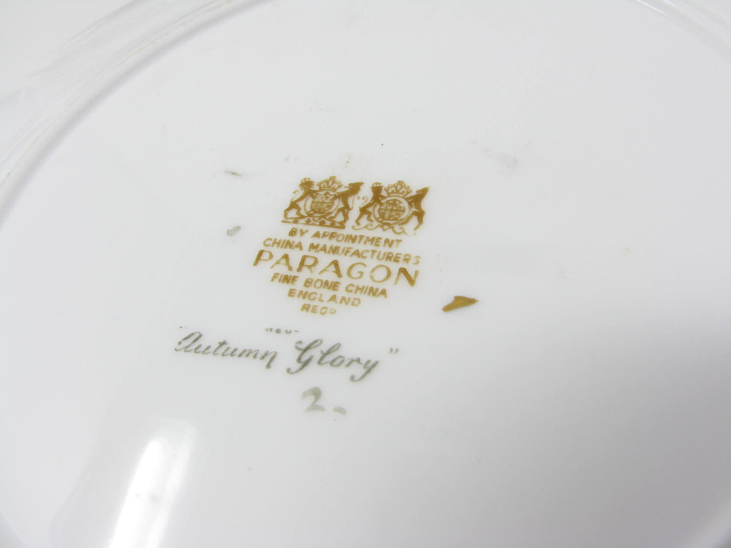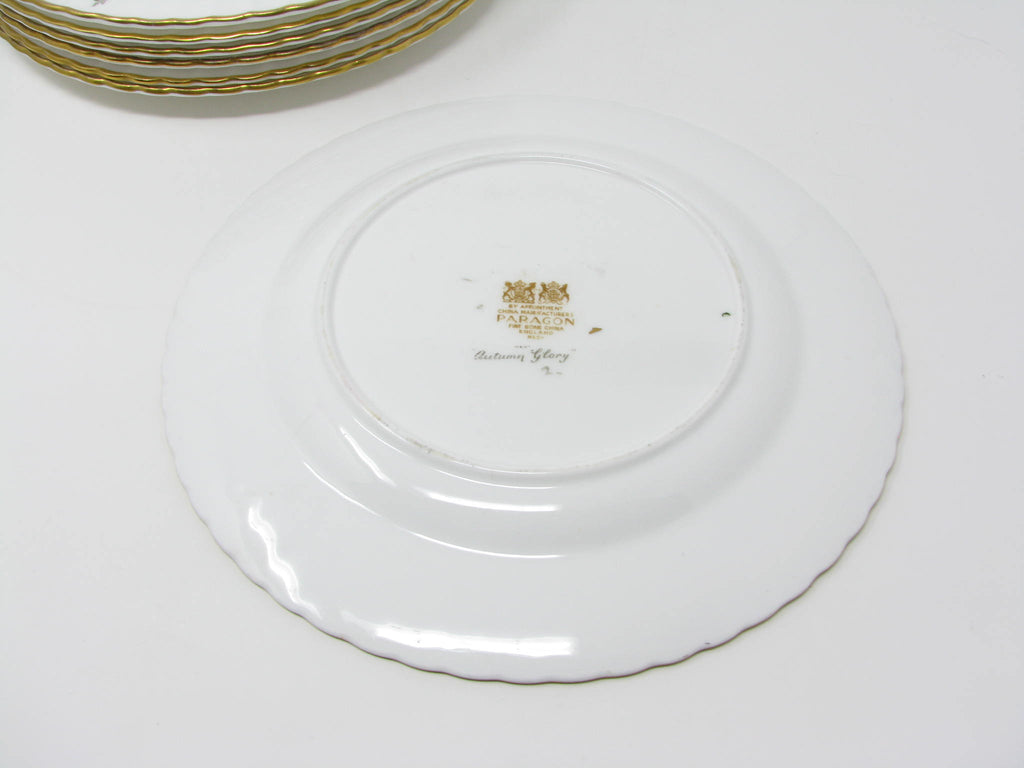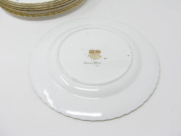 Vintage set of 8 Paragon Autumn Glory fine bone china salad plates with floral design, fluted rim, and gold trim.