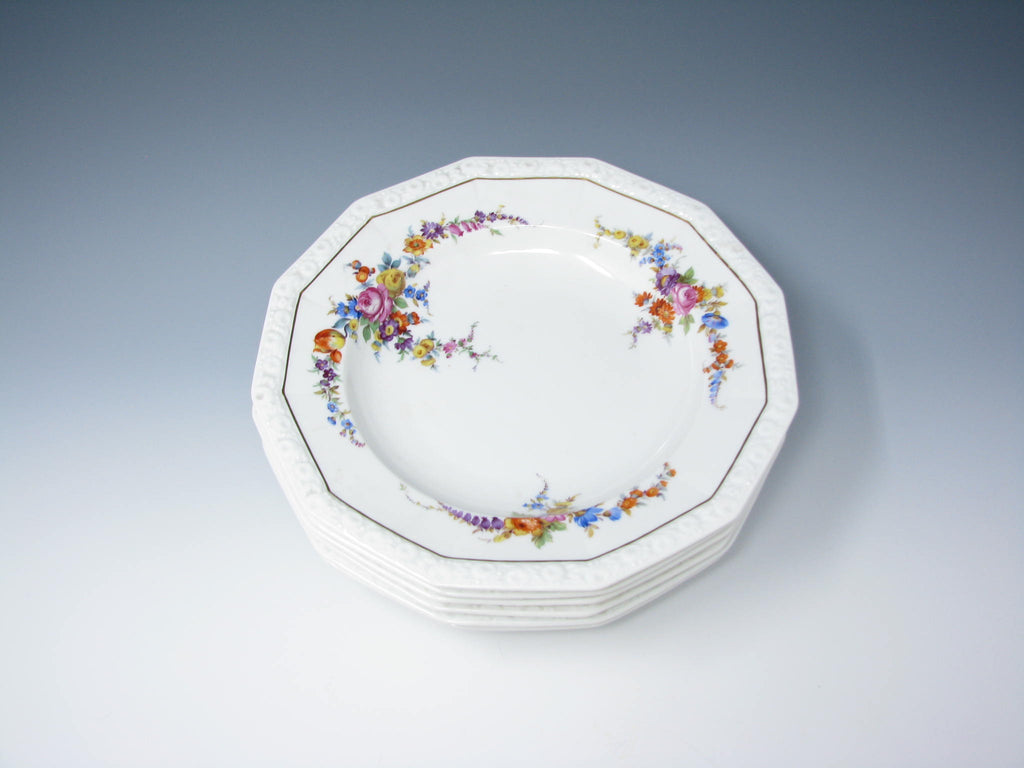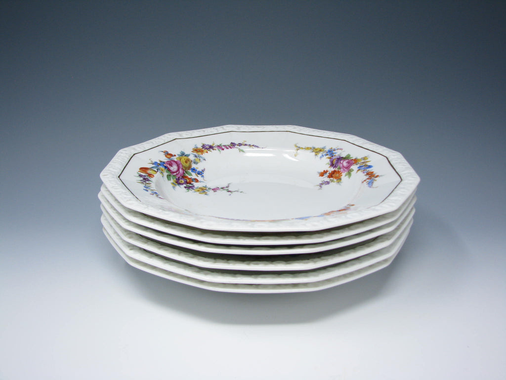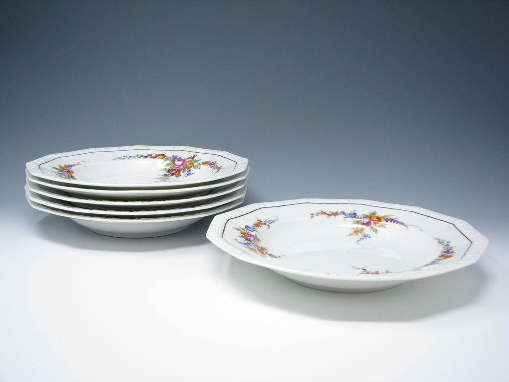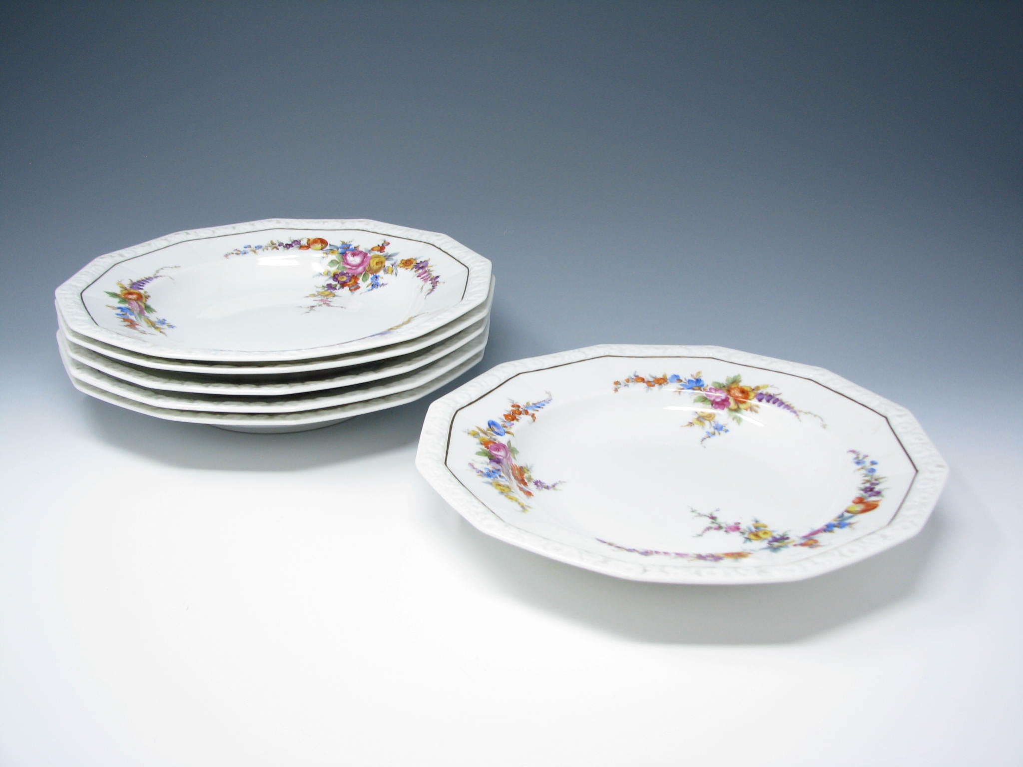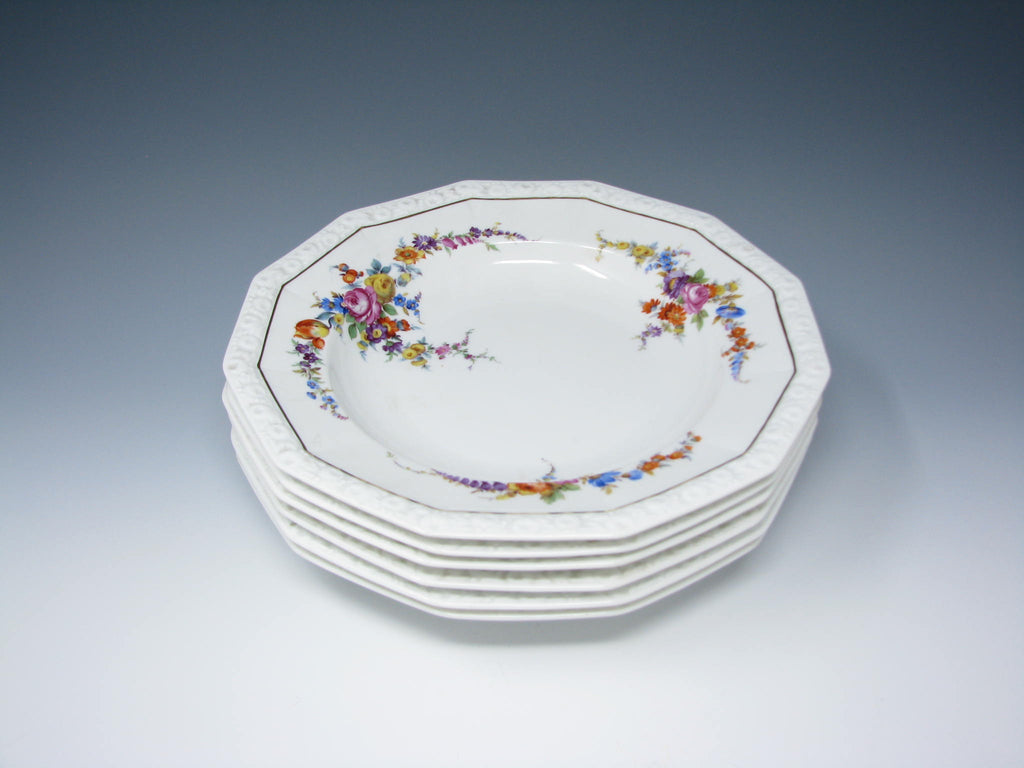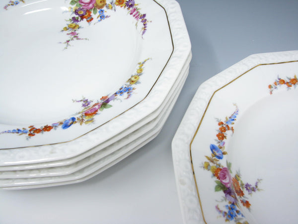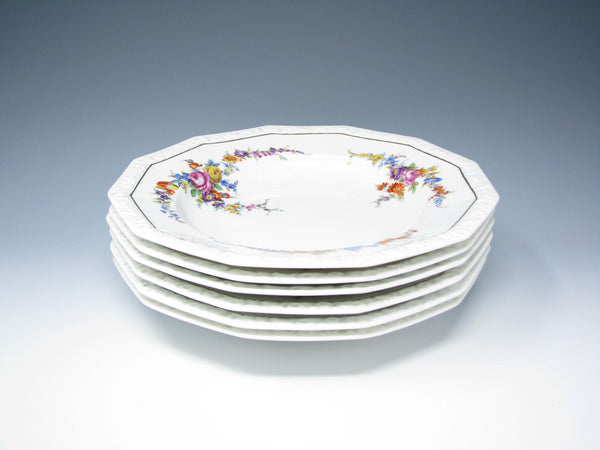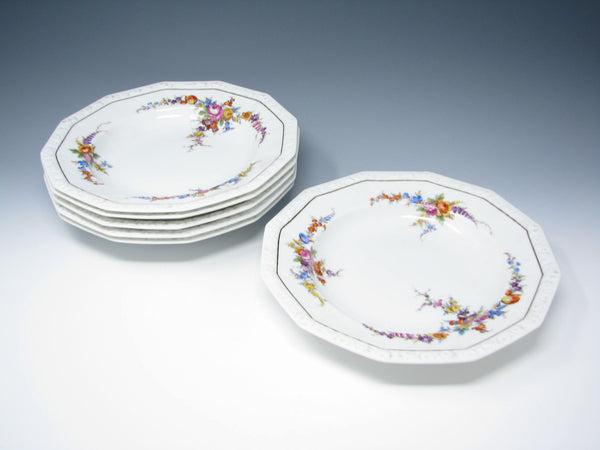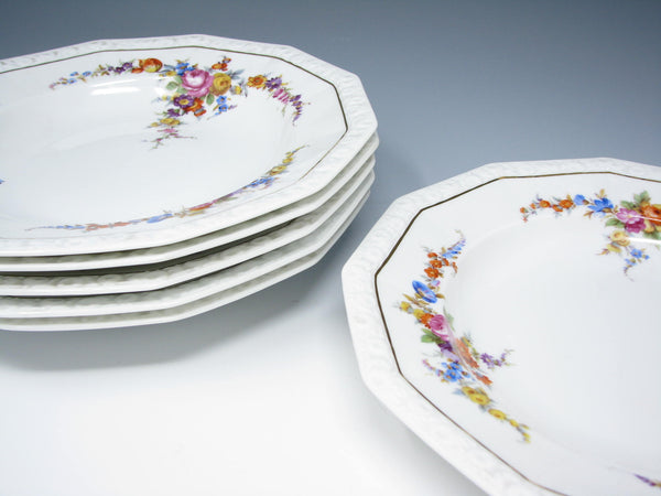 Antique set of 6 Rosenthal Samara large octagon rimmed bowls with hand-painted floral pattern and embossed floral rim. Designed by founder Philipp Rosenthal in the 1920s.