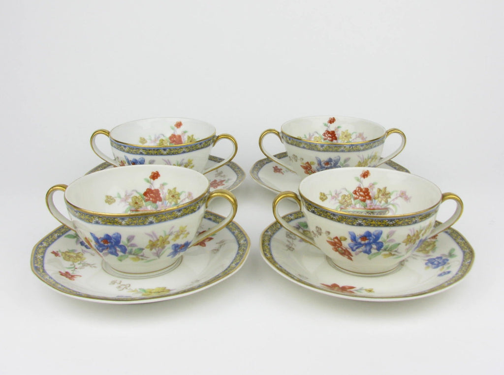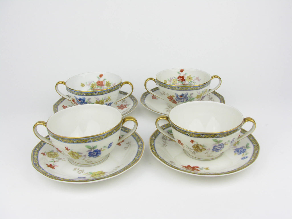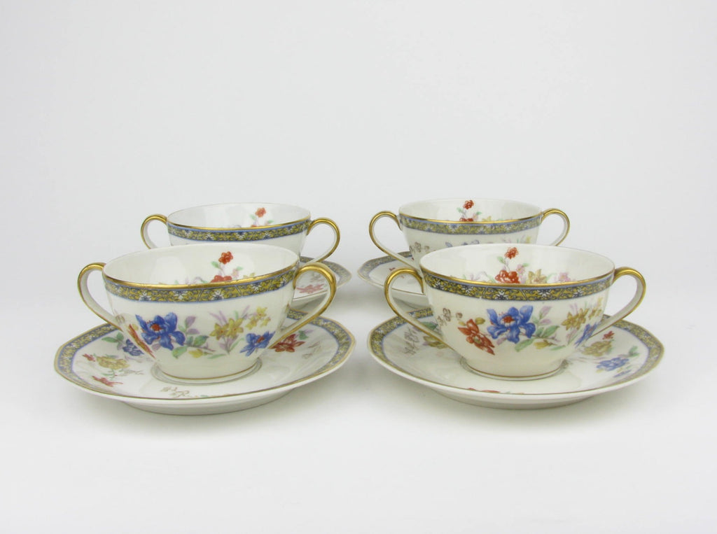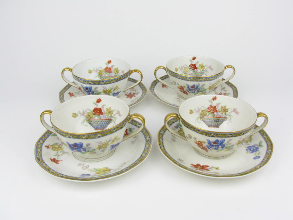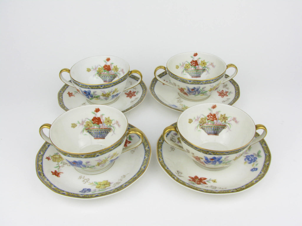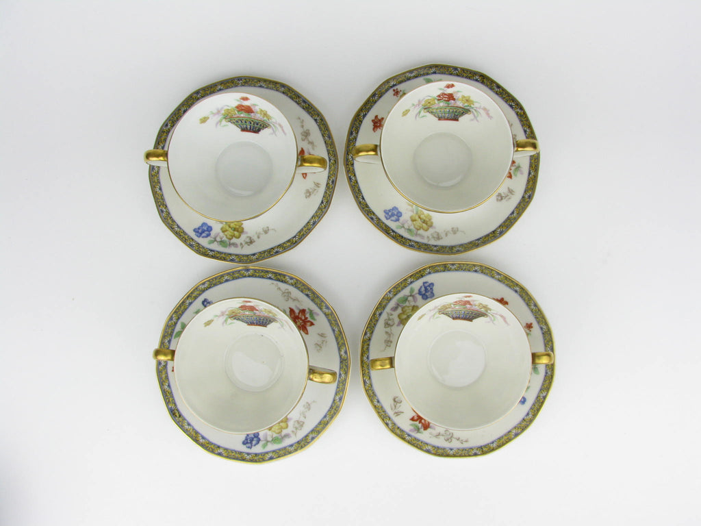 Antique Theodore Haviland Ganga double-handled bouillon soup cups and saucers with beautiful and intricate floral and basket design. Set includes 4 soup cups and 4 saucers. Marks on underside date these plates 1920-1936.