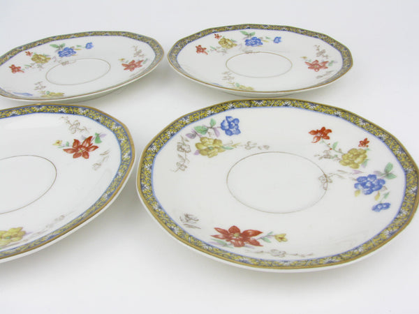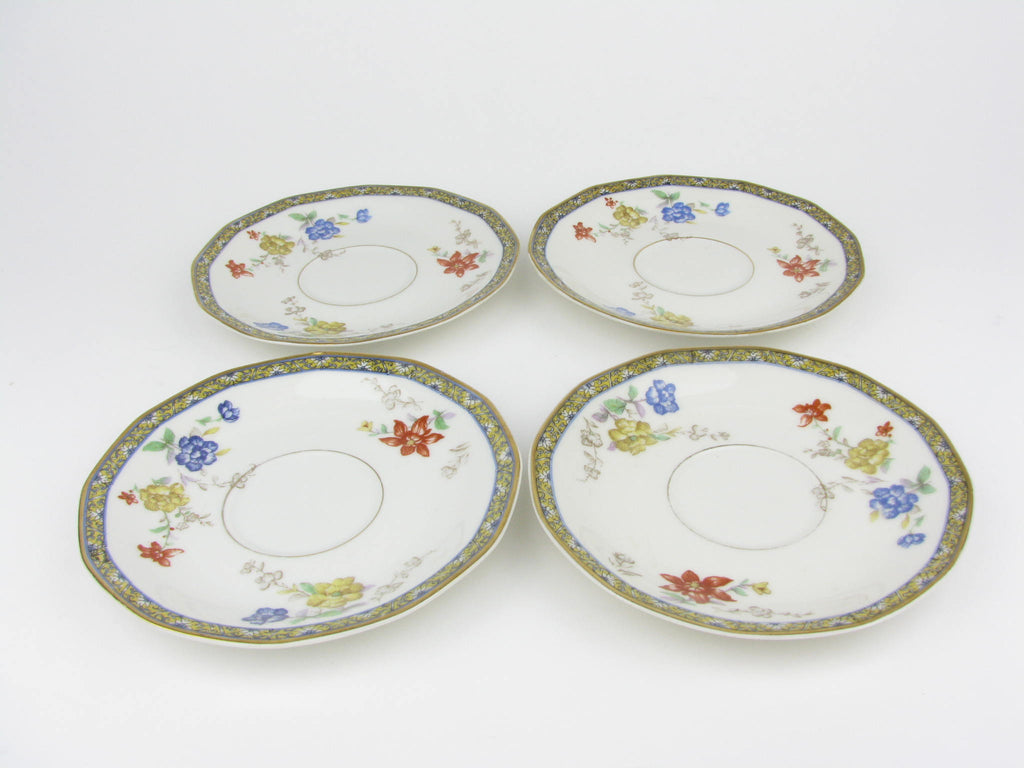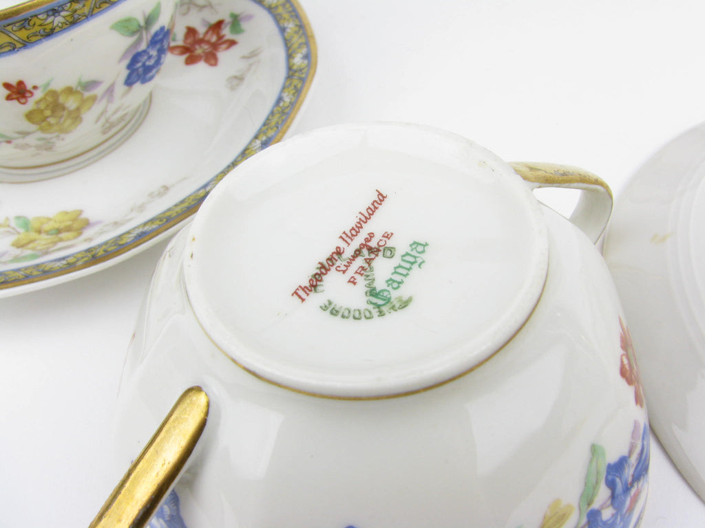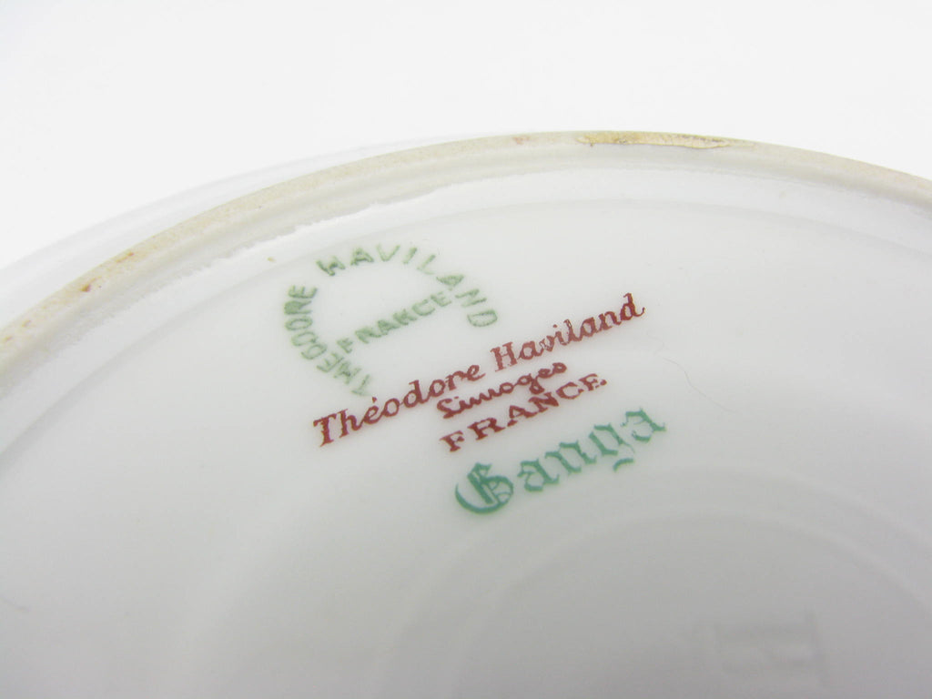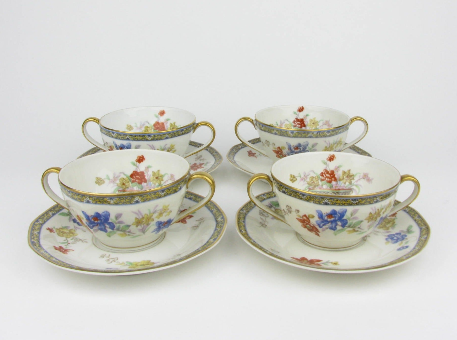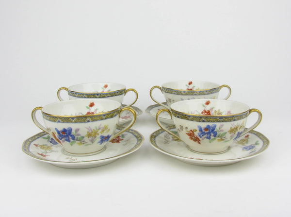 Antique Theodore Haviland Ganga double-handled bouillon soup cups and saucers with beautiful and intricate floral and basket design. Set includes 4 soup cups and 4 saucers. Marks on underside date these plates 1920-1936.