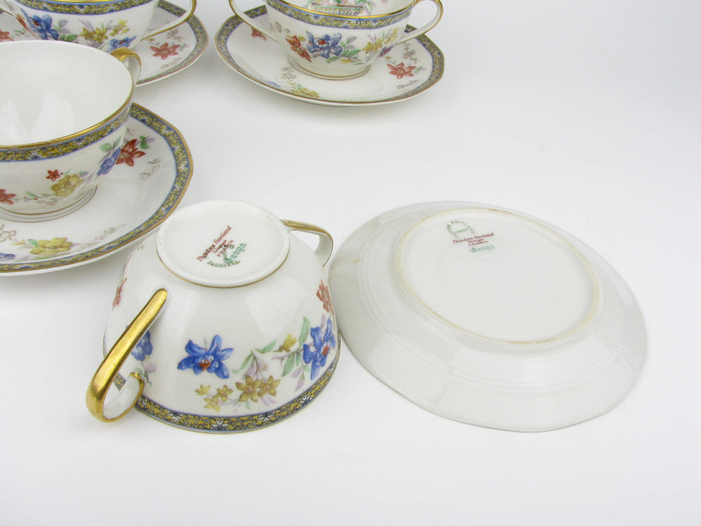 Antique Theodore Haviland Ganga Floral Basket Porcelain Bouillon Soup Cups & Saucers - 8 Pieces