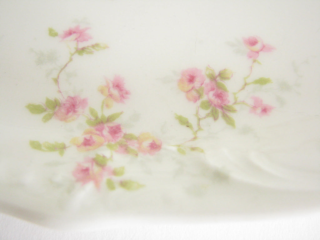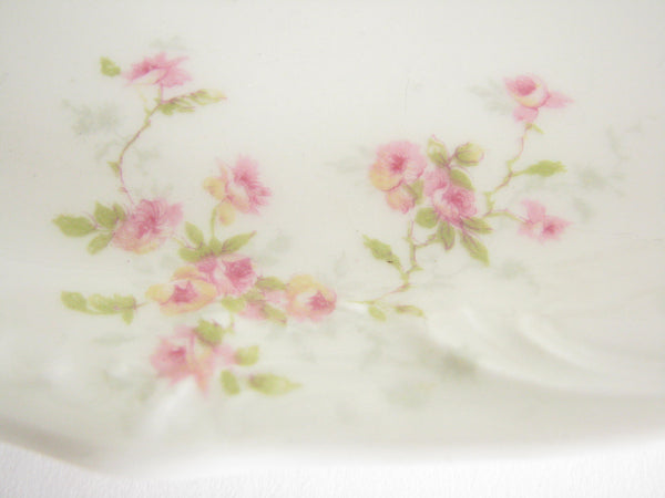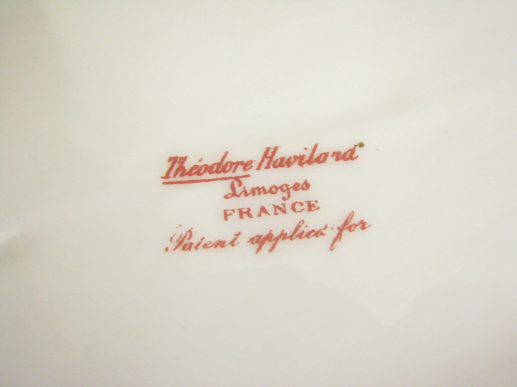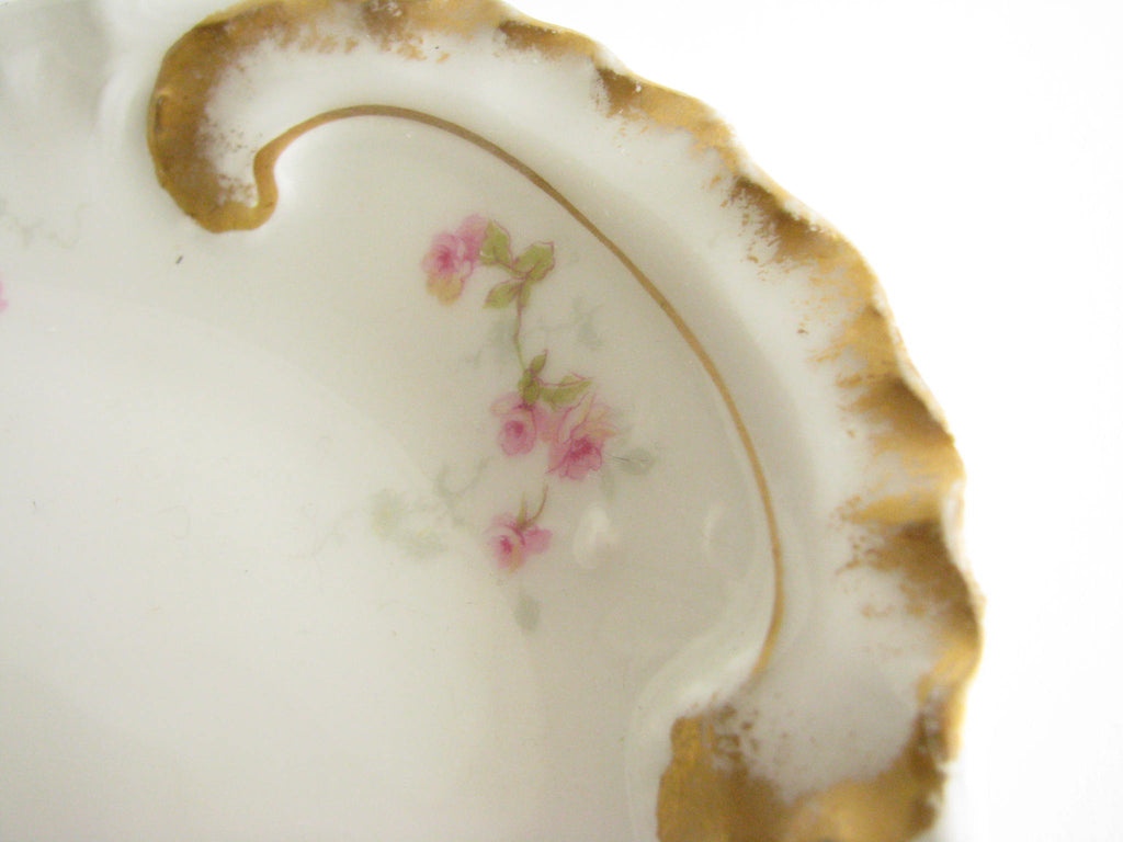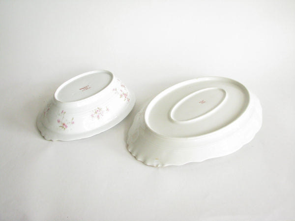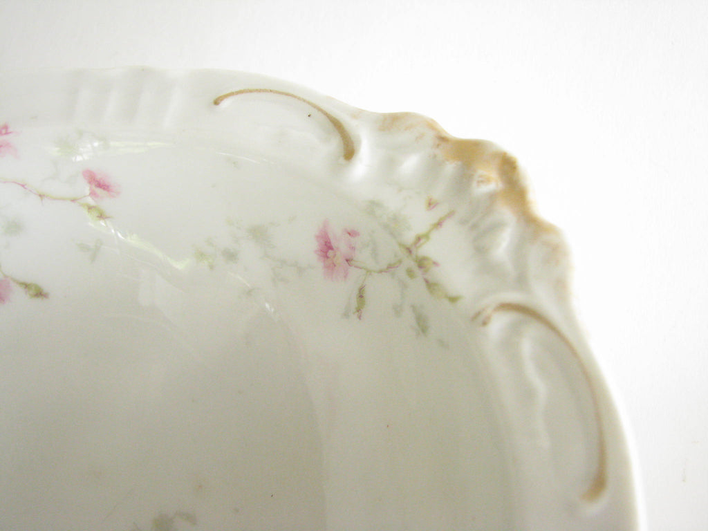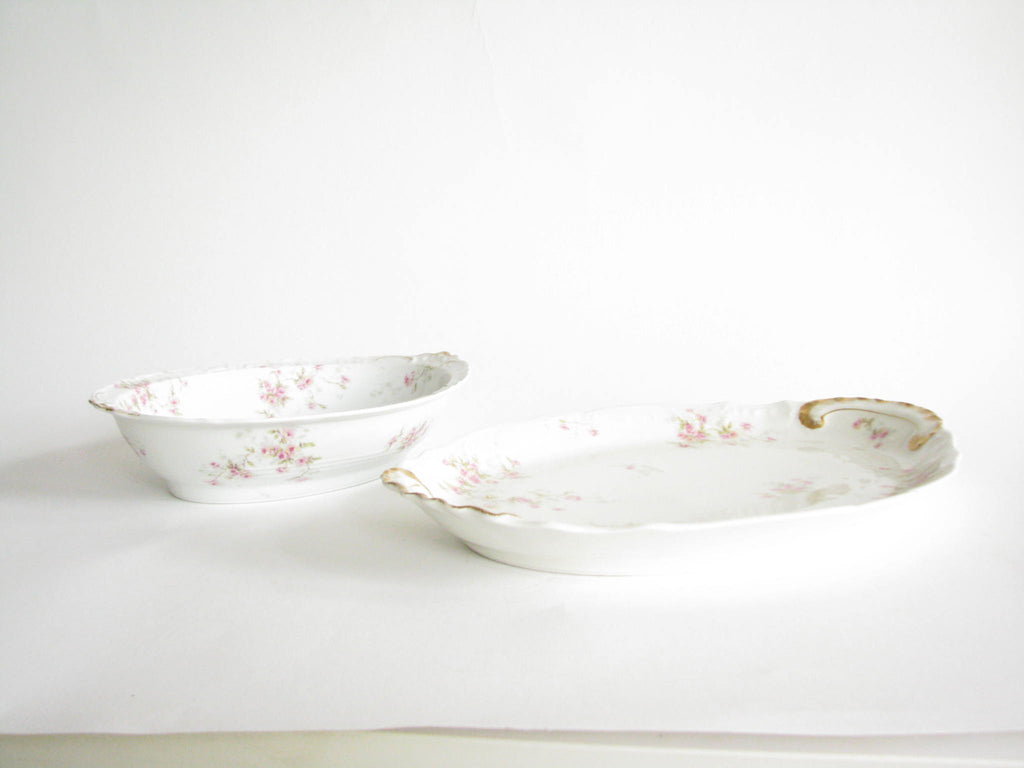 Antique Theodore Haviland Limoges platter and serving bowl with scalloped edge. Hand-painted with green and pink floral design. Based on backstamp these were made approximately 1903.